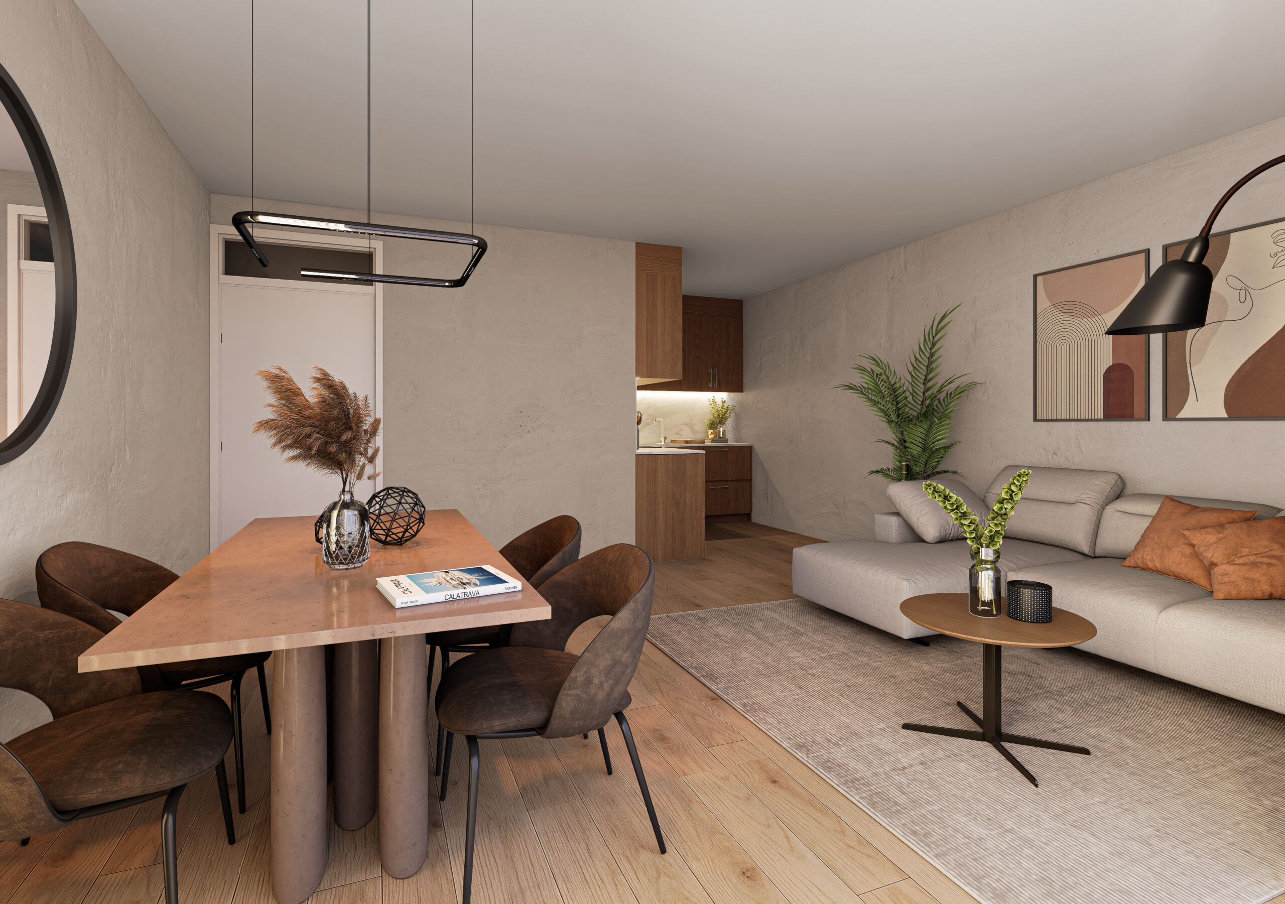 Entree met (separaat) toilet, woonkamer, bijkeuken, één of twee slaapkamers, badkamer en een eigen balkon of tuin bij de appartementen op de begane grond.