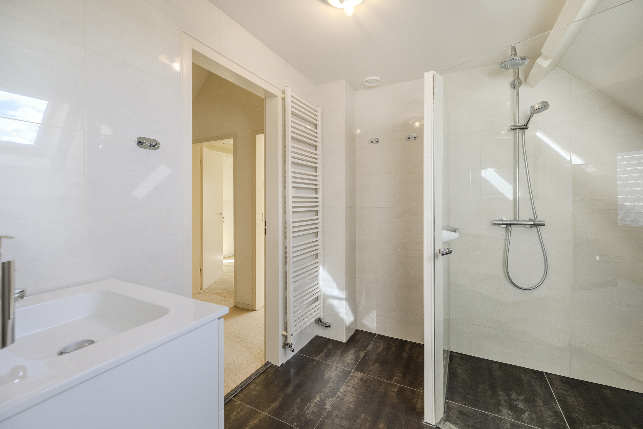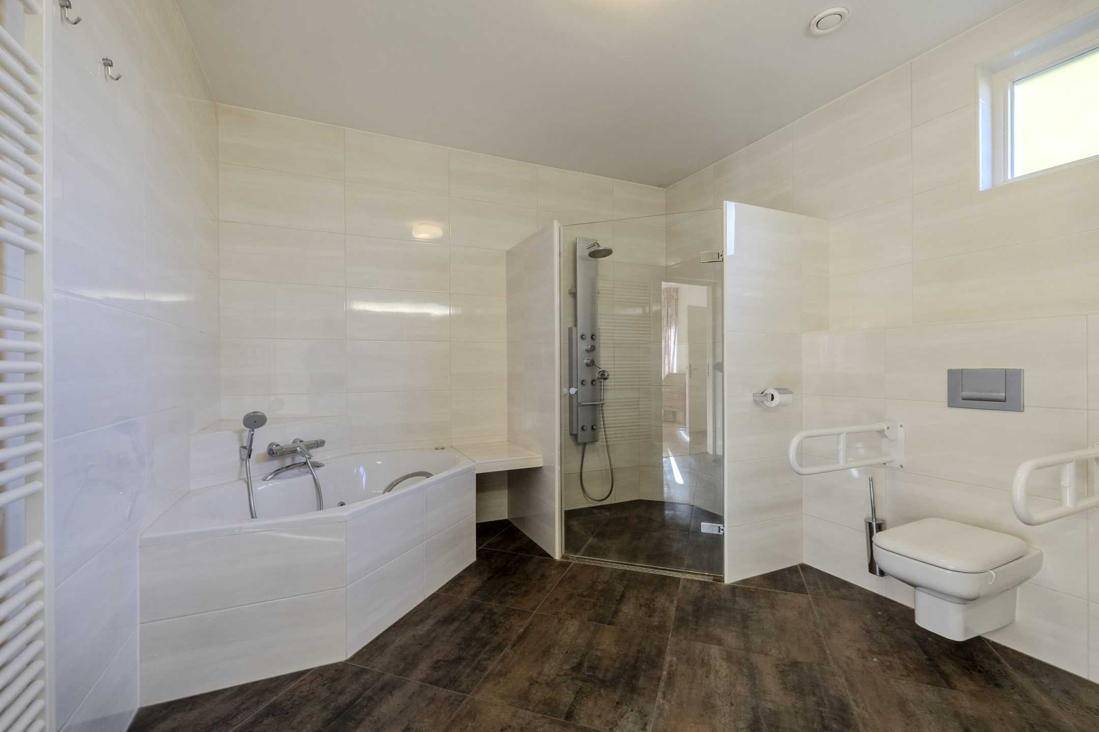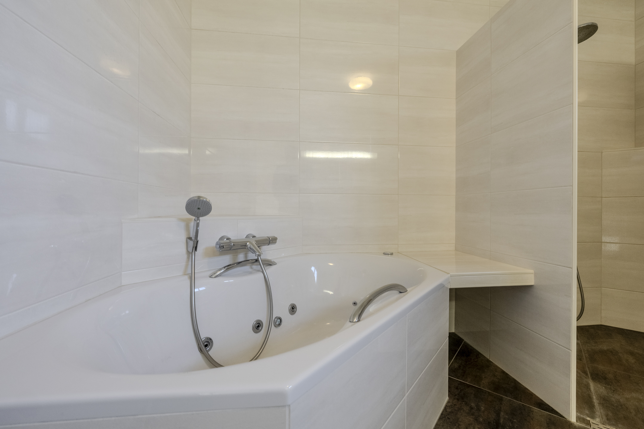 Vanuit de hal/achterom toegang tot de bijkeuken met witgoedaansluitingen grote slaapkamer (ca. 30 m²) met directe verbinding naar de luxe badkamer, uitgerust met dubbele wastafel, inloopdouche en whirlpool.