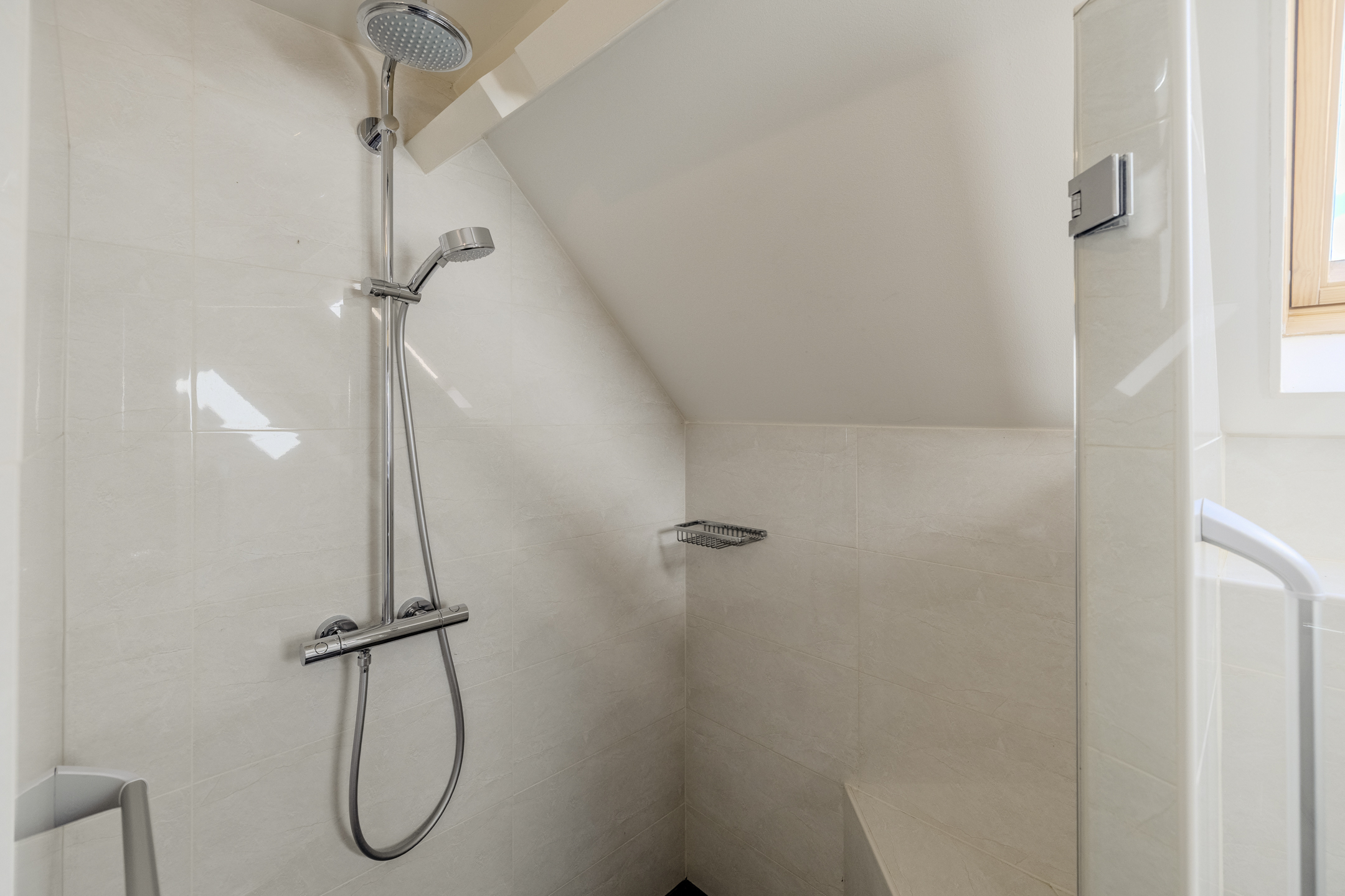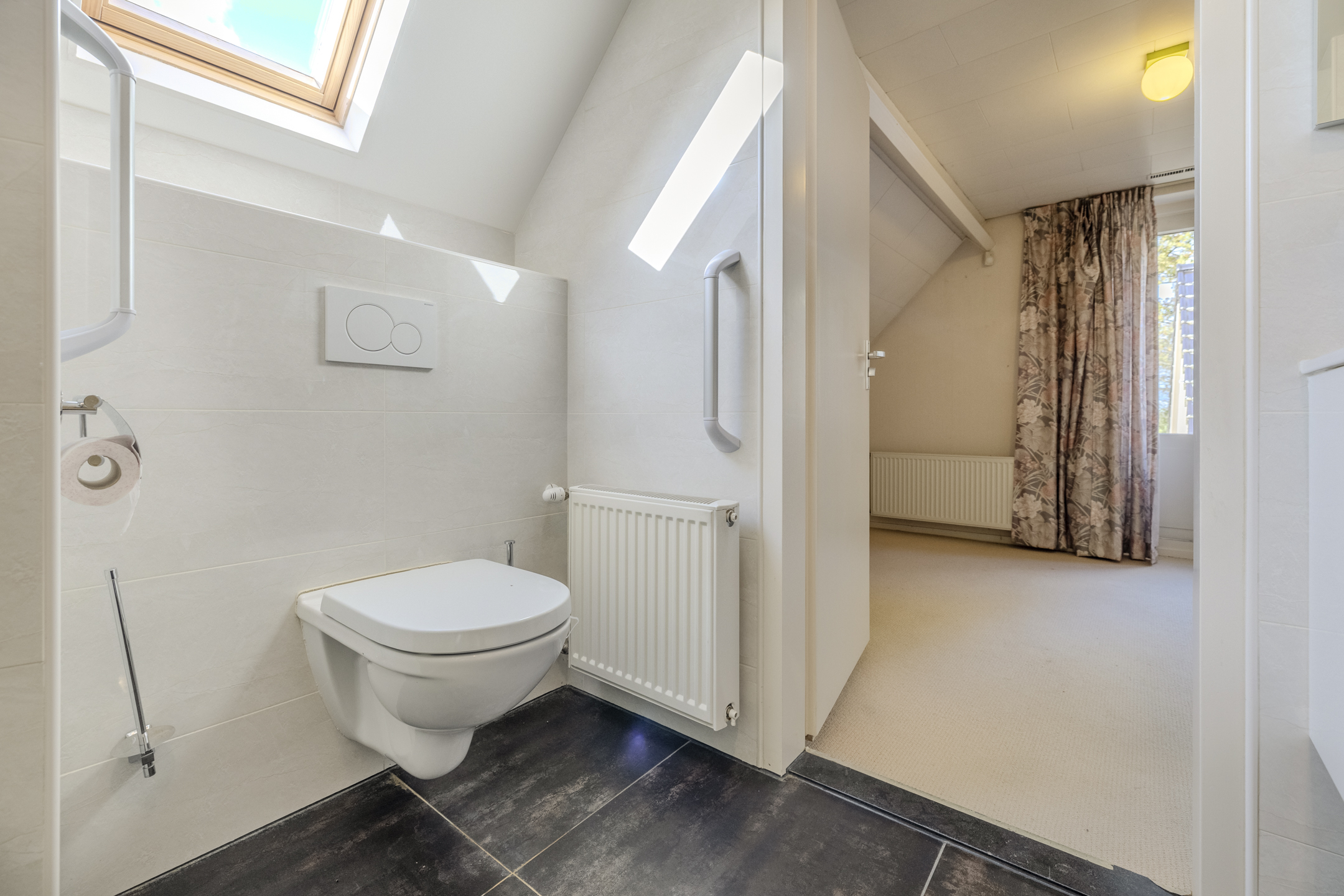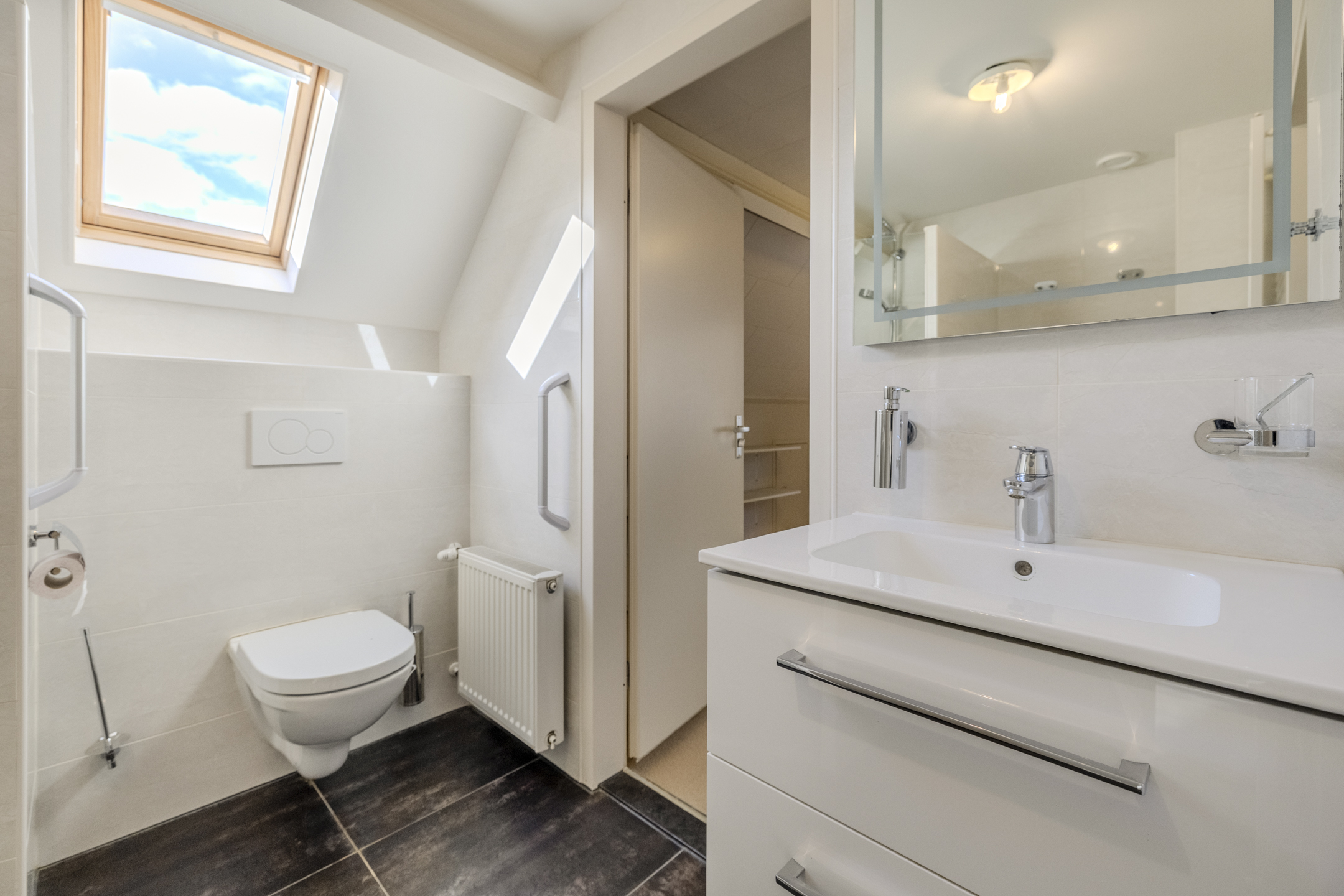 Overloop met vier slaapkamers en een tweede badkamer voorzien van toilet, wastafelmeubel en inloopdouche.