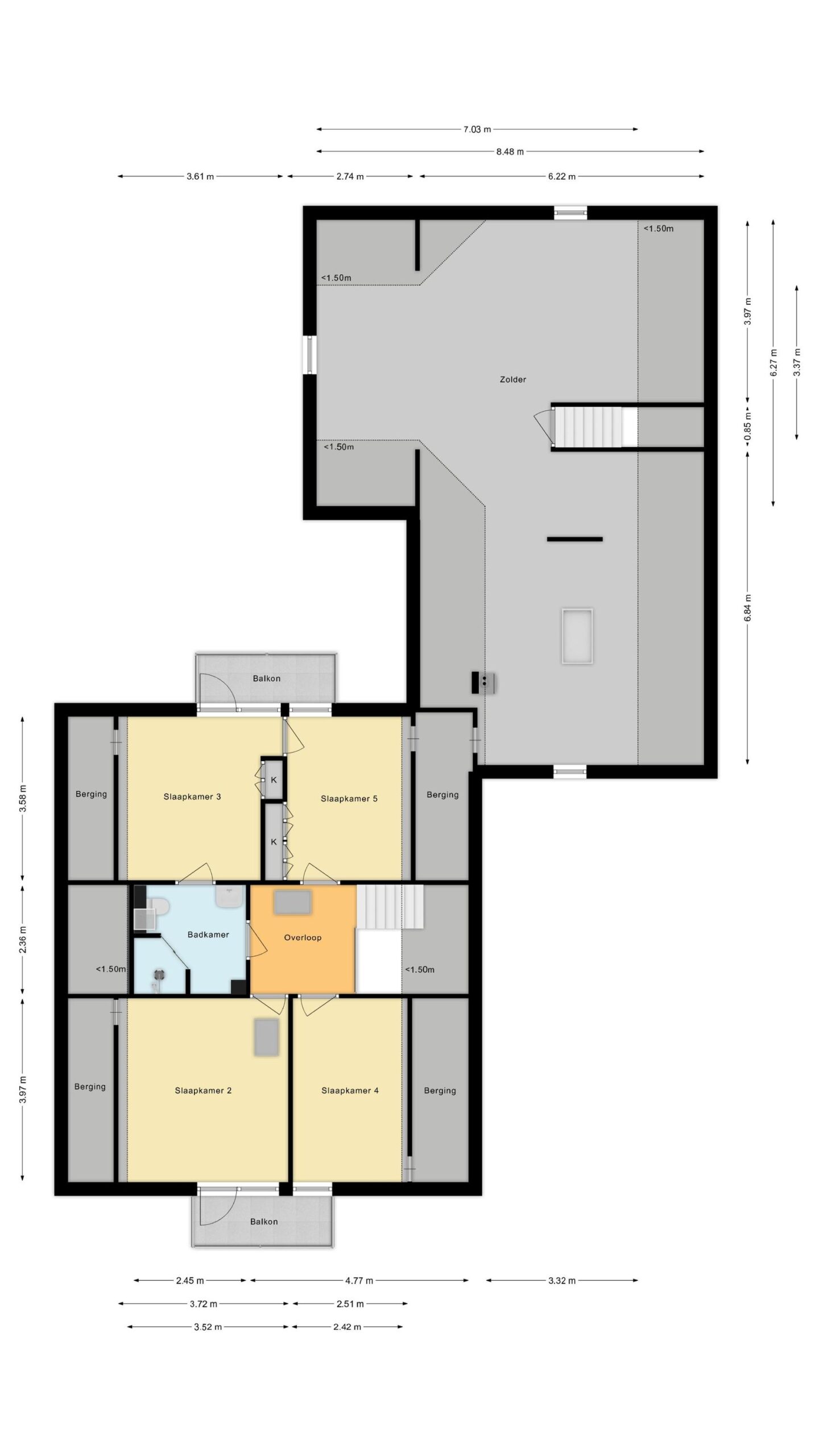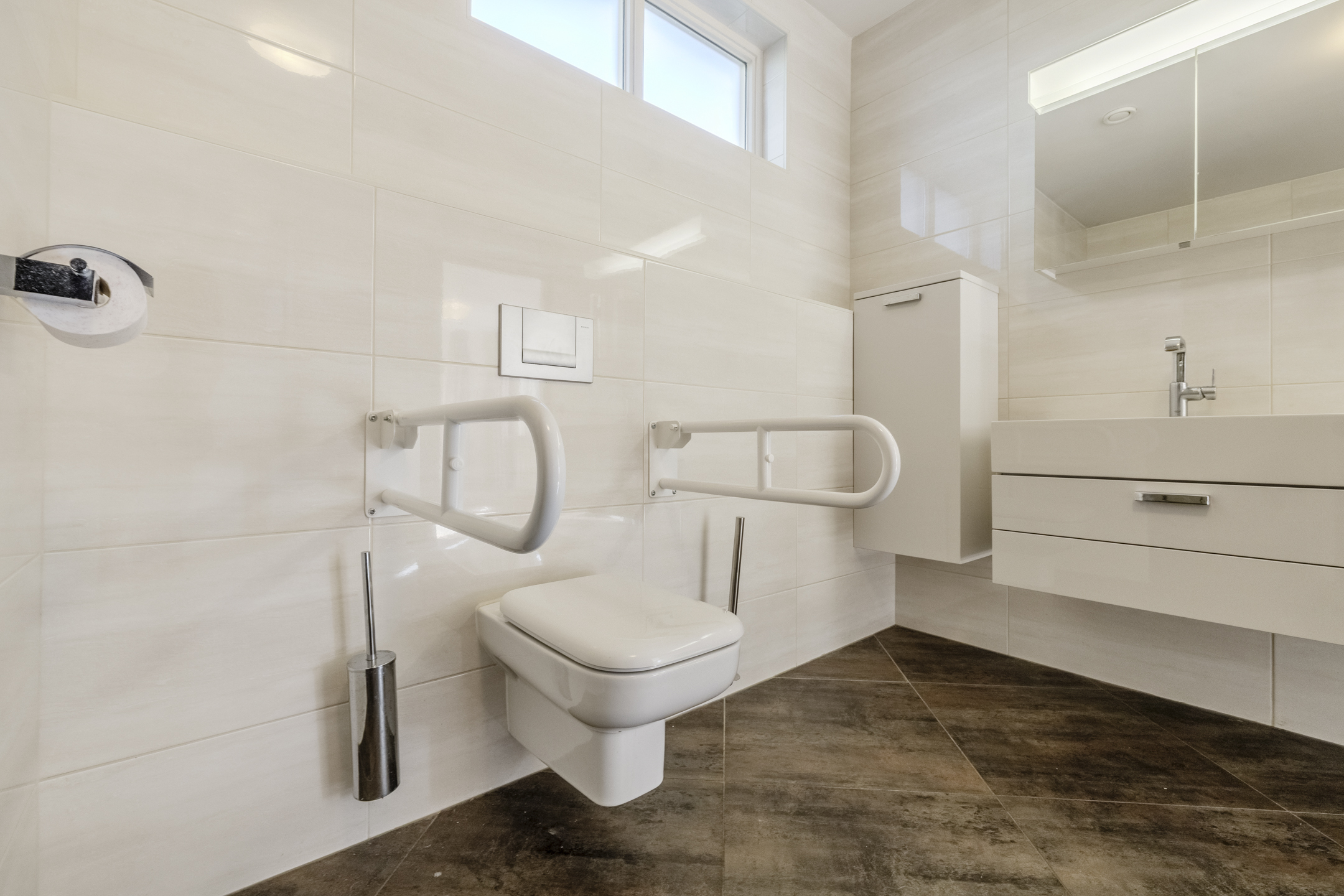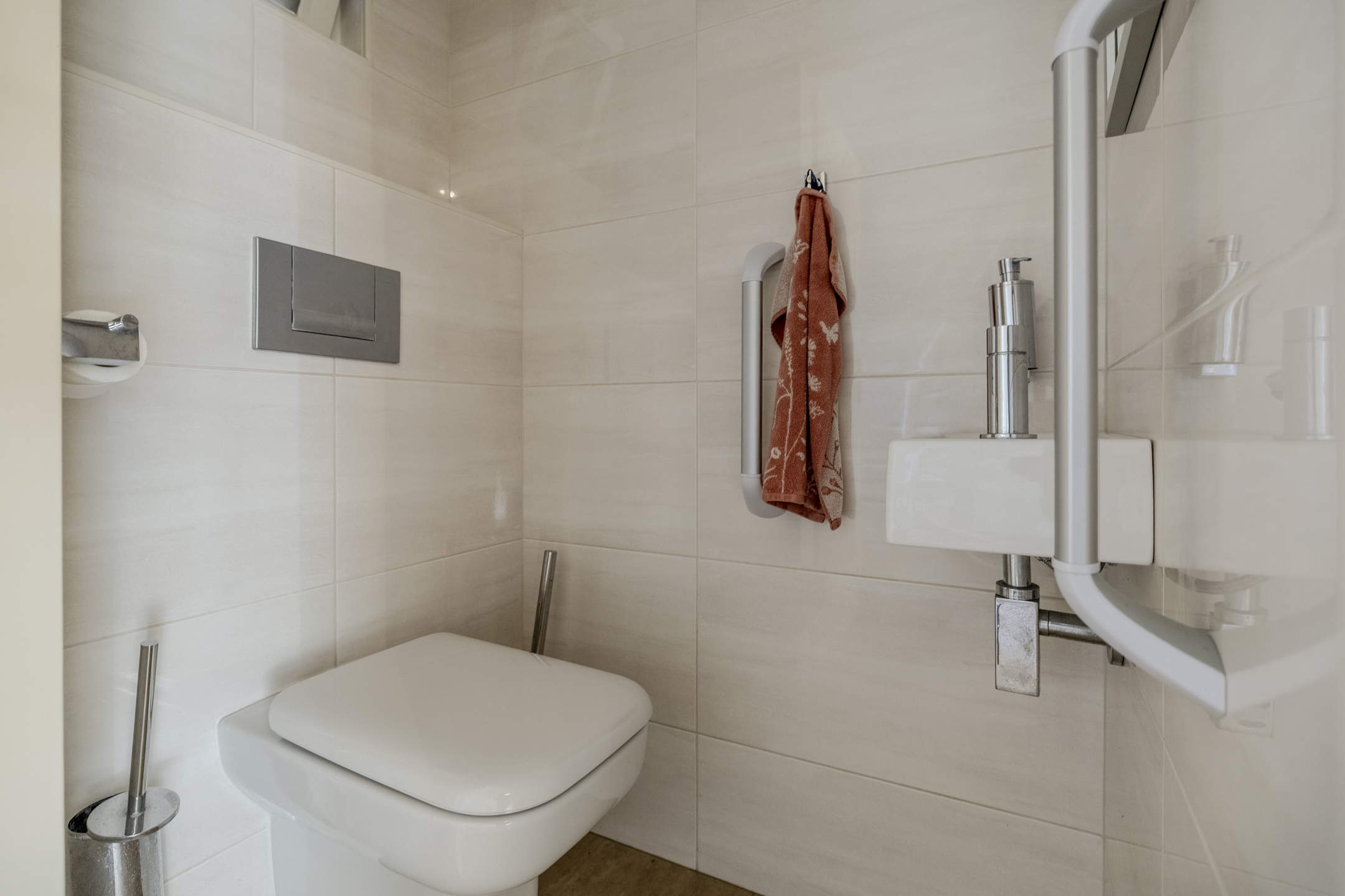 Overloop met vier slaapkamers en een tweede badkamer voorzien van toilet, wastafelmeubel en inloopdouche.