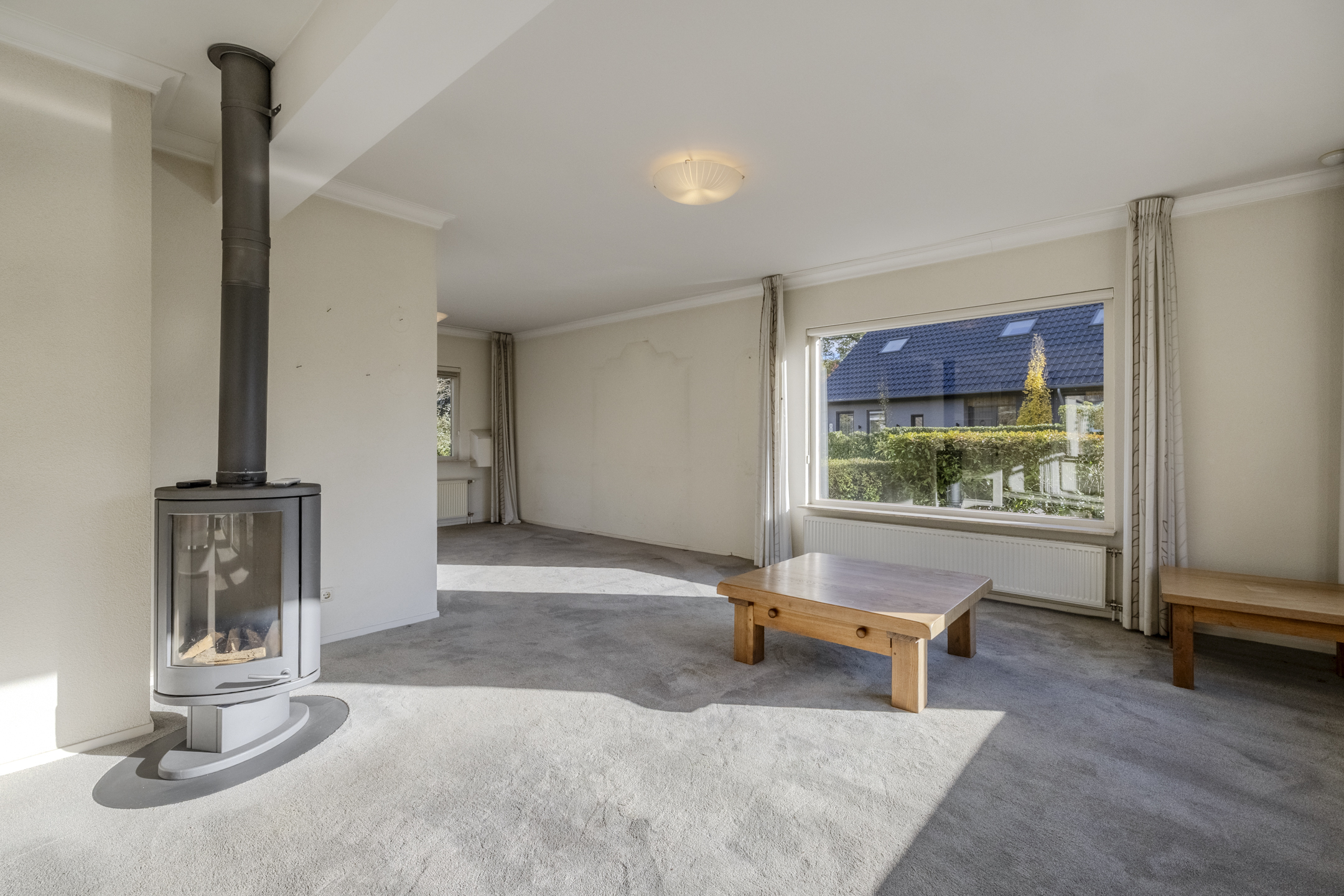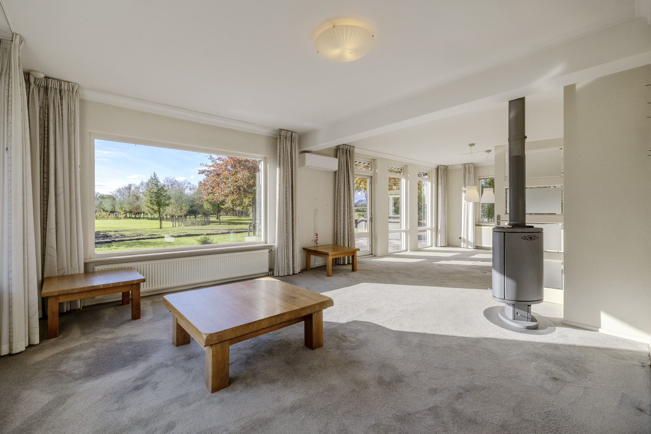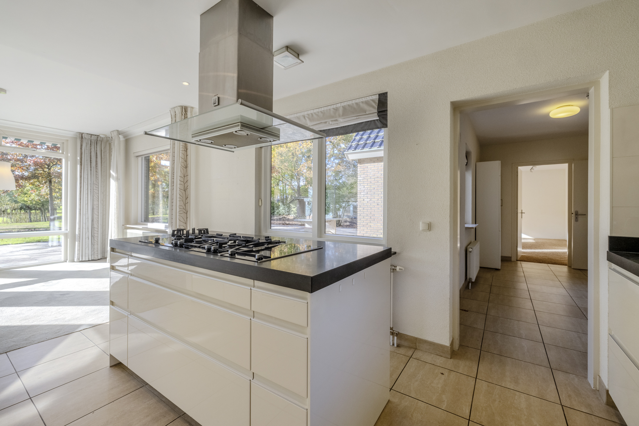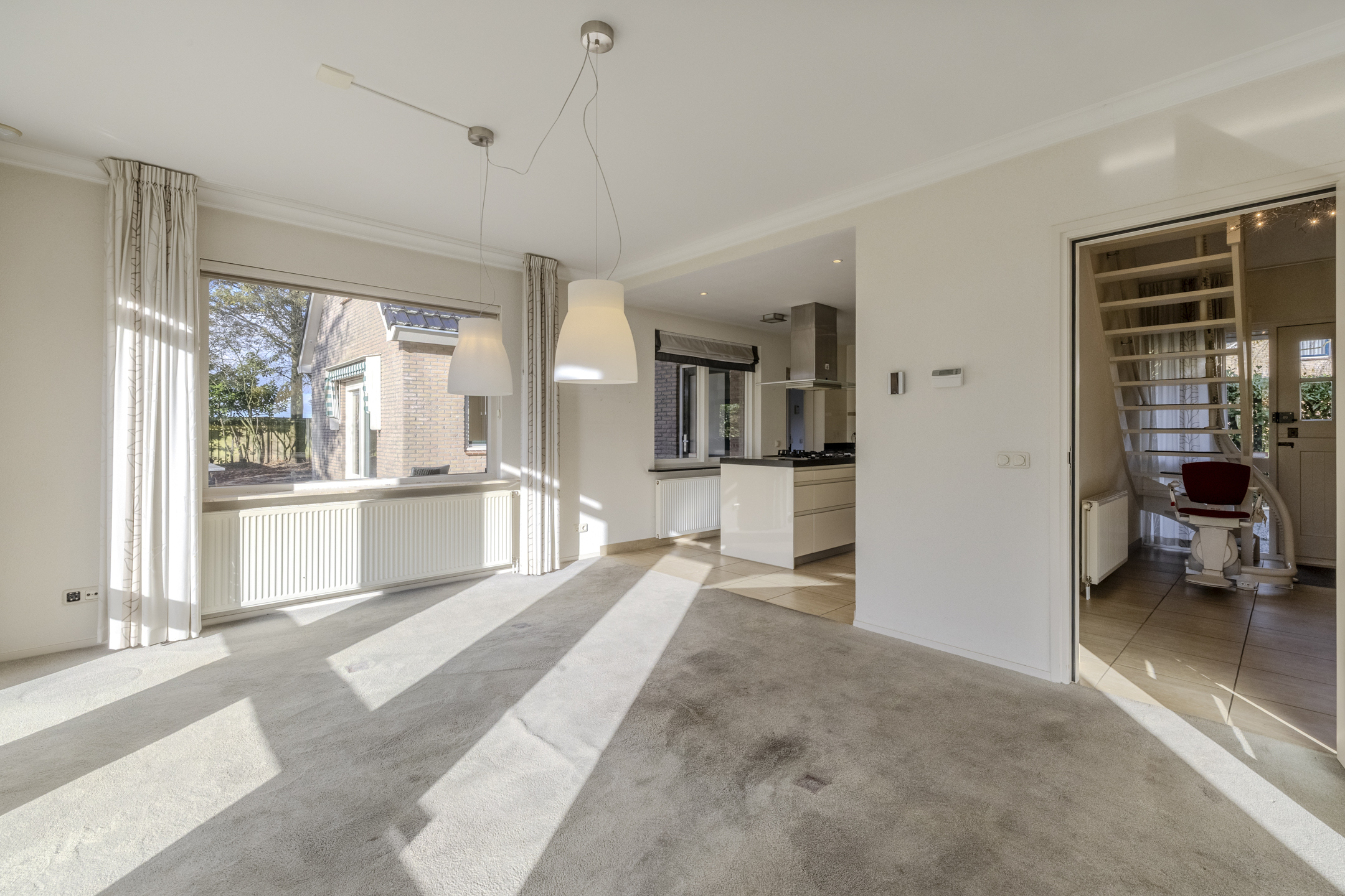 Ruime entree met trapopgang, meterkast en toilet. Lichte L-vormige woonkamer (ca. 54 m²) met grote raampartijen en een prettig uitzicht over de tuin. Halfopen keuken (ca. 15 m²) voorzien van diverse inbouwapparatuur, kookeiland en voldoende ruimte voor een eethoek.
