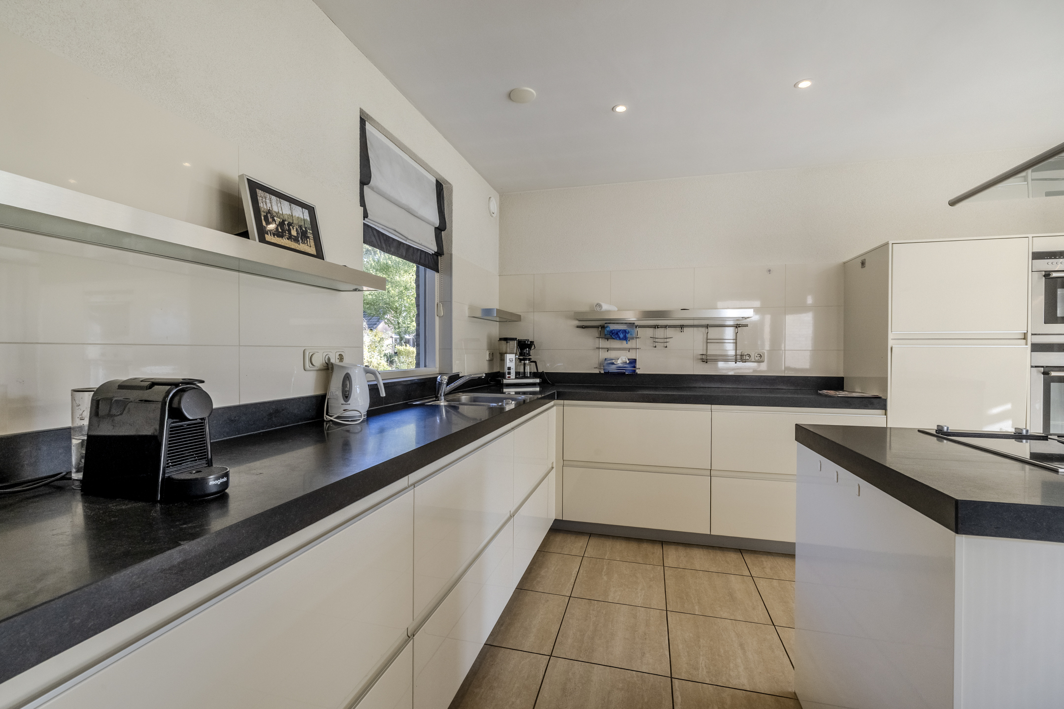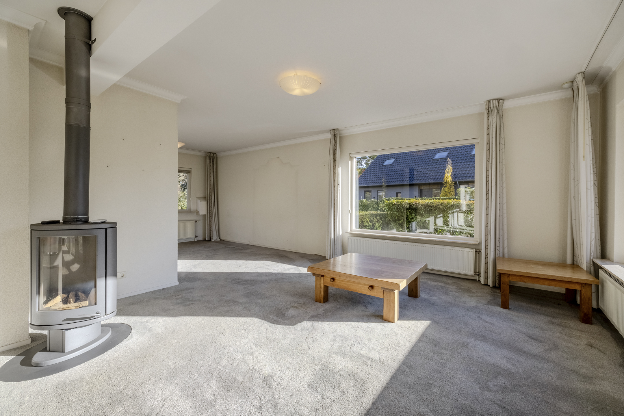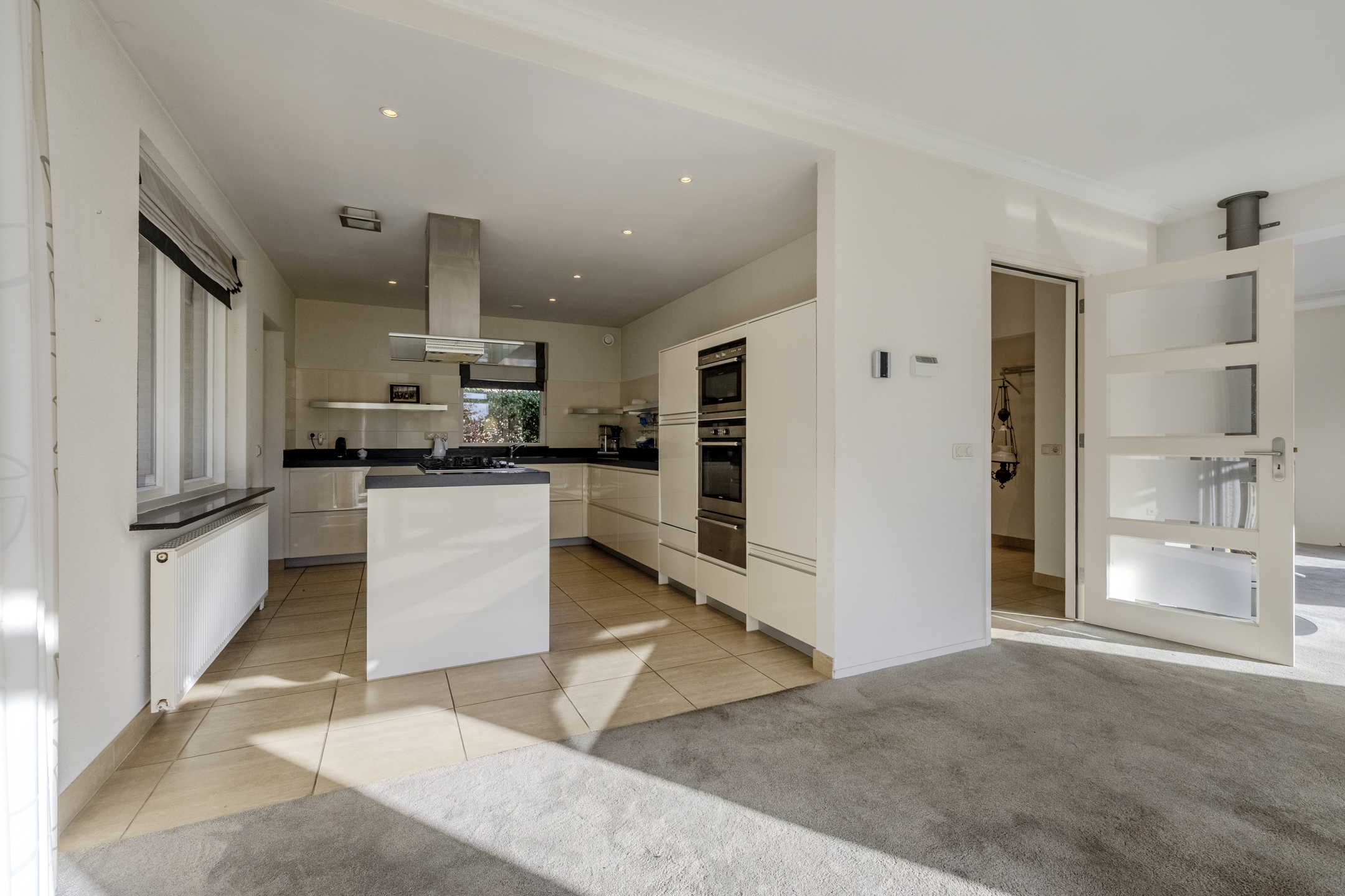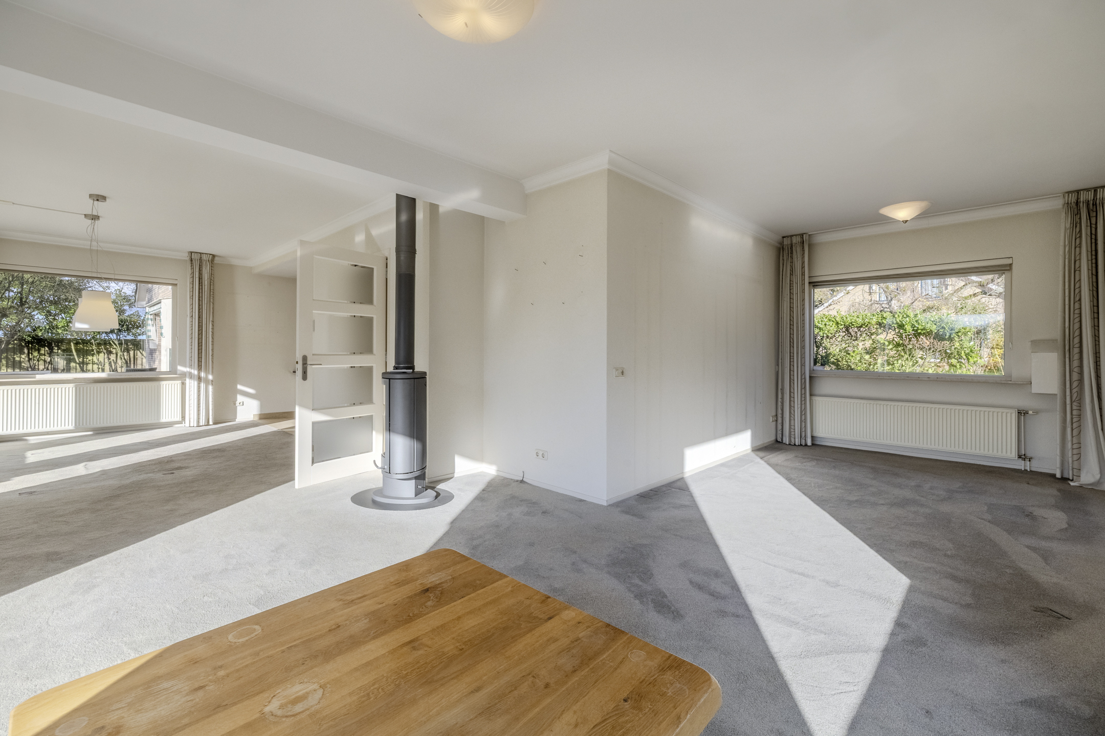 Ruime entree met trapopgang, meterkast en toilet. Lichte L-vormige woonkamer (ca. 54 m²) met grote raampartijen en een prettig uitzicht over de tuin. Halfopen keuken (ca. 15 m²) voorzien van diverse inbouwapparatuur, kookeiland en voldoende ruimte voor een eethoek.