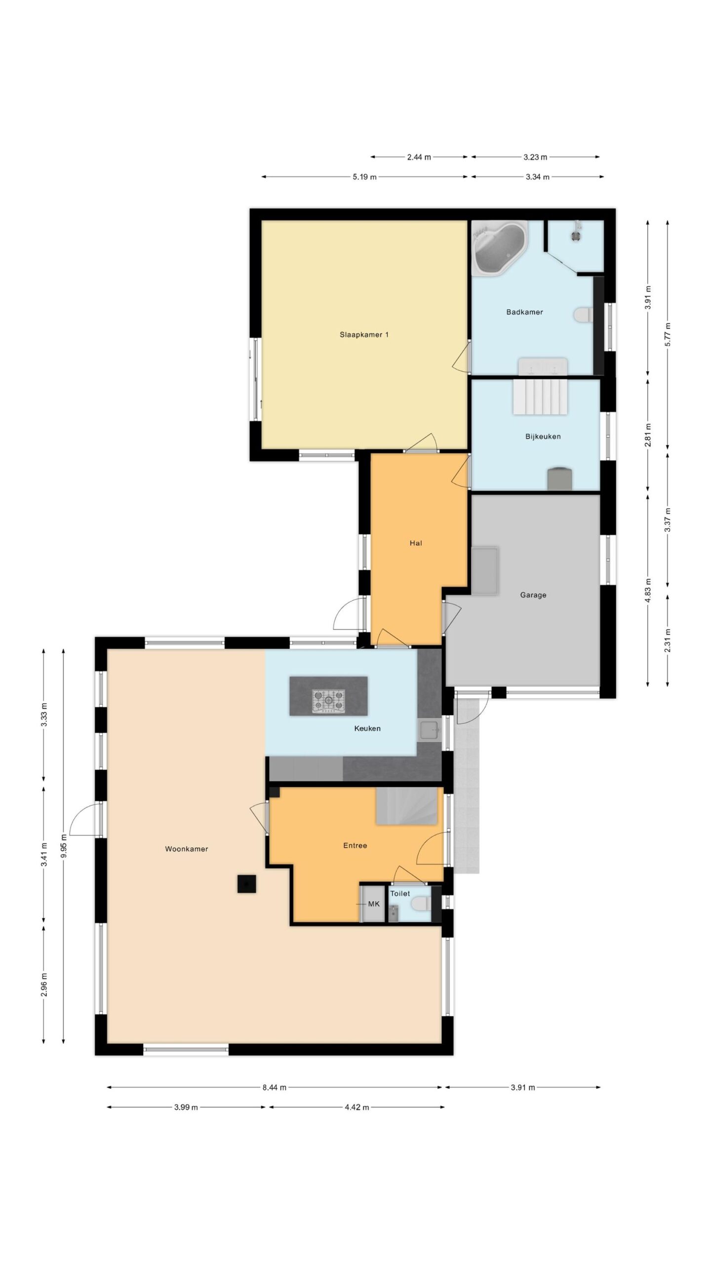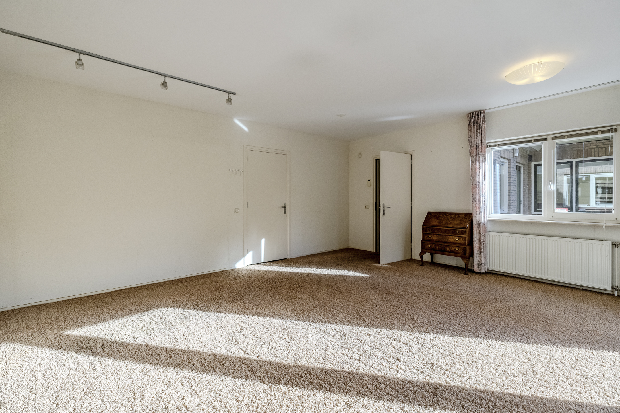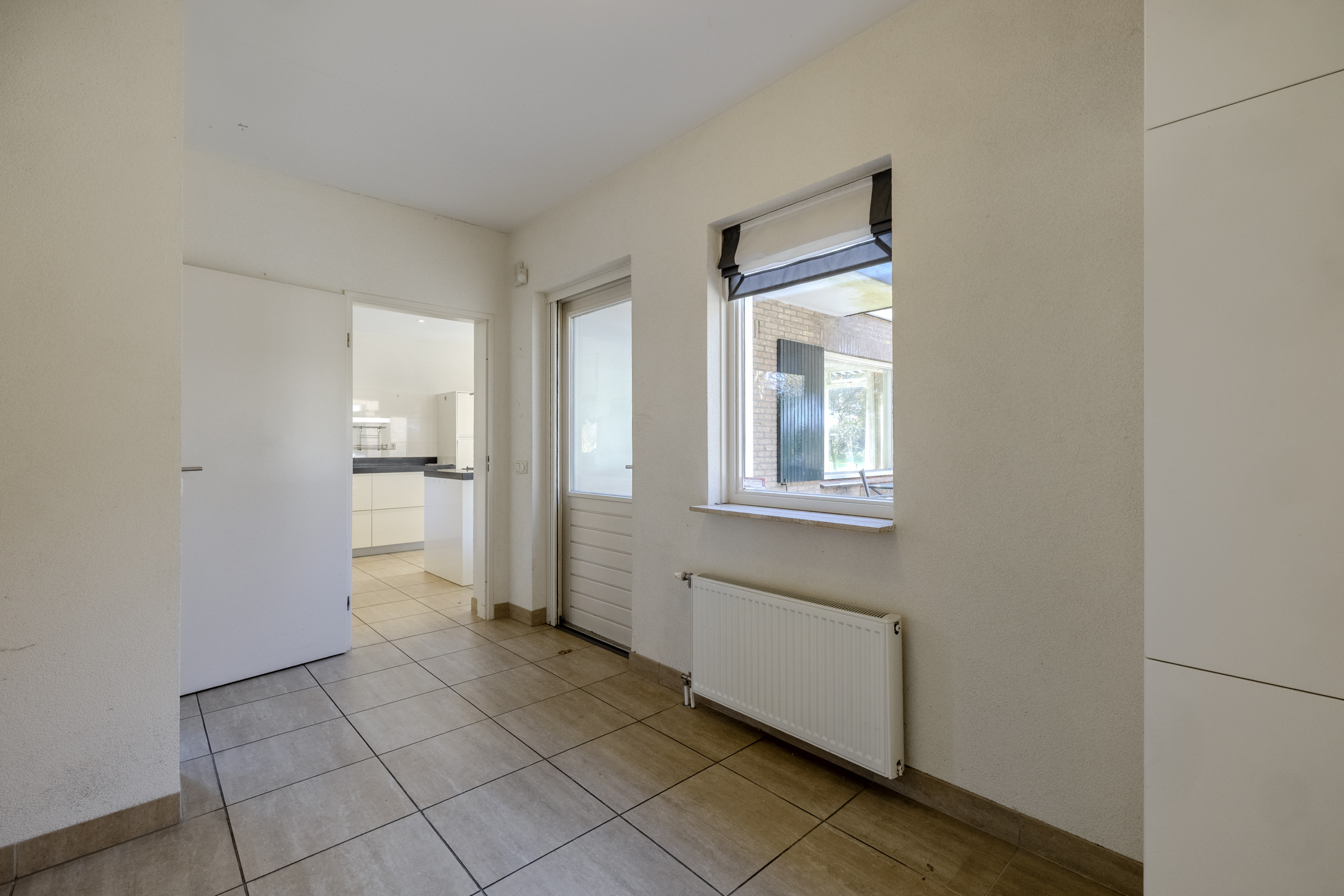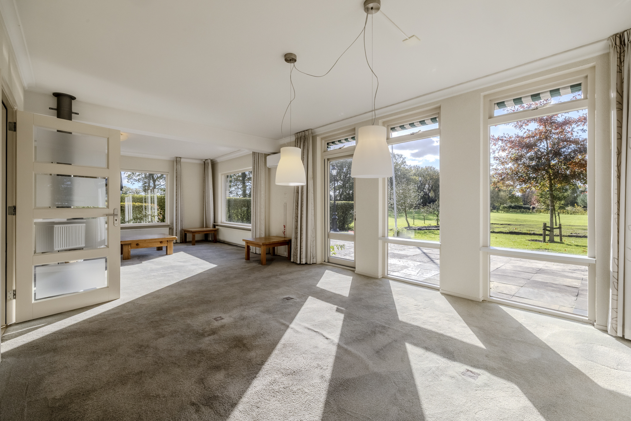 Ruime entree met trapopgang, meterkast en toilet. Lichte L-vormige woonkamer (ca. 54 m²) met grote raampartijen en een prettig uitzicht over de tuin. Halfopen keuken (ca. 15 m²) voorzien van diverse inbouwapparatuur, kookeiland en voldoende ruimte voor een eethoek.
