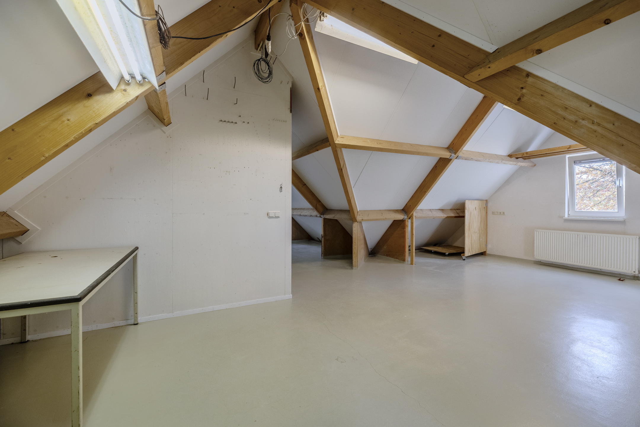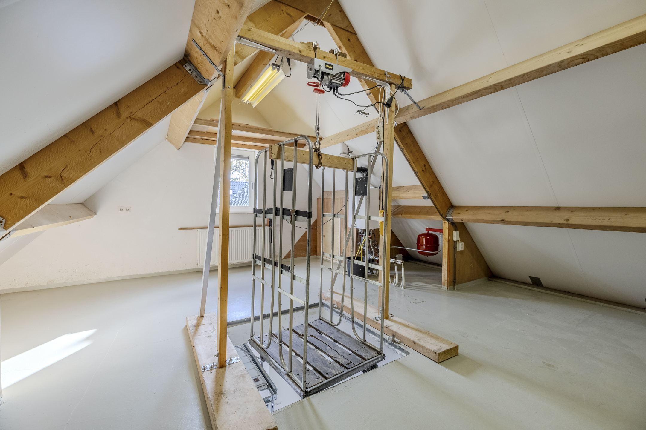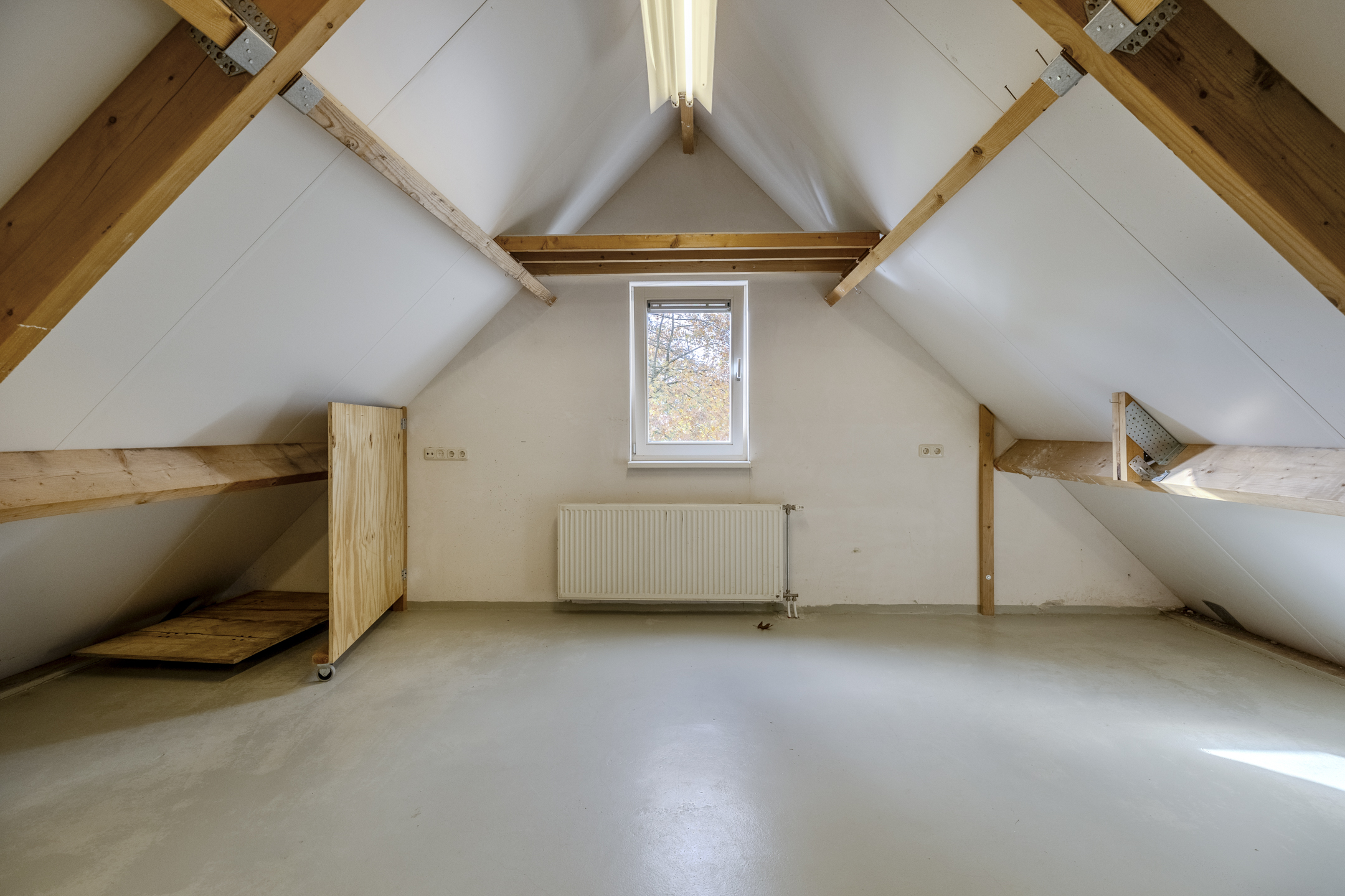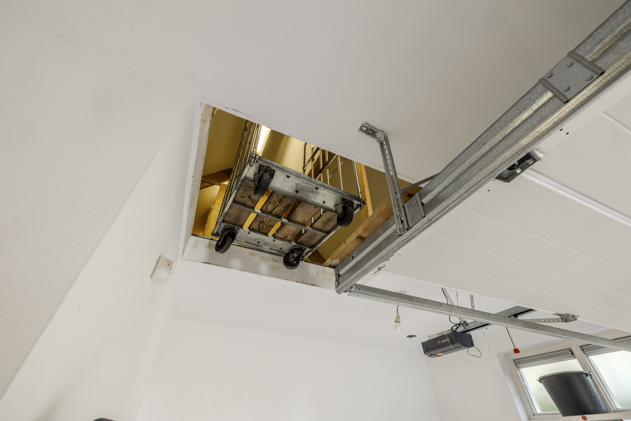 De woning beschikt over een geïsoleerde en verwarmde inpandige garage met vliering, loopdeur en elektrische overheaddeur. Boven de garage bevindt zich extra ruimte die bereikbaar is via een vaste trap vanuit de bijkeuken, ideaal voor het creëren van één of twee extra kamers.