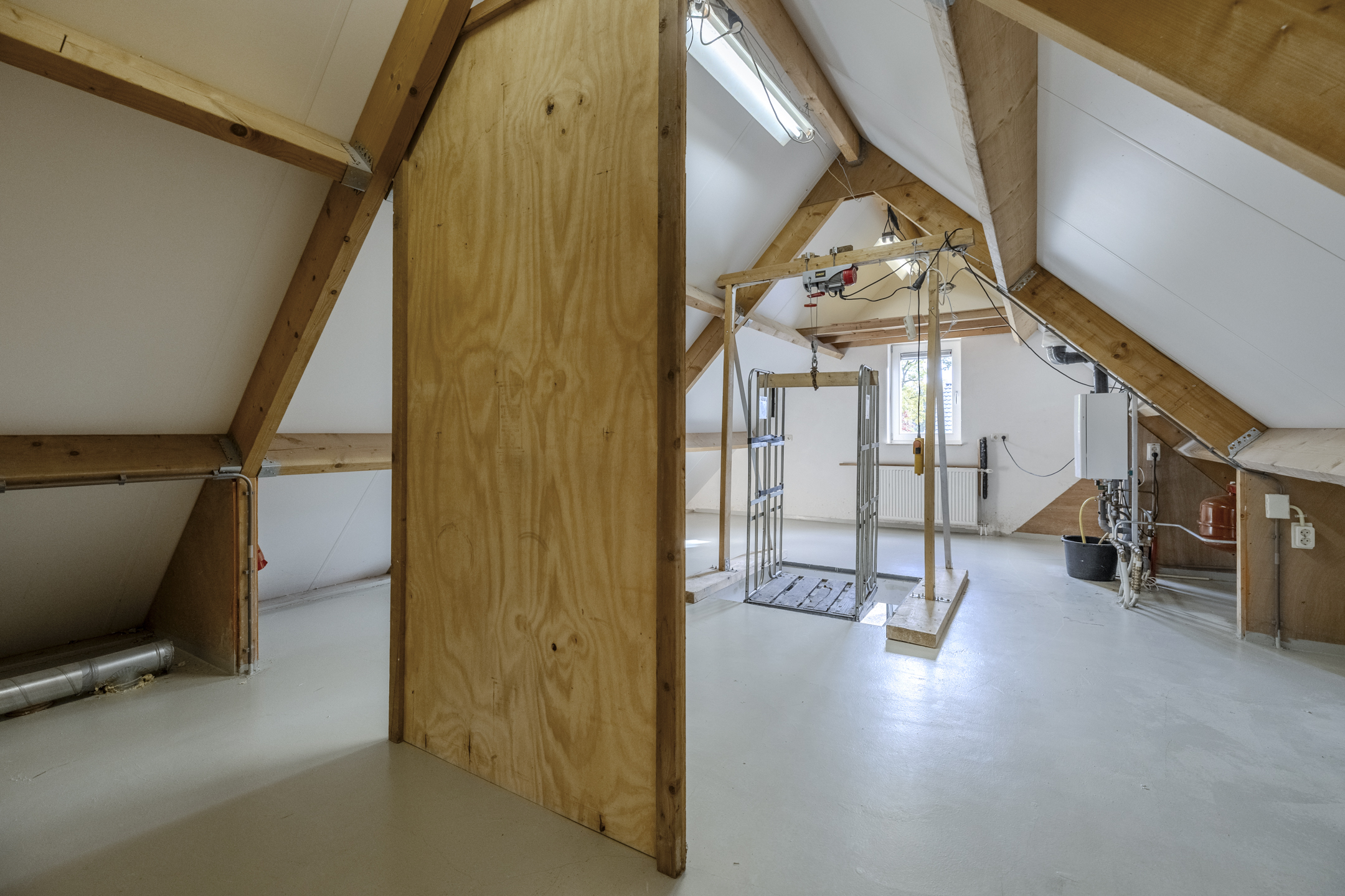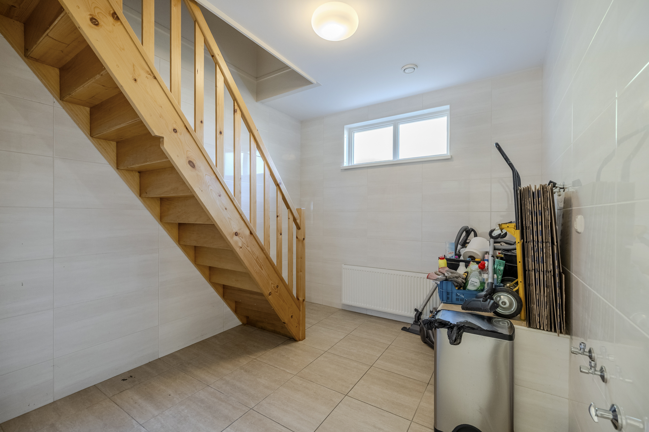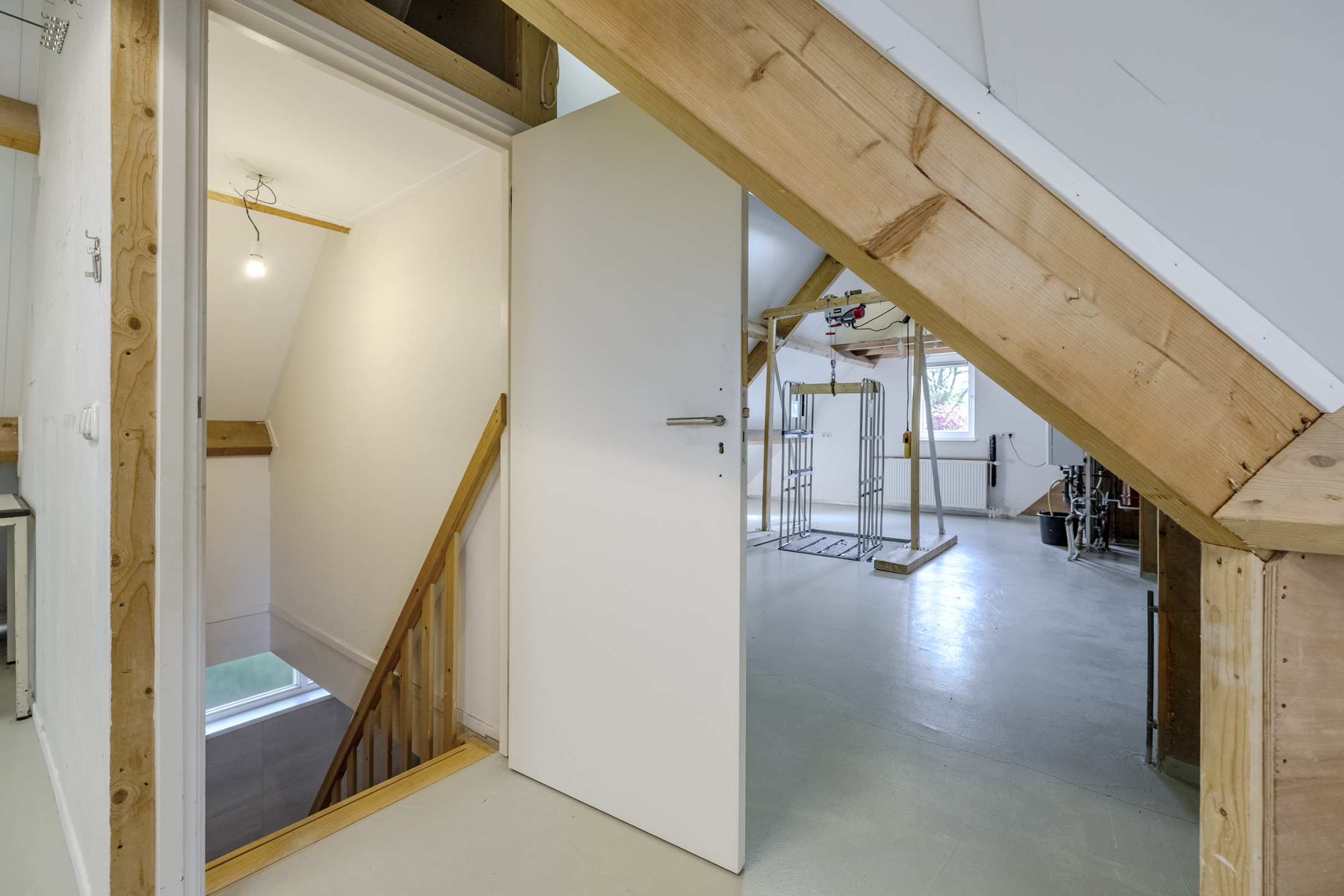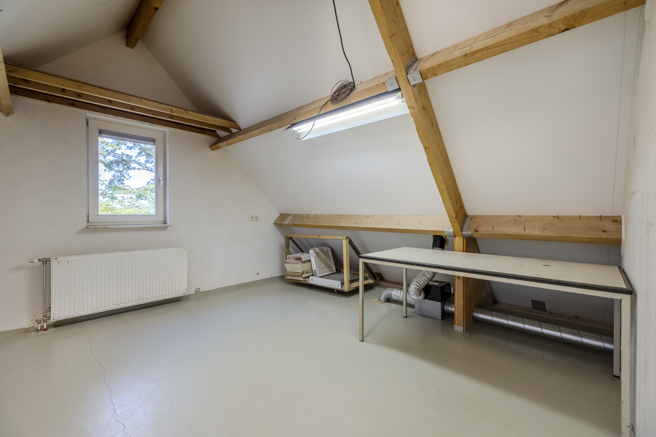 De woning beschikt over een geïsoleerde en verwarmde inpandige garage met vliering, loopdeur en elektrische overheaddeur. Boven de garage bevindt zich extra ruimte die bereikbaar is via een vaste trap vanuit de bijkeuken, ideaal voor het creëren van één of twee extra kamers.