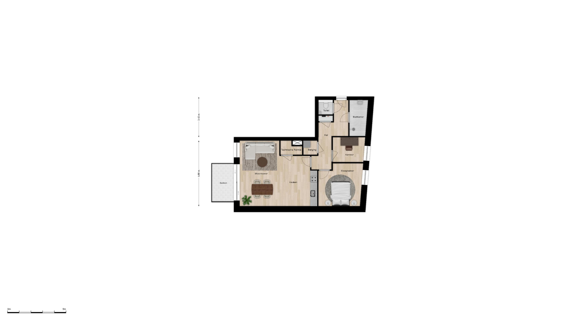 Entree met (separaat) toilet, badkamer, woonkamer, open keuken bijkeuken/berging, één slaapkamer, technische ruimte en balkon