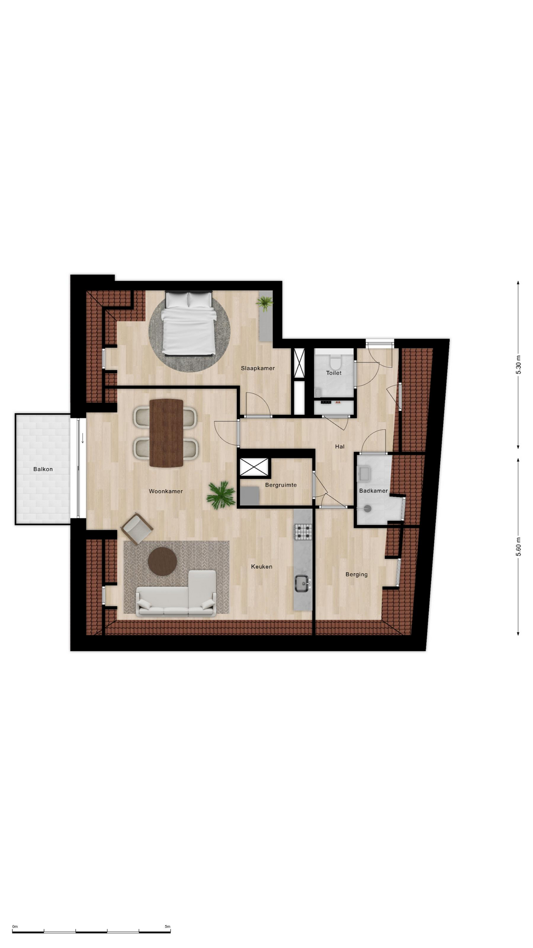 Entree met (separaat) toilet, bijkeuken/berging, vrij in te delen ruimte, woonkamer, open keuken, één slaapkamer, badkamer met toilet, technische ruimte en balkon