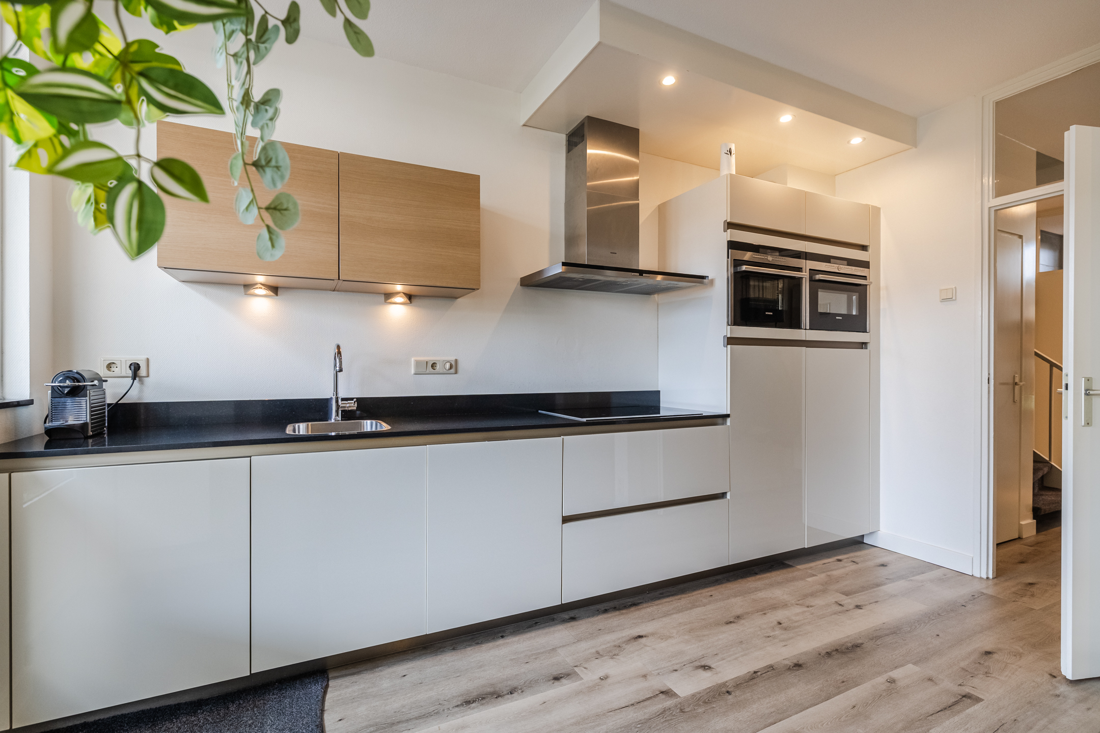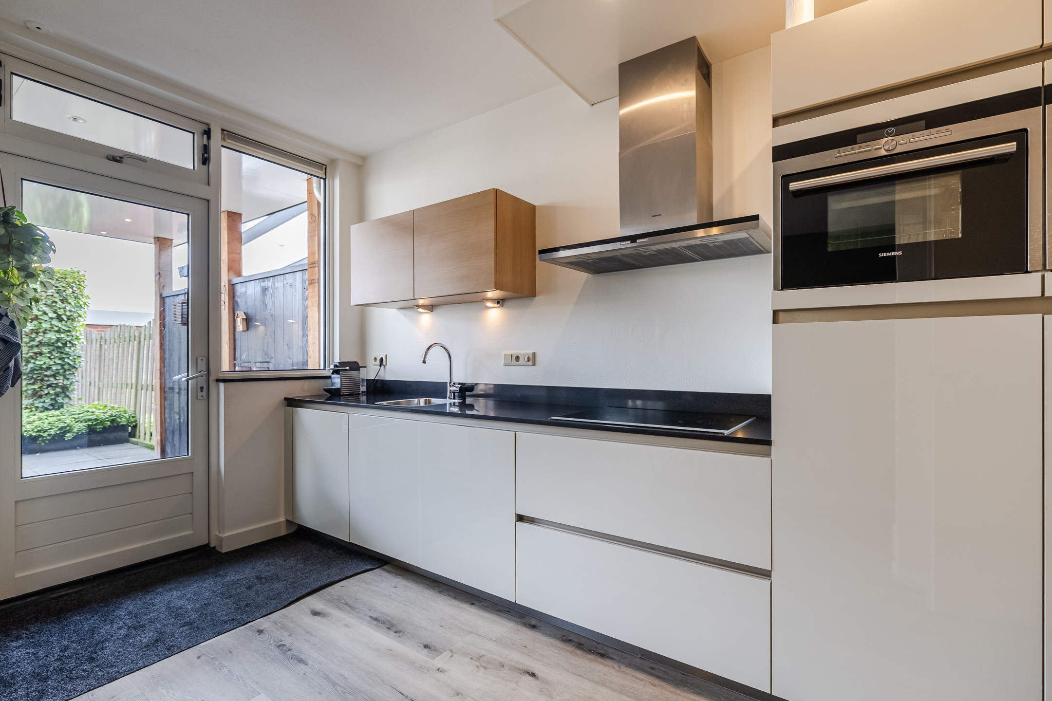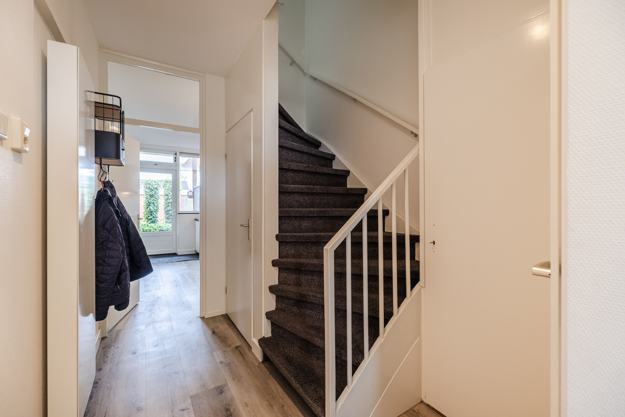 Entree met meterkast, toilet, trapopgang en trapkast. Lichte woonkamer met doorzonopstelling en grote raampartijen. De open keuken is voorzien van diverse inbouwapparatuur en geeft toegang tot de overkapping en de achtertuin.