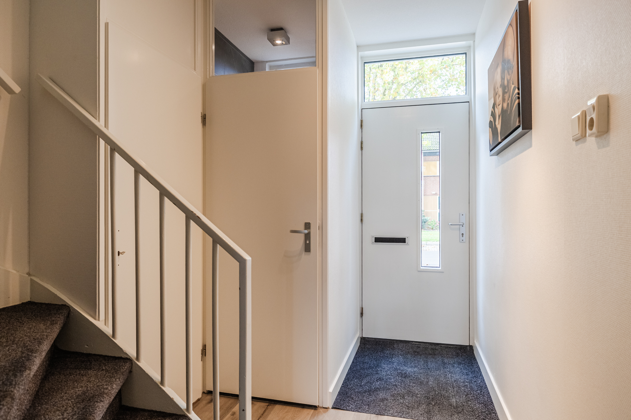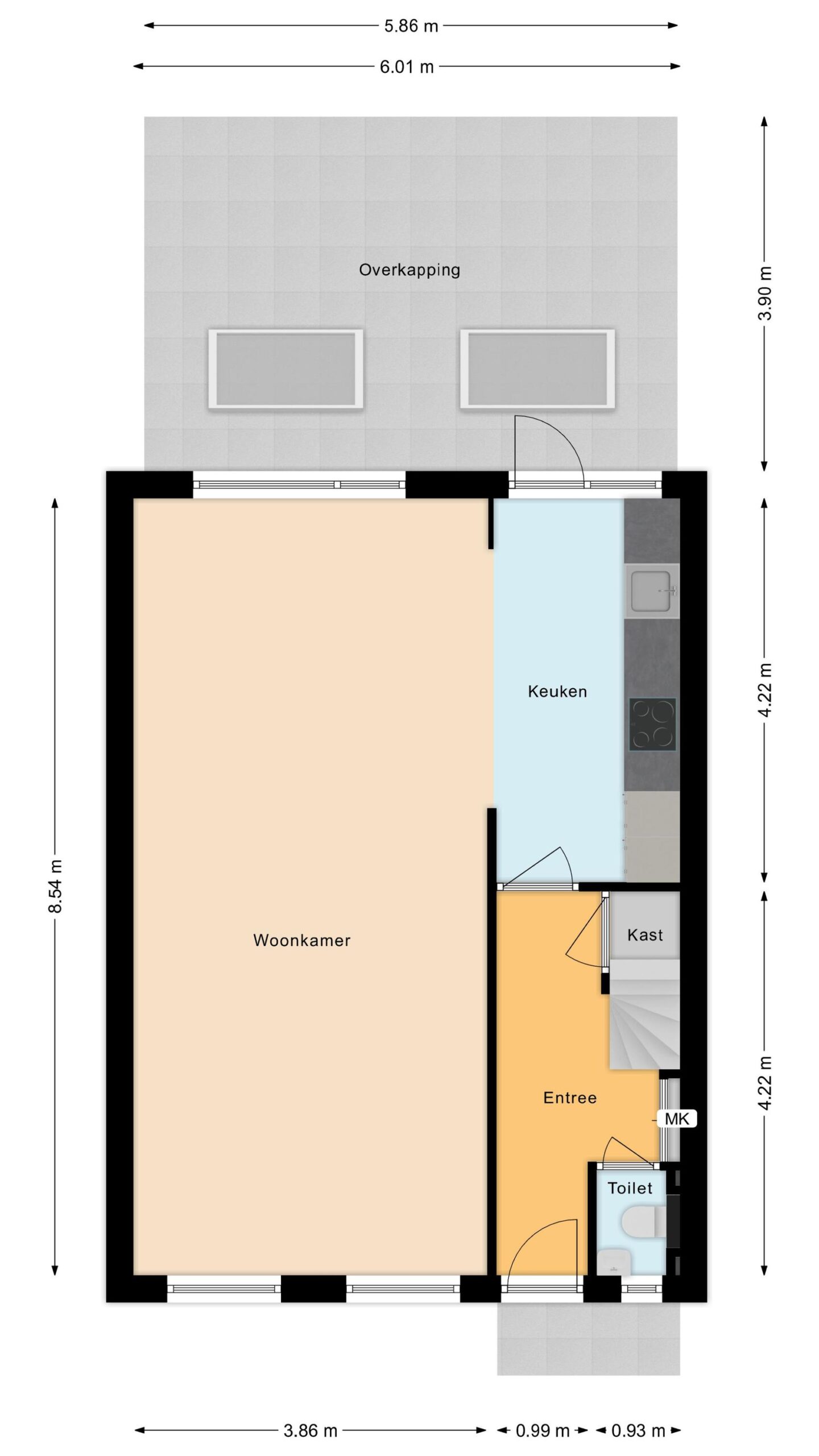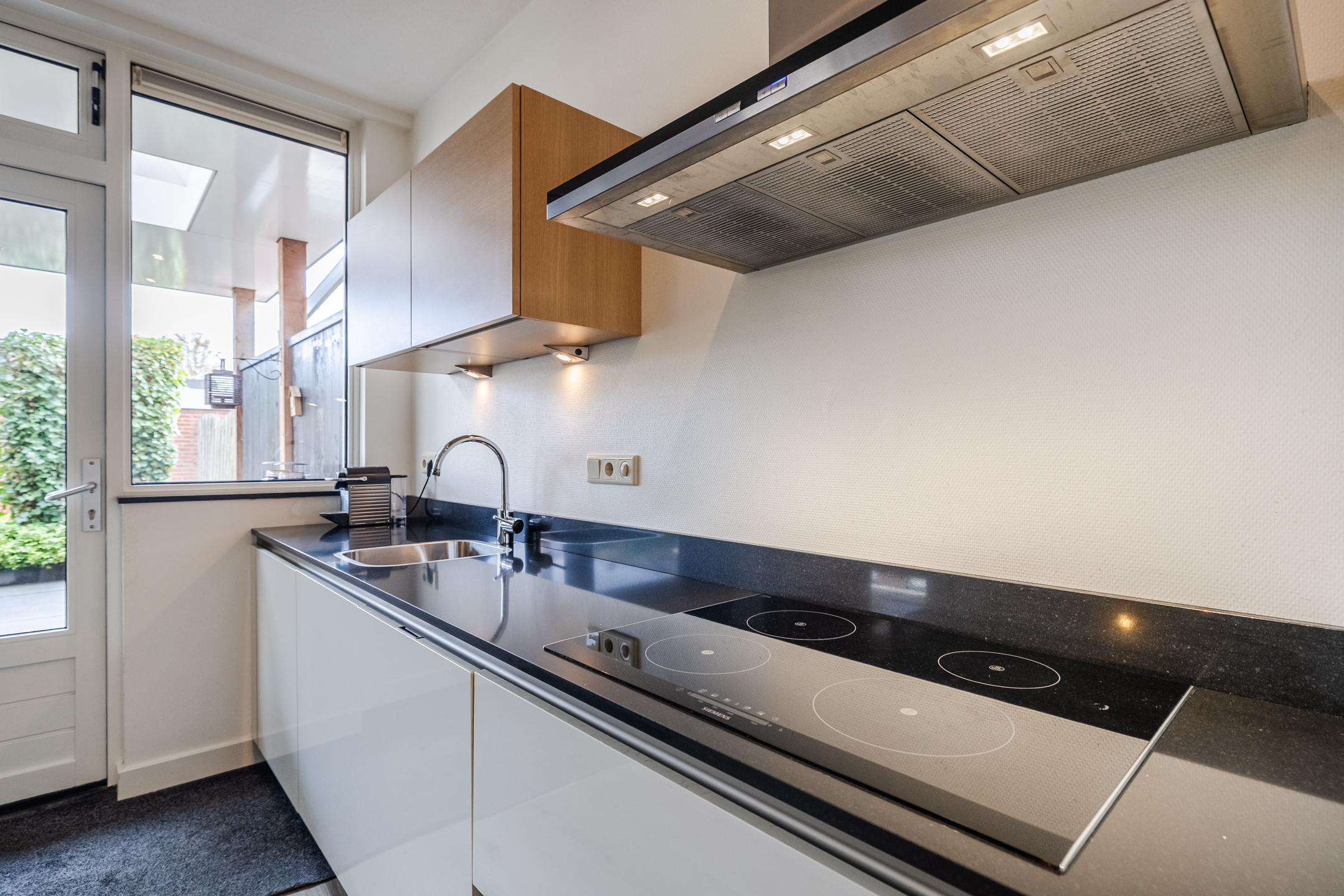 Entree met meterkast, toilet, trapopgang en trapkast. Lichte woonkamer met doorzonopstelling en grote raampartijen. De open keuken is voorzien van diverse inbouwapparatuur en geeft toegang tot de overkapping en de achtertuin.