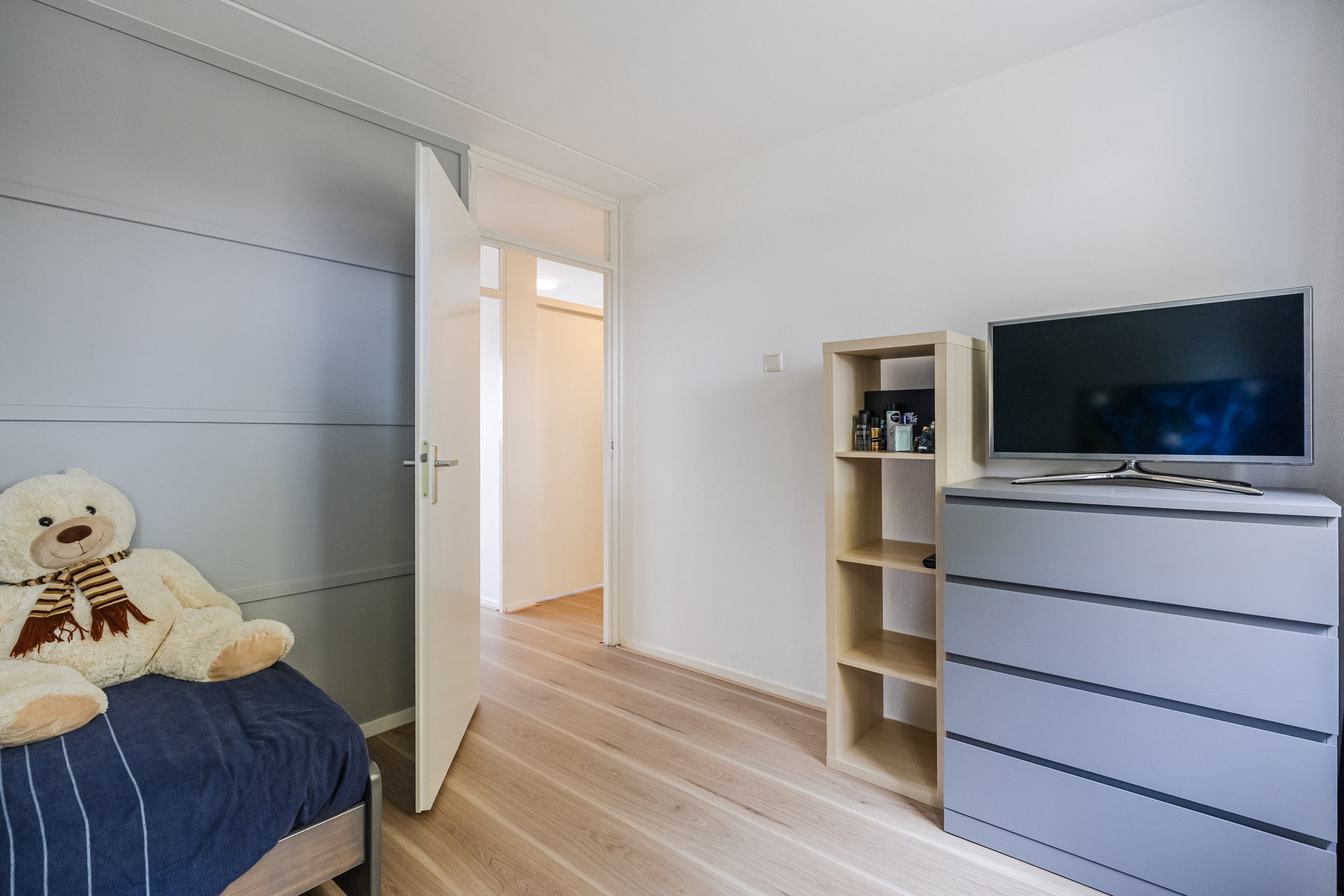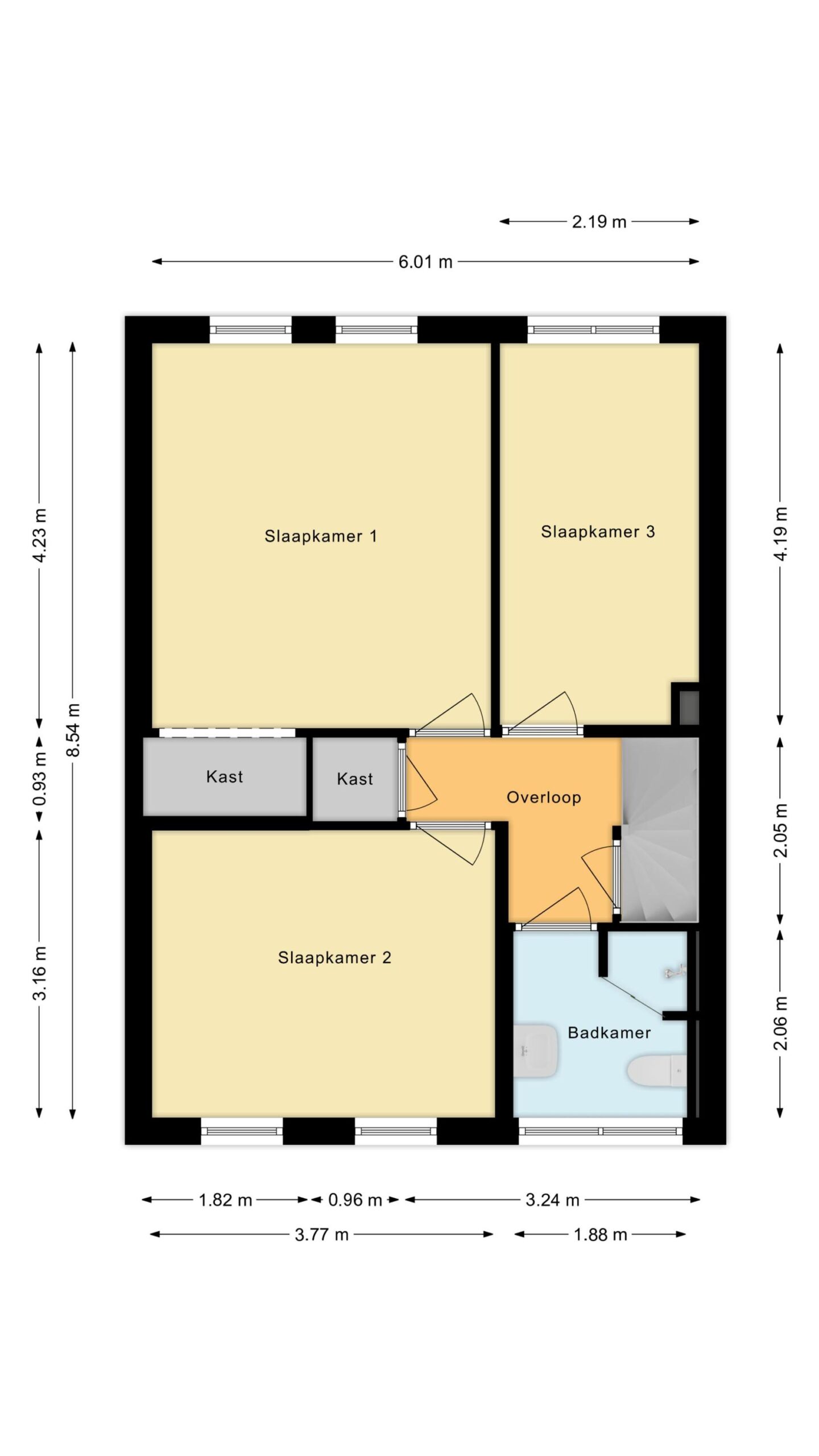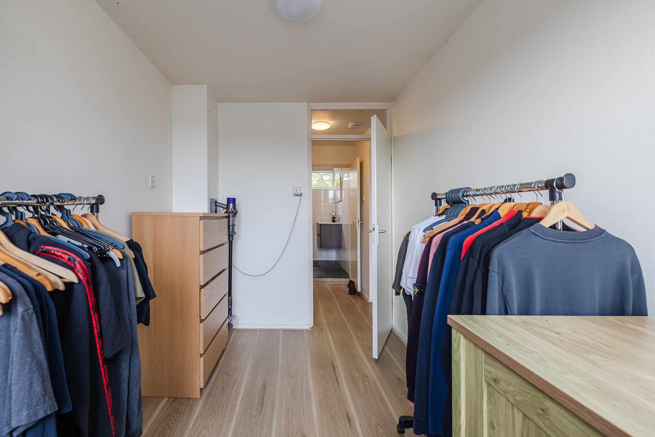 Overloop met drie slaapkamers, waarvan één met een vaste kast. De badkamer is voorzien van een inloopdouche, toilet en wastafelmeubel.