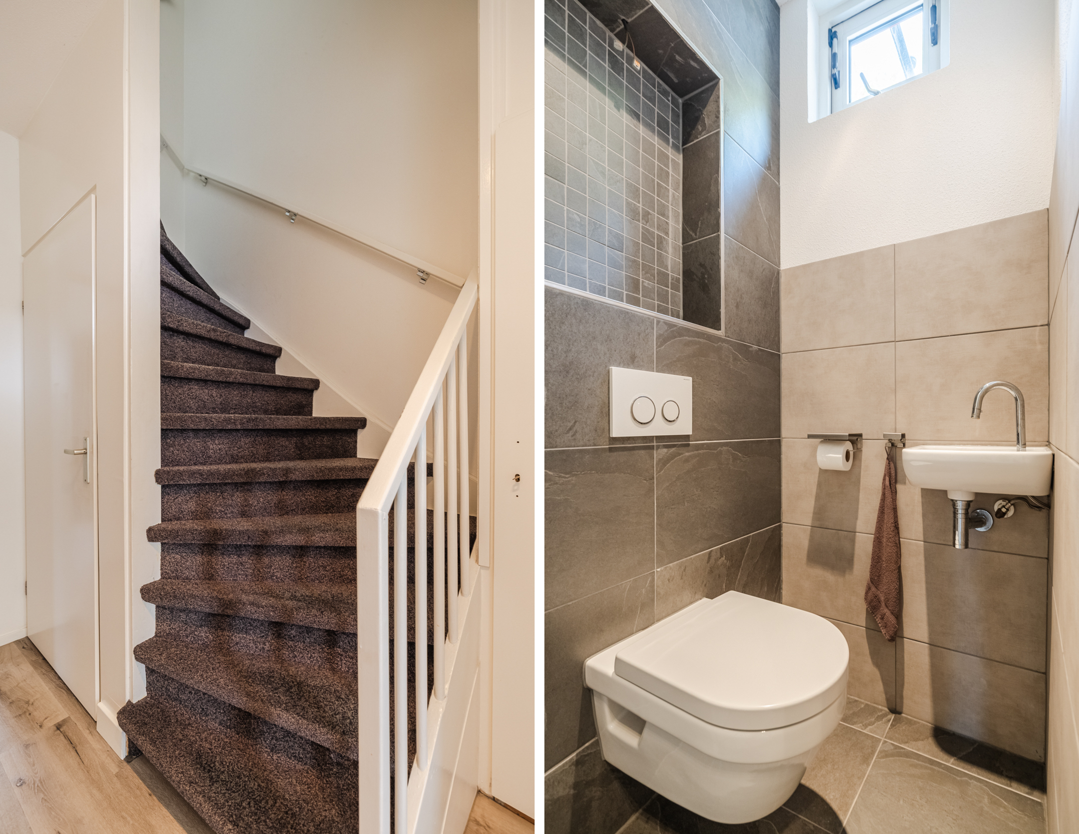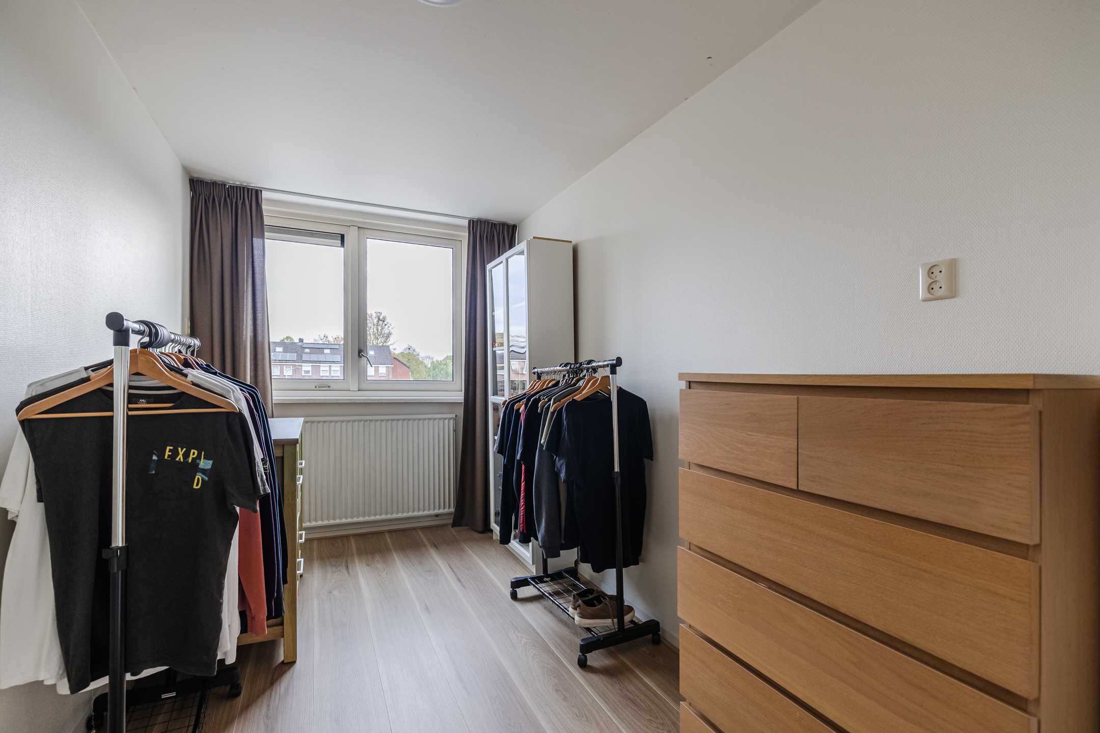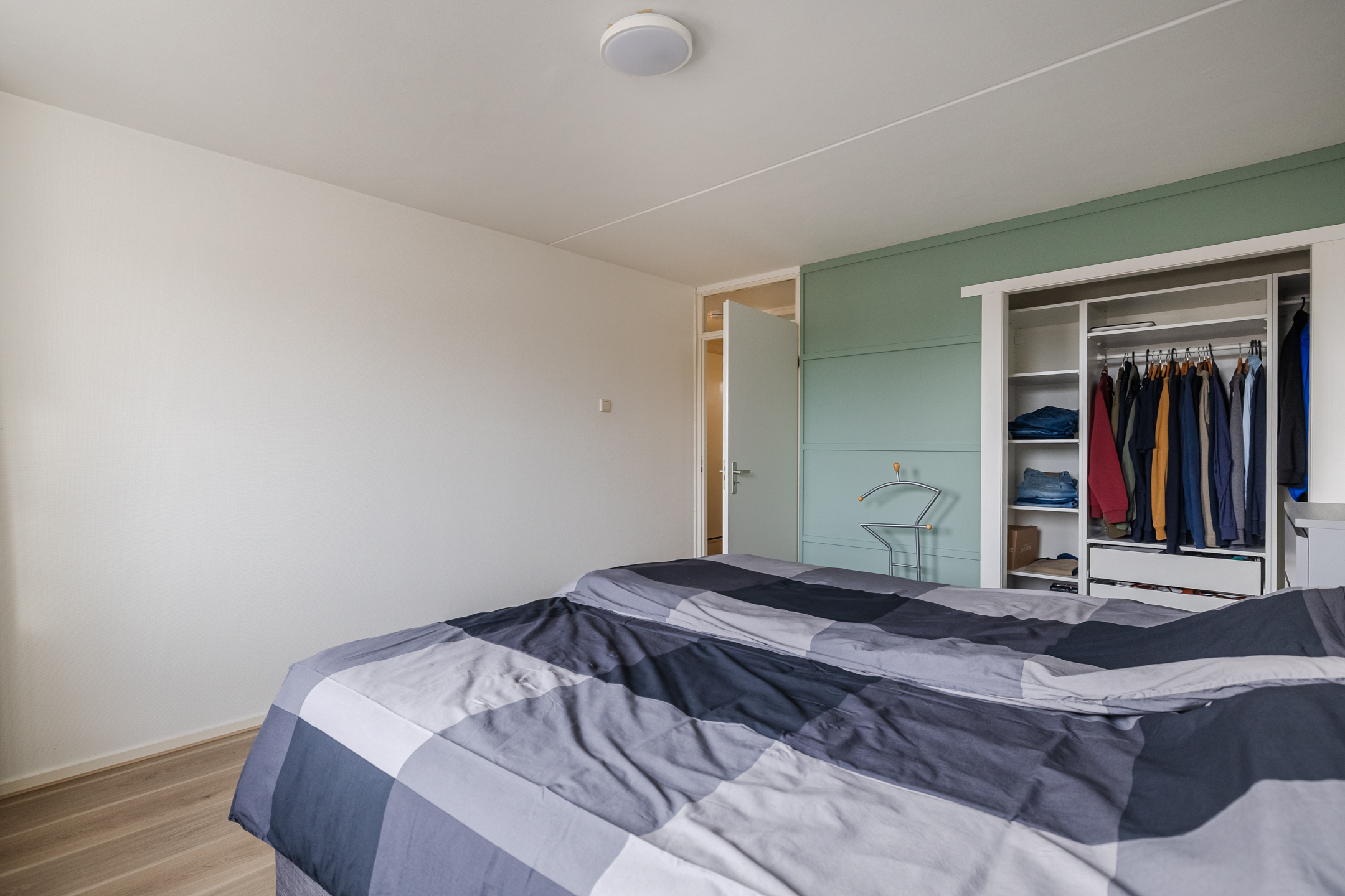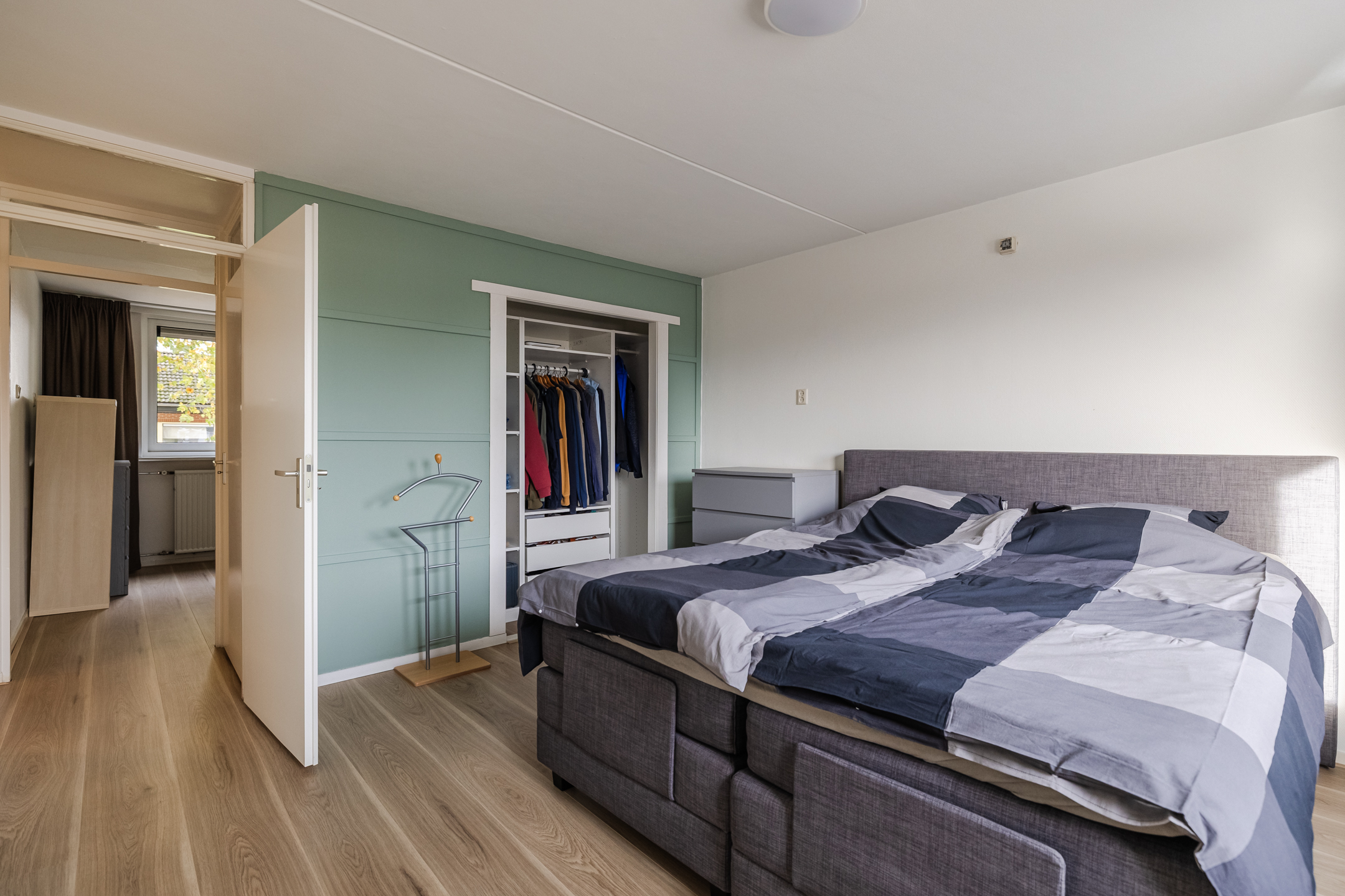 Overloop met drie slaapkamers, waarvan één met een vaste kast. De badkamer is voorzien van een inloopdouche, toilet en wastafelmeubel.