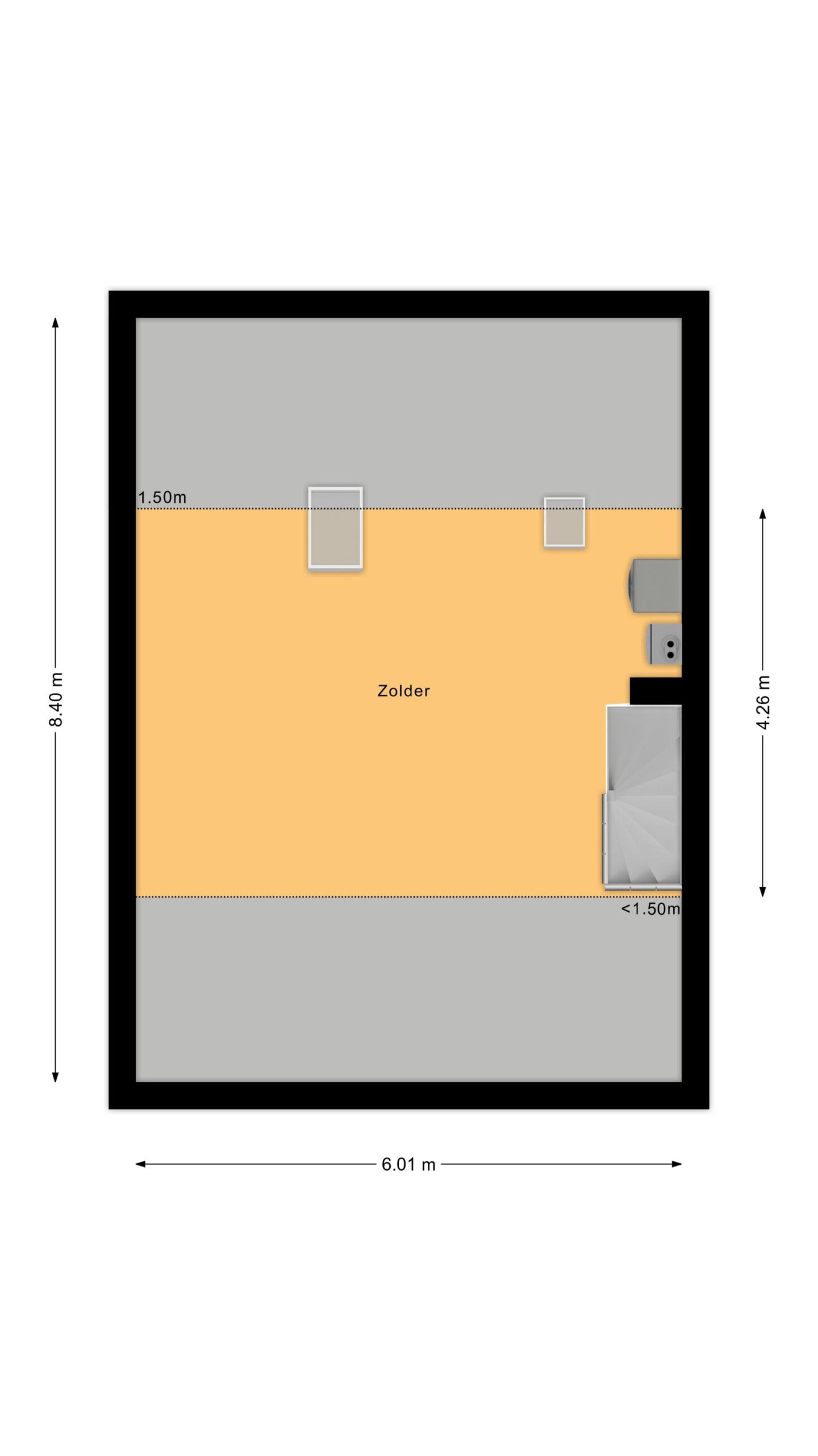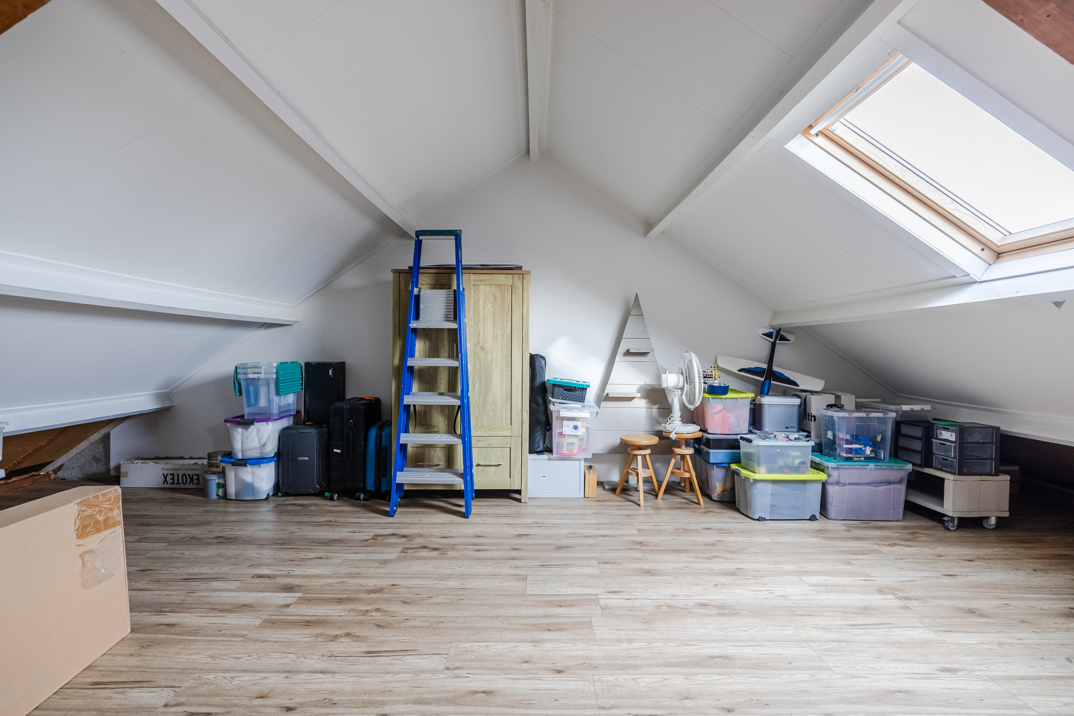 Ruime zolder met dakramen, cv-opstelling en volop bergruimte. Deze ruimte is goed geschikt om een extra slaapkamer of werkruimte te realiseren.