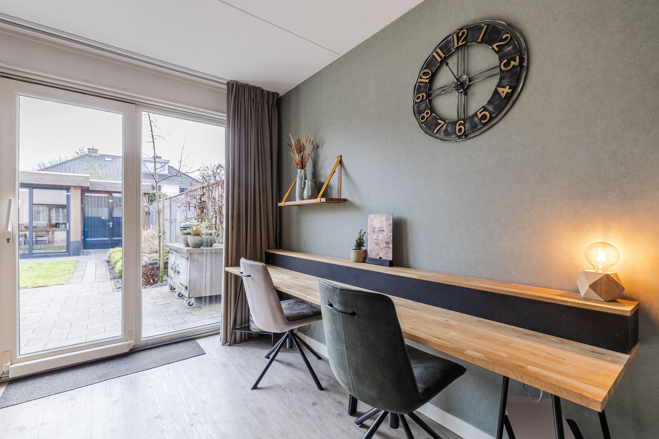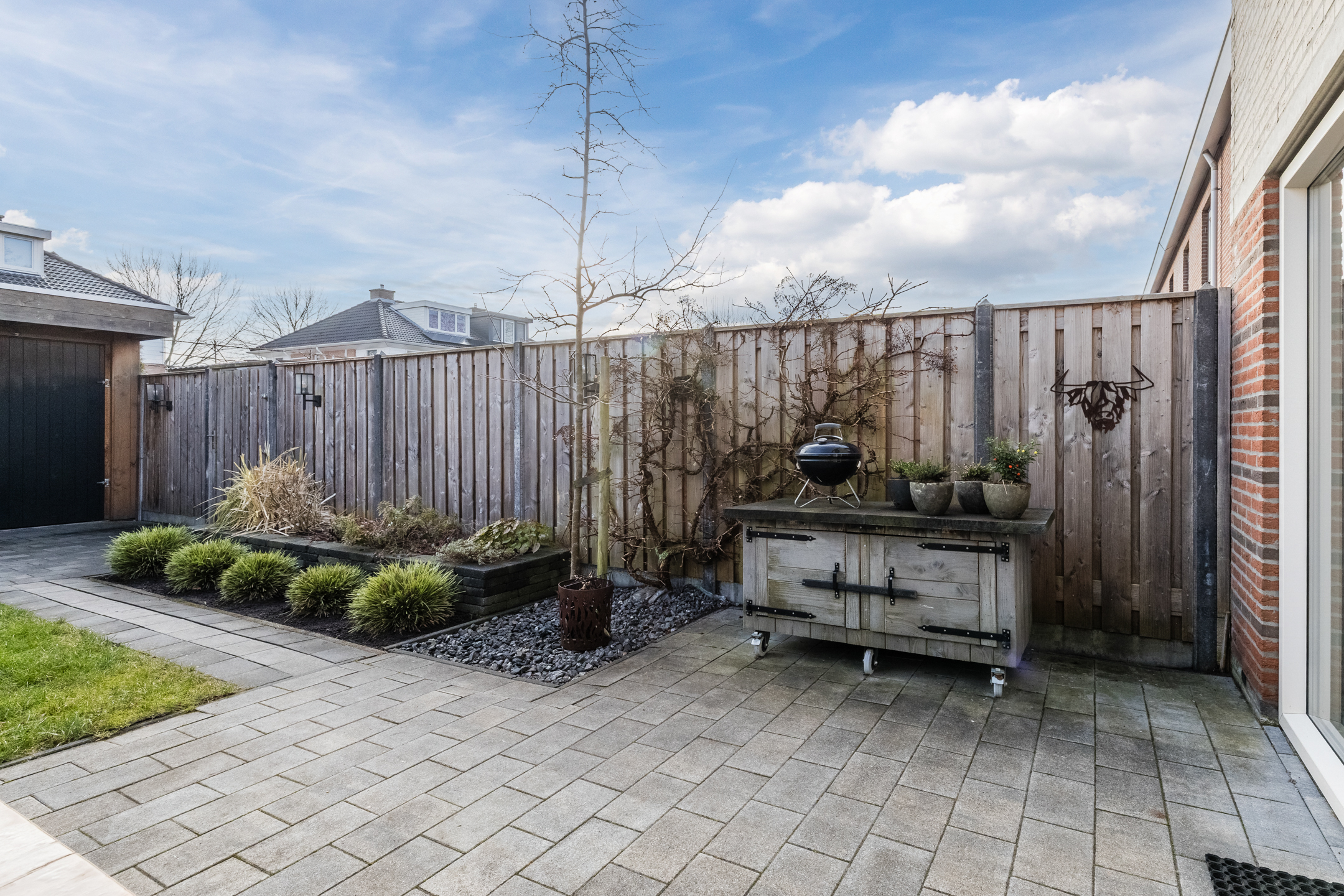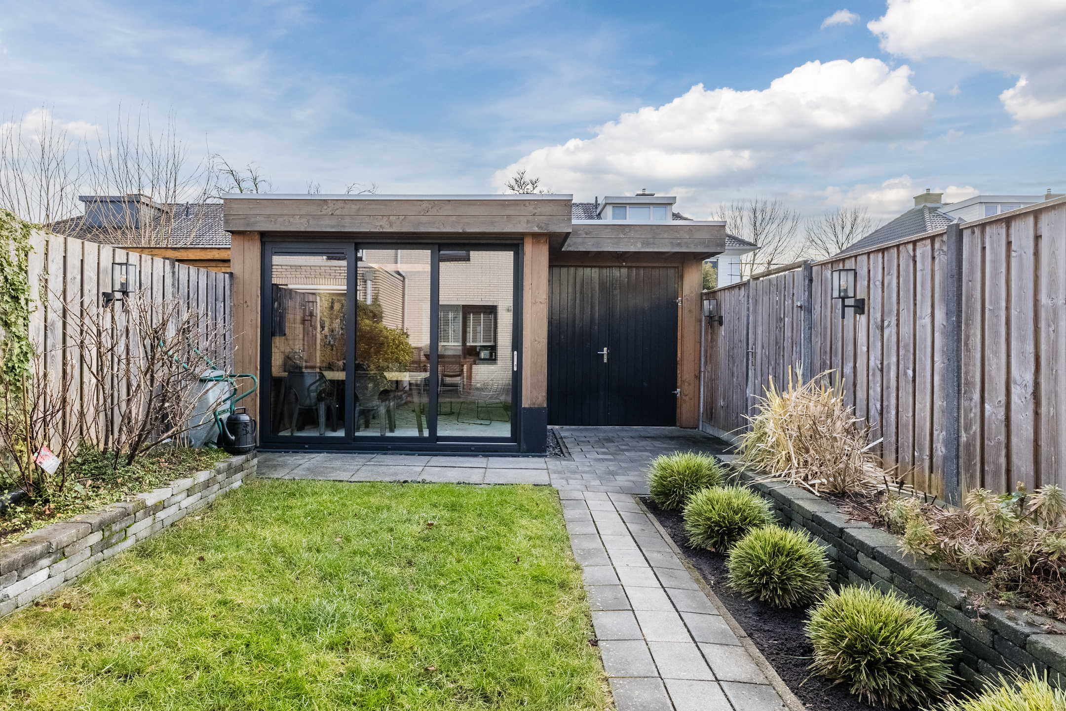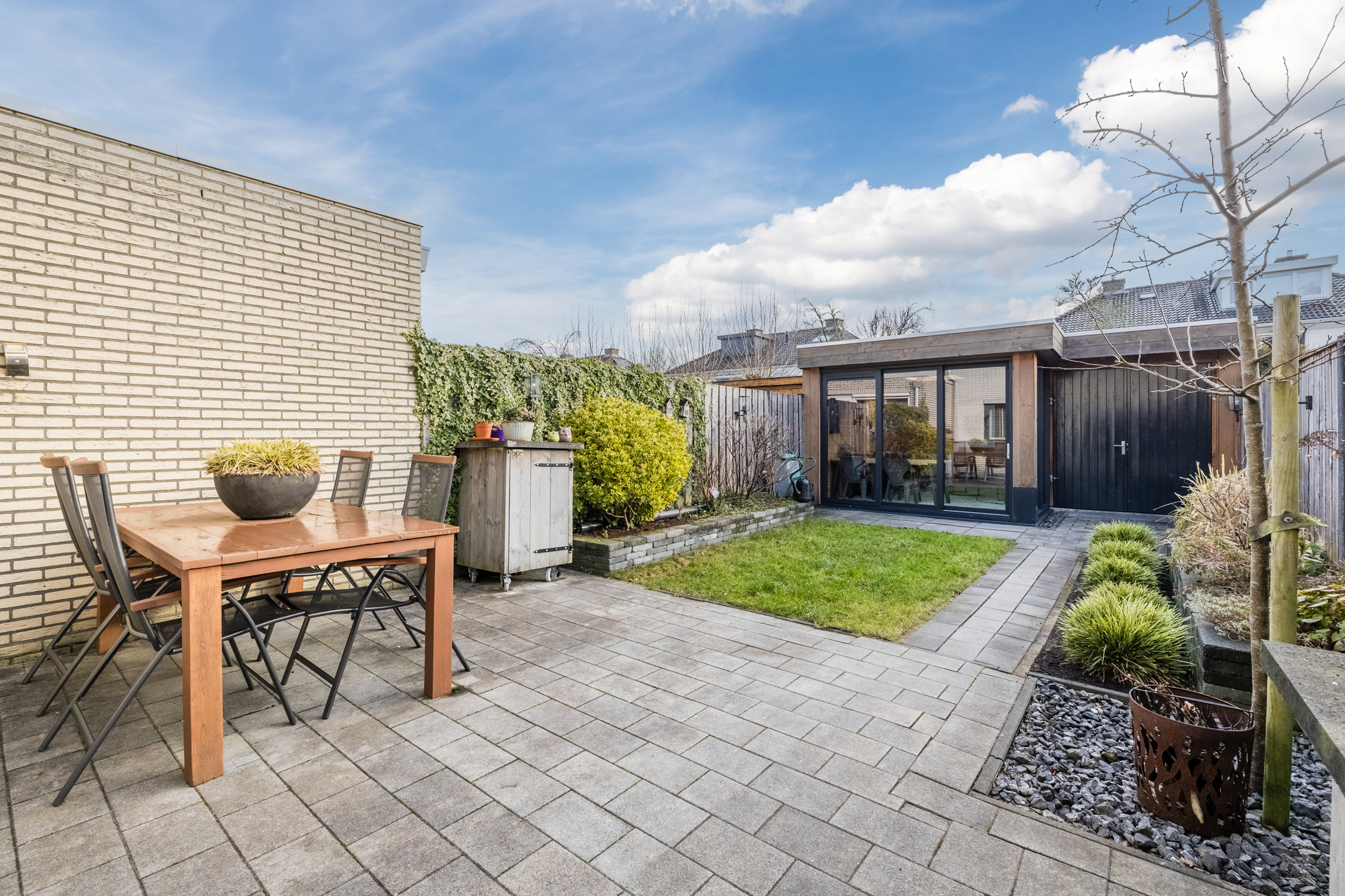 De tuin, aangelegd in 2020, ligt op het oosten. Dit zorgt voor veel zon tot in de middag en in de zomer juist voor aangename schaduw op het terras. Aansluitend bevindt zich de geïsoleerde tuinkamer (2020) met hoog plafond en schuifpui met dubbelglas. Deze ruimte is goed warm te stoken en daardoor geschikt als extra kamer, werkruimte of hobbyruimte.