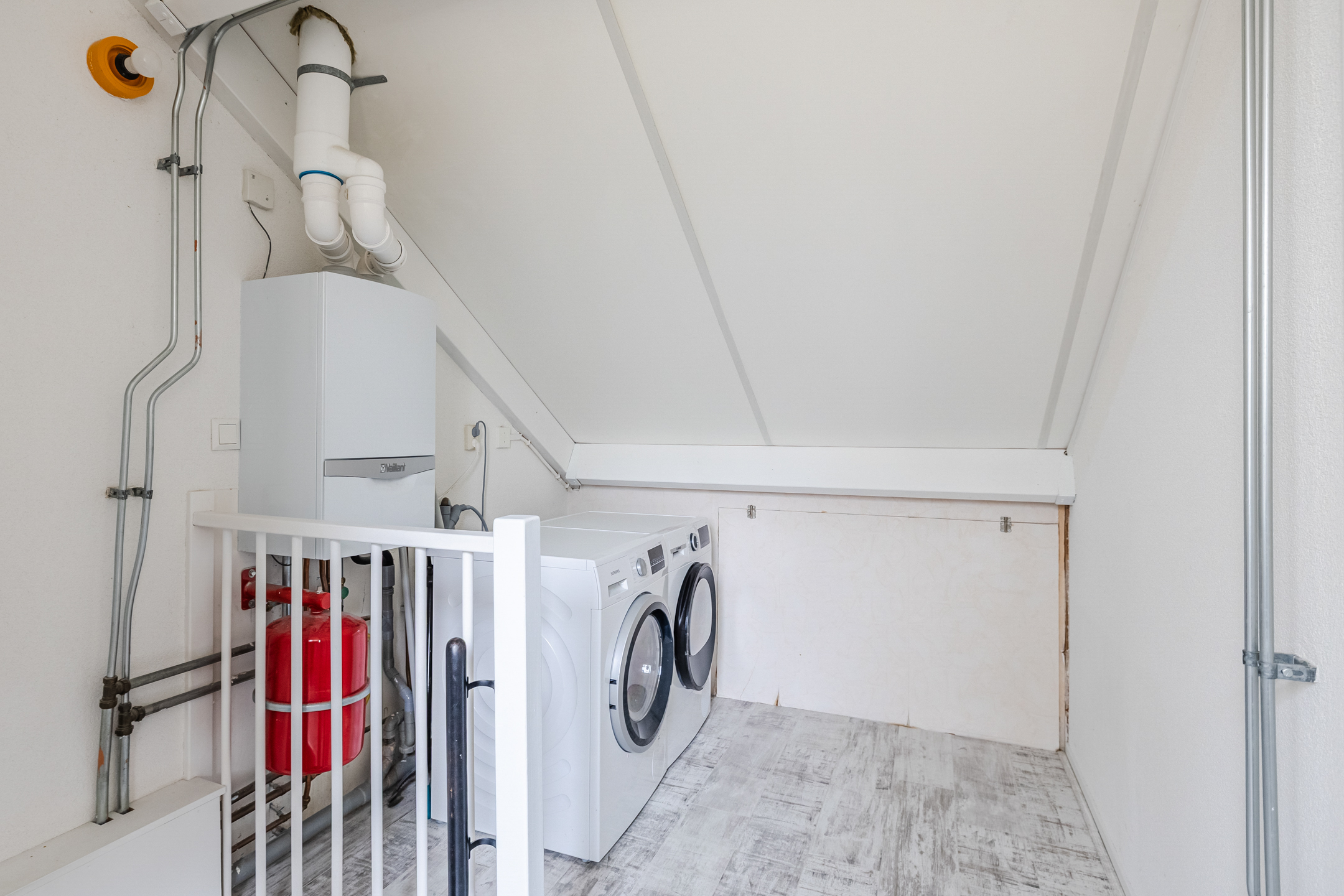 De zolderverdieping biedt plaats aan wasmachine en droger, een vierde ruime slaapkamer en veel bergruimte dankzij vaste kasten en knieschotten.