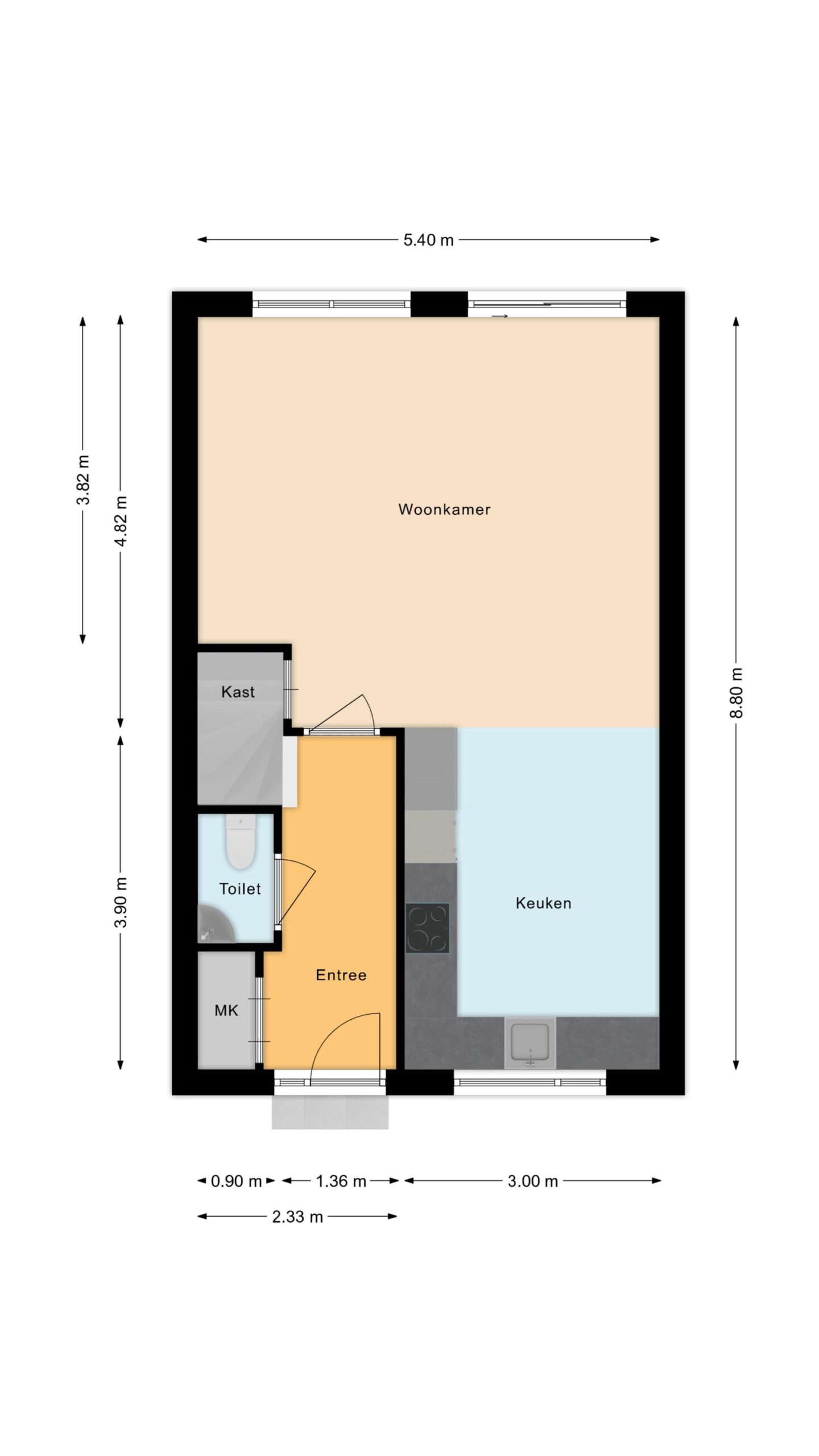 De ruime keuken (2019) beschikt over veel werkblad en is voorzien van oven, magnetron, koel-vriescombinatie en vaatwasser. De lichte woonkamer heeft een grote schuifpui waardoor je in de zomer zo het terras op loopt en de tuin echt bij het wonen wordt betrokken.