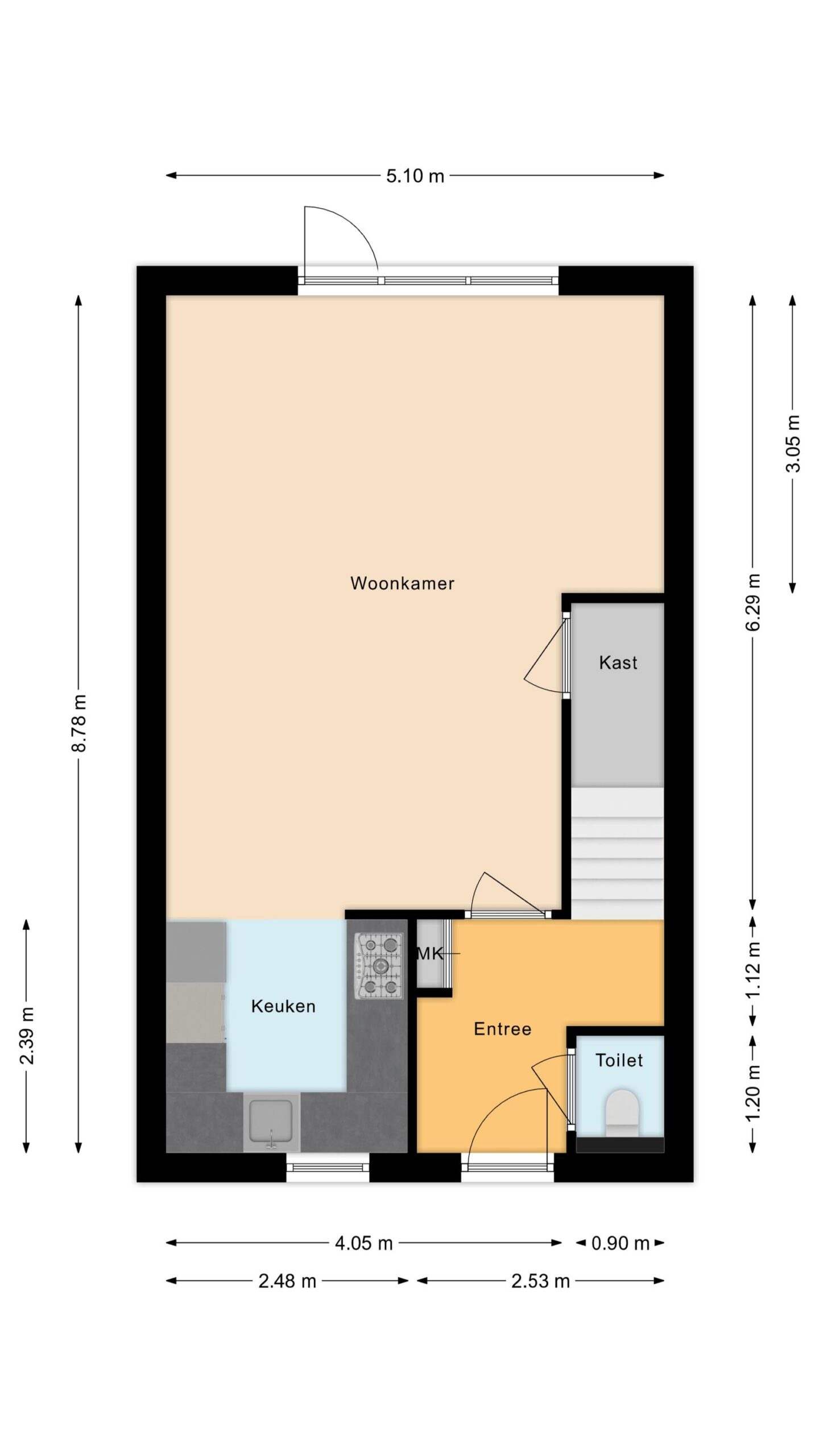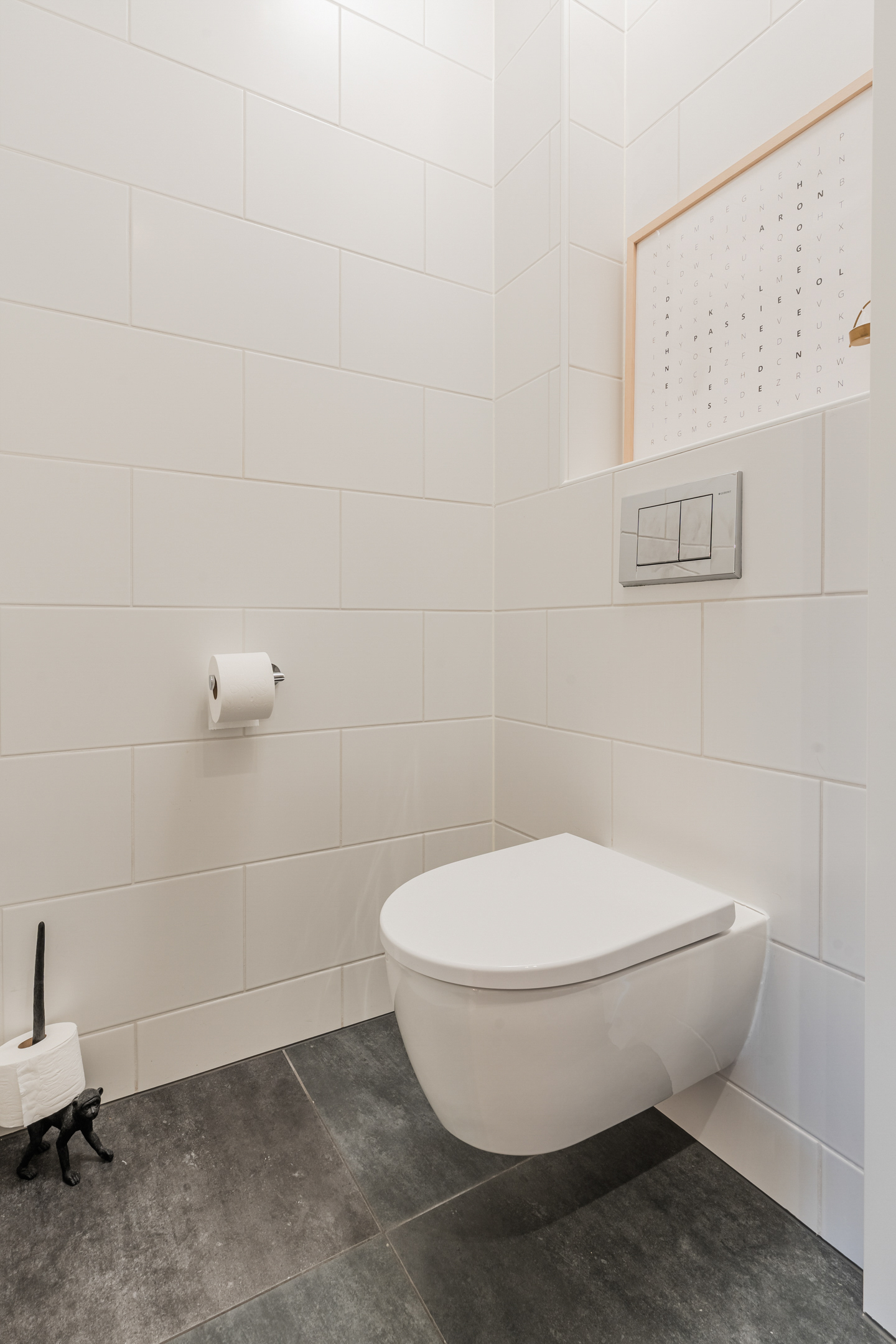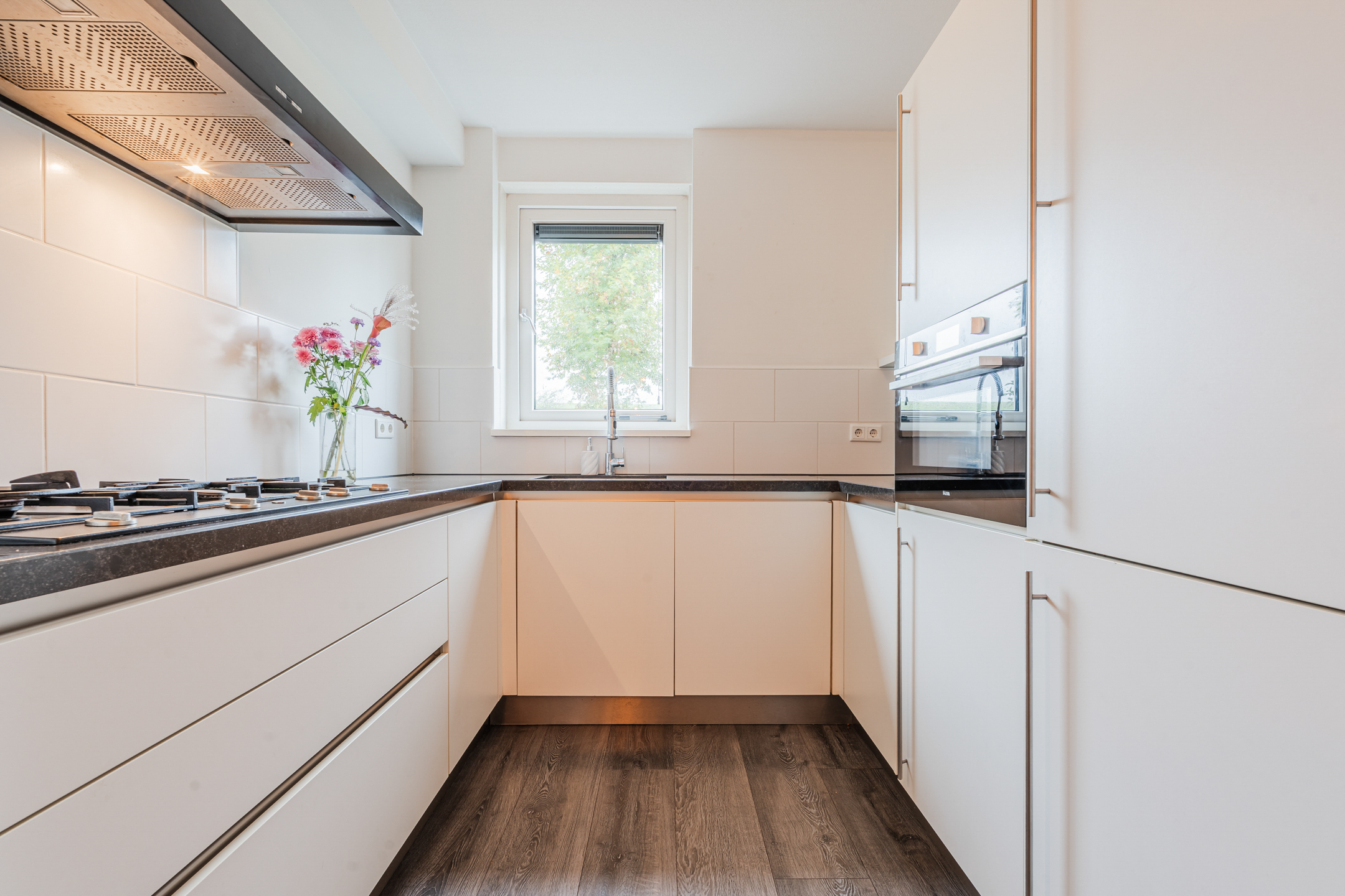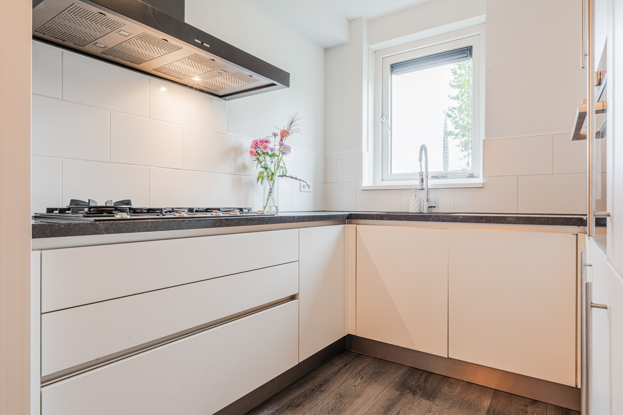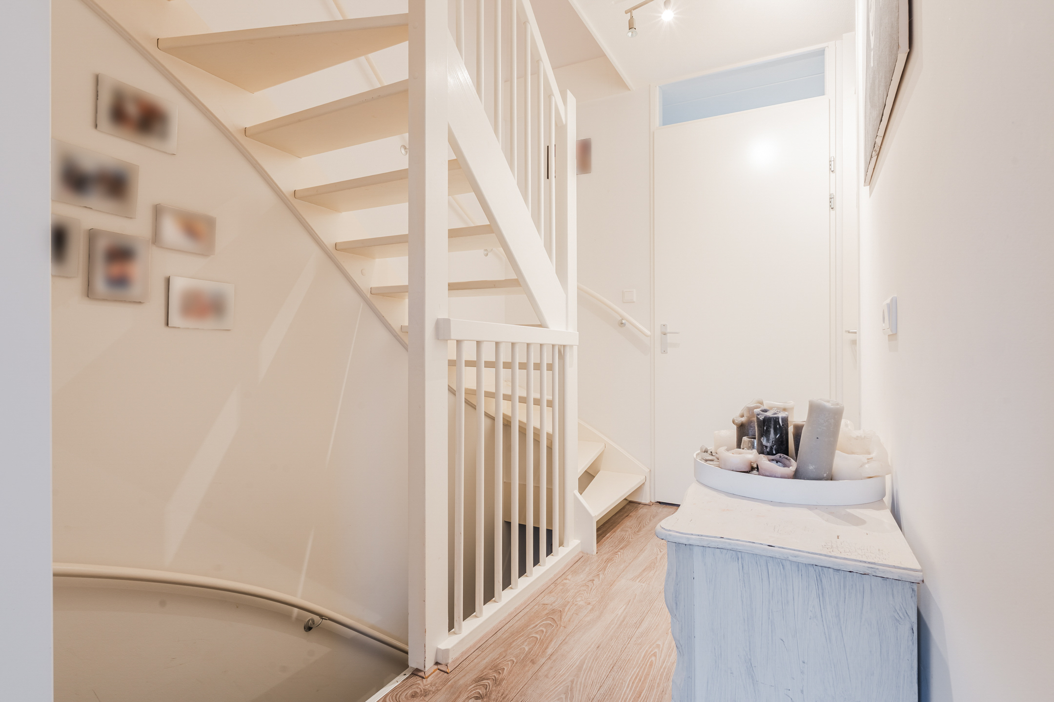 Entree met meterkast en toilet, lichte woonkamer met grote raampartijen, open keuken met allerlei wenselijk inbouwapparatuur en deur naar de achtertuin. De begane grond is voorzien van een nette vloer- en wandafwerking.