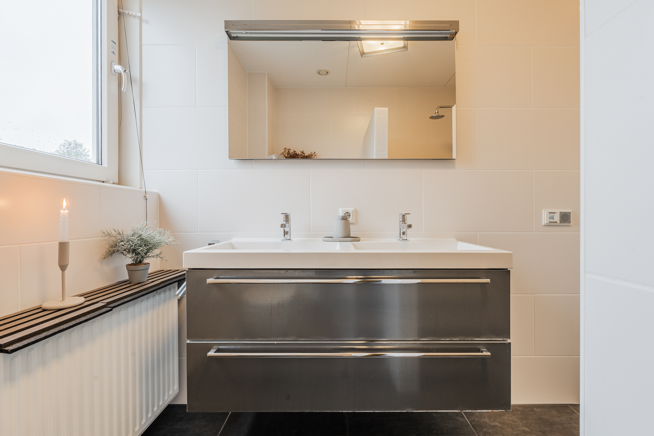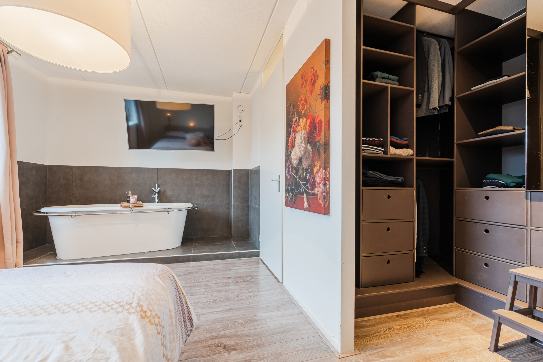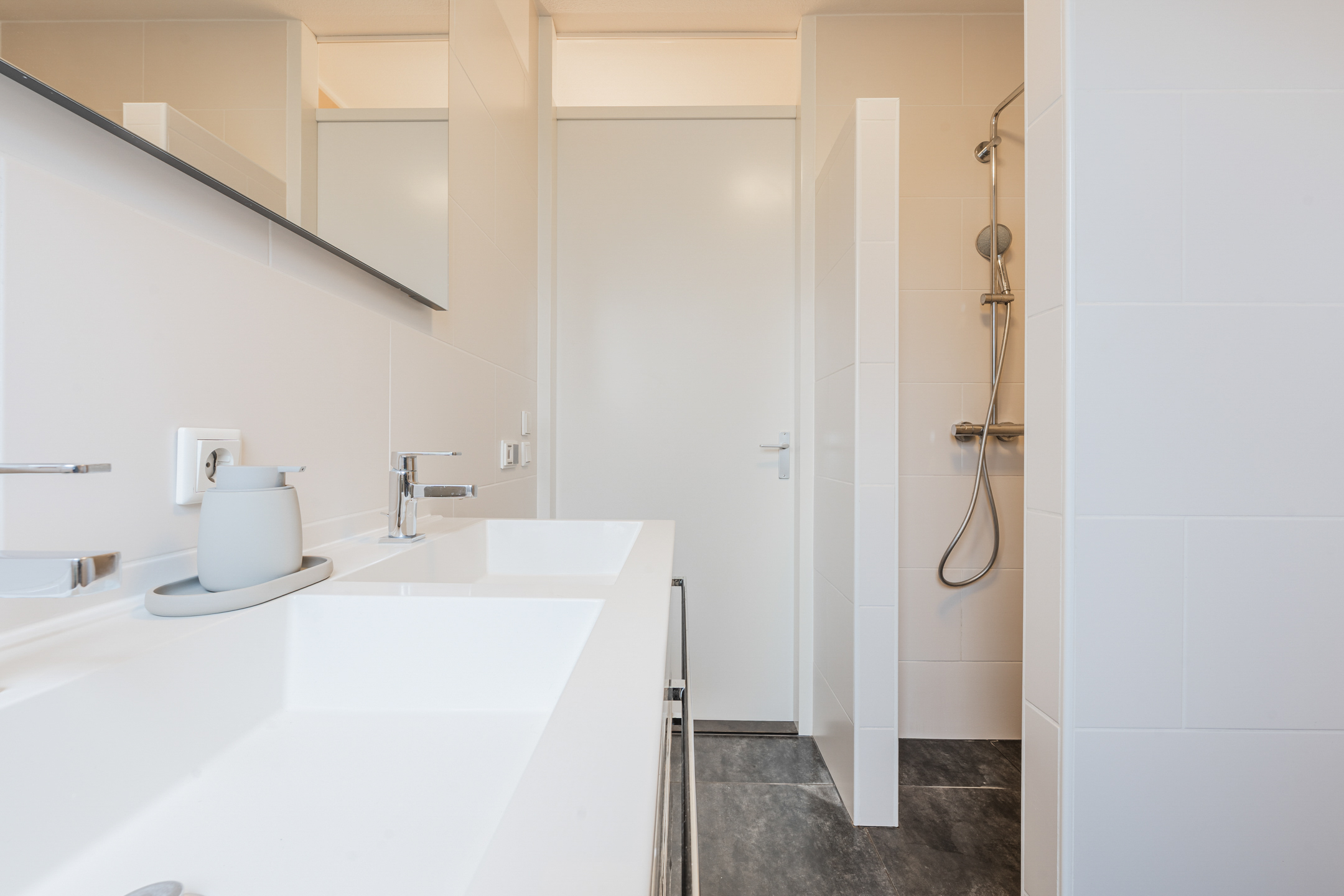 Overloop met toegang tot twee slaapkamers waarvan 1 voorzien van bad en ruime ‘walk in closet’. Badkamer met toilet, douche, dubbele wastafel en wastafelmeubel.