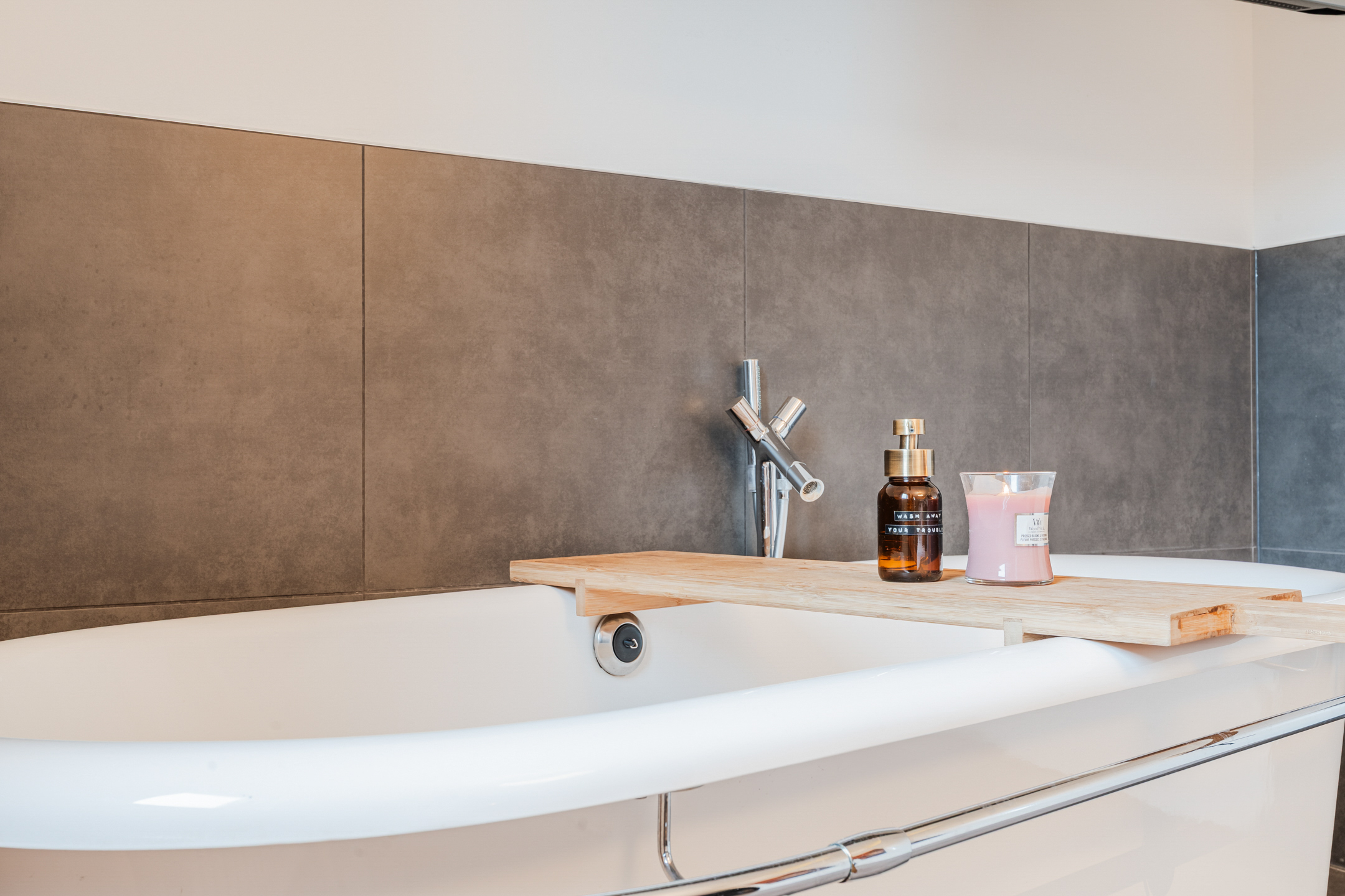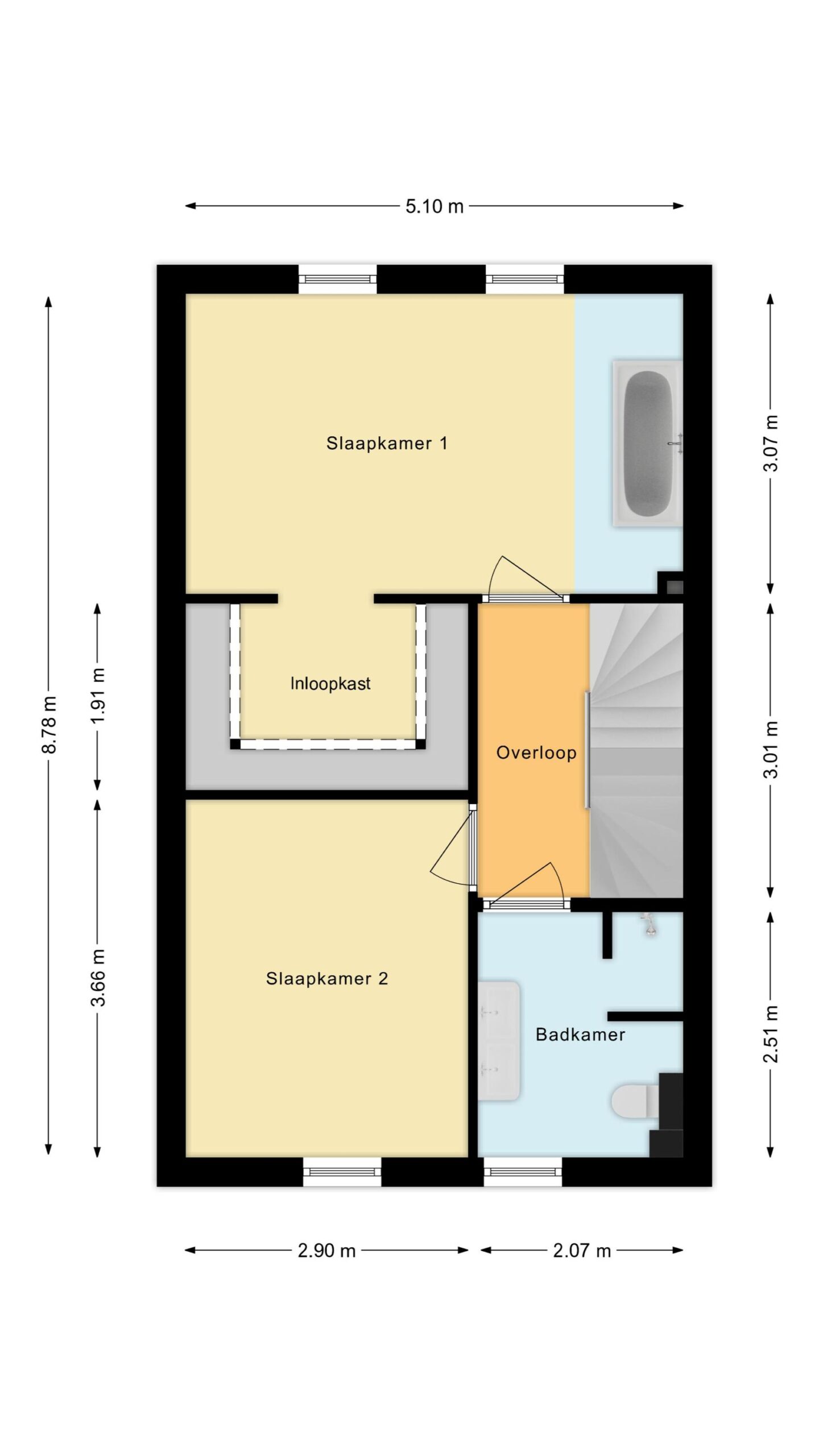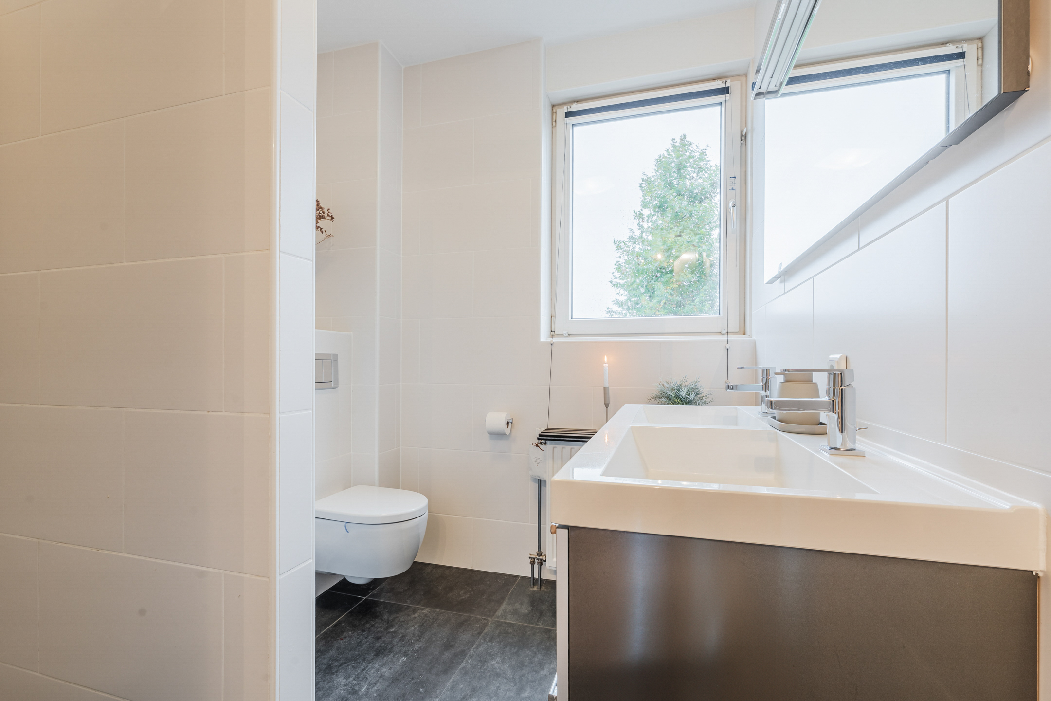 Overloop met toegang tot twee slaapkamers waarvan 1 voorzien van bad en ruime ‘walk in closet’. Badkamer met toilet, douche, dubbele wastafel en wastafelmeubel.