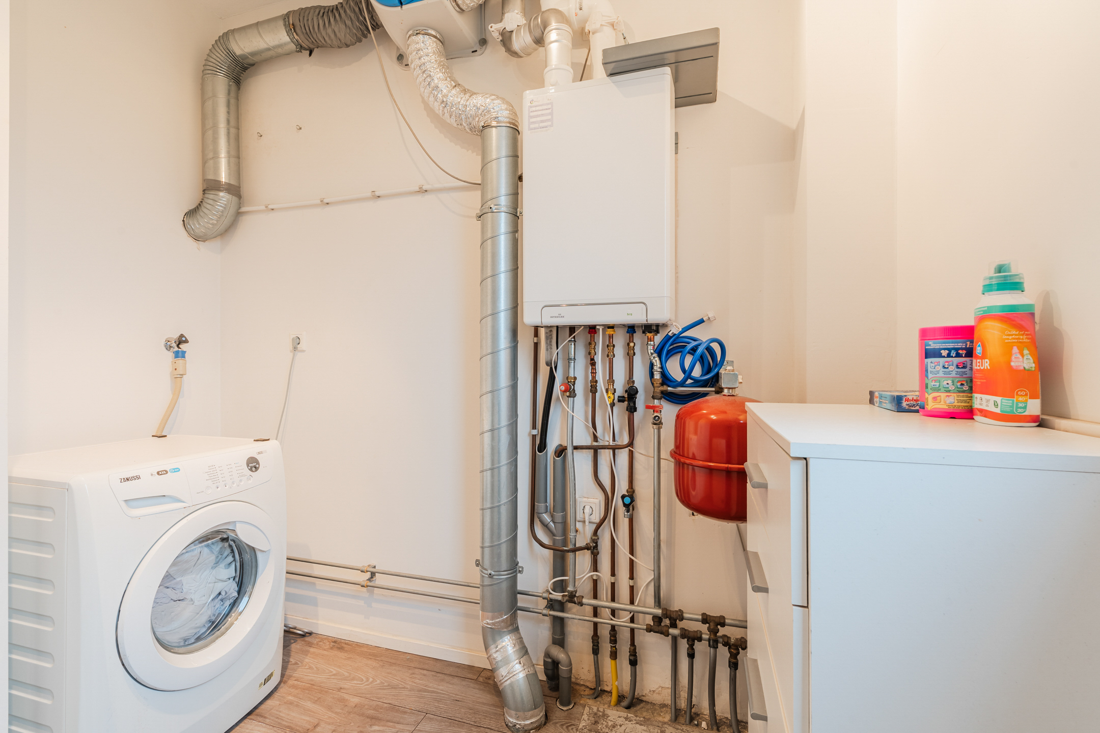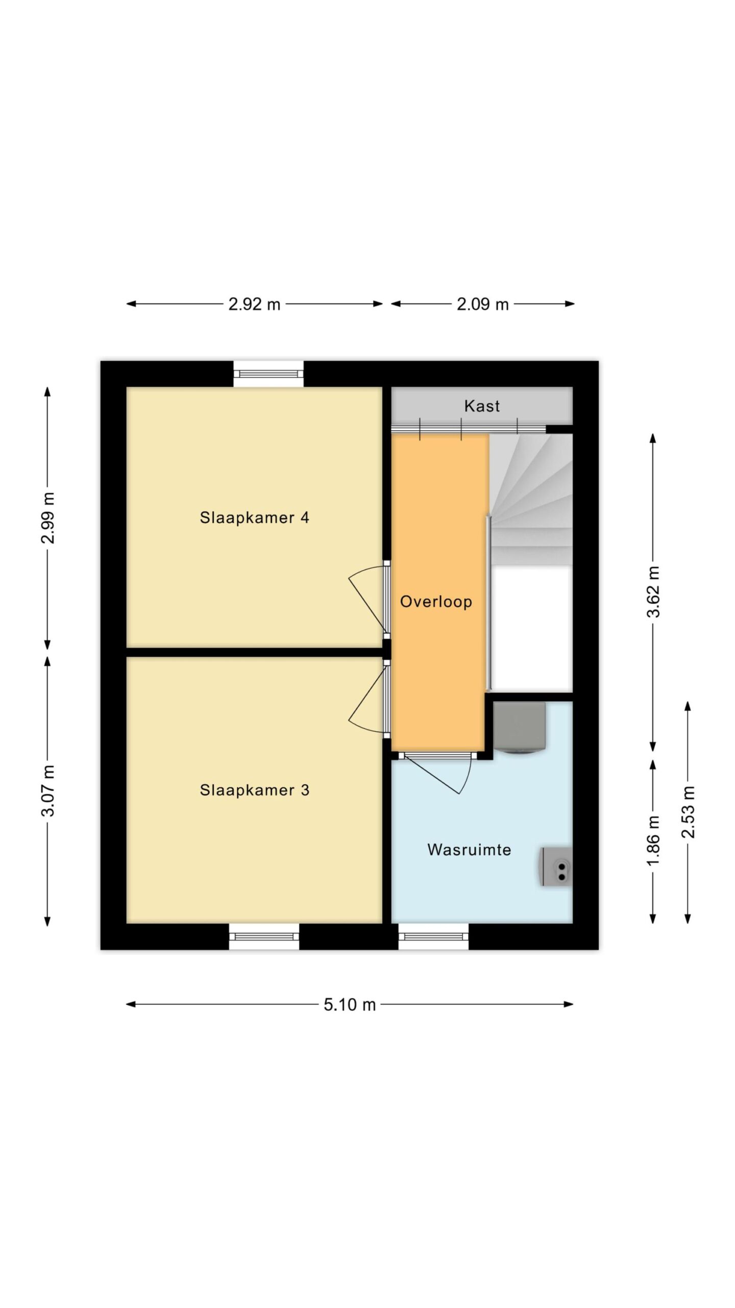 Vaste trap naar de overloop met twee slaapkamers, wasruimte en berging.