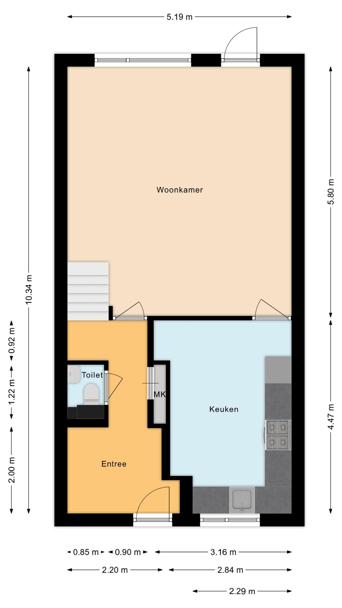 De keuken biedt zelfs de mogelijkheid om de muur naar de woonkamer te verwijderen, waardoor eenvoudig een open keuken gerealiseerd kan worden.