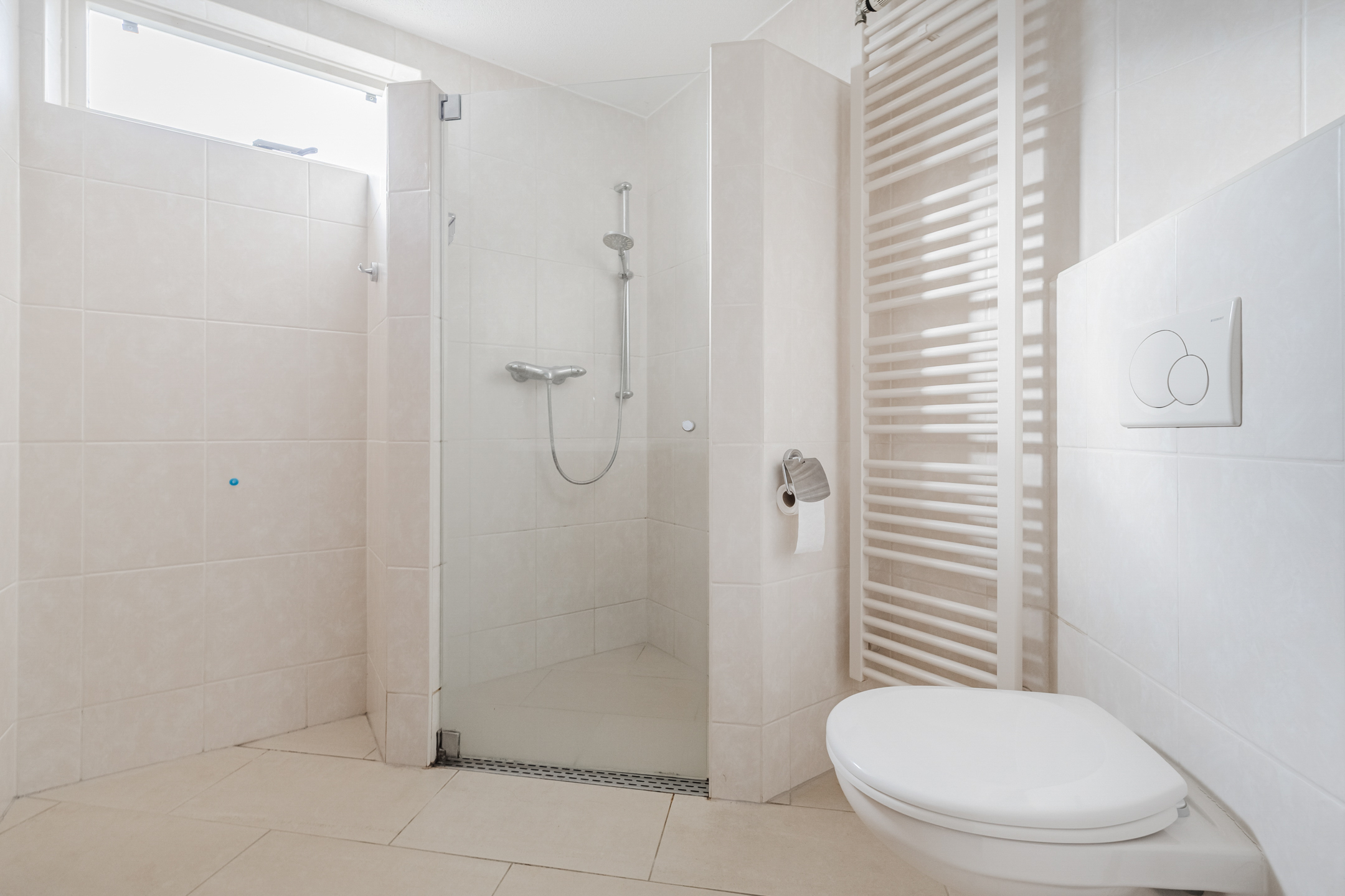 De badkamer is compleet ingericht met een douchehoek, toilet, wastafelmeubel en designradiator