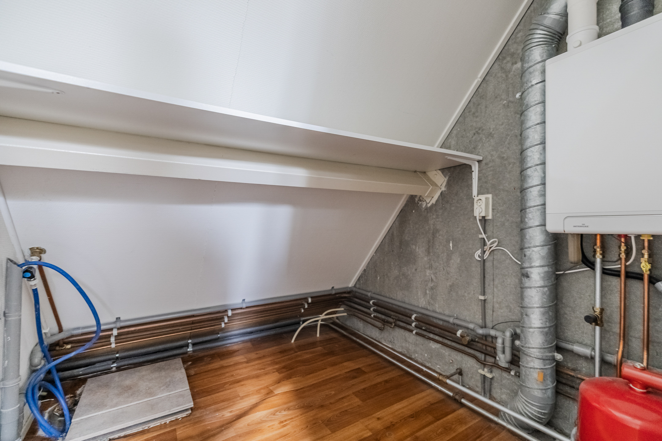 Overloop met voldoende bergruimte en de CV-ketel (2021), mechanische ventilatie en witgoedaansluiting.