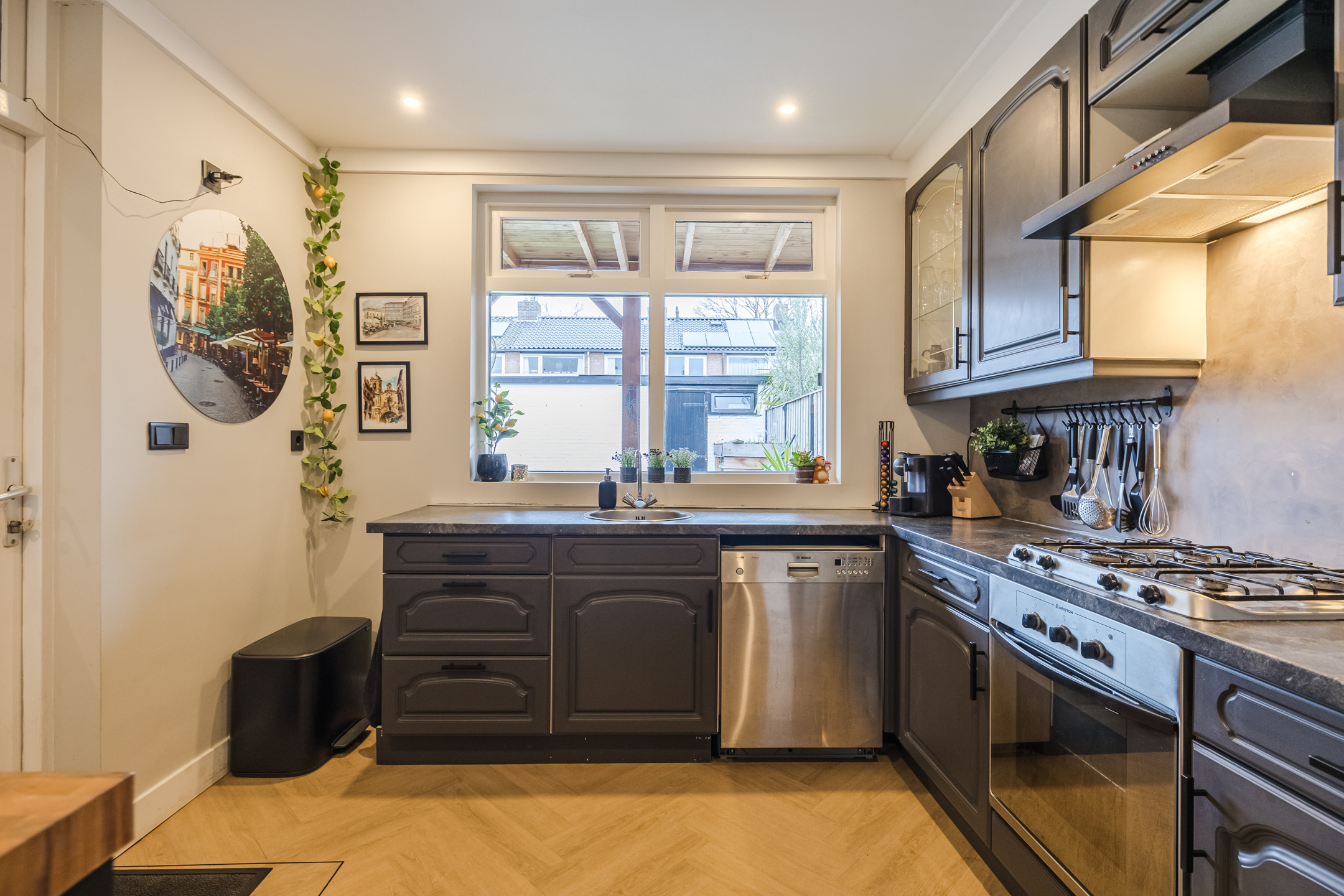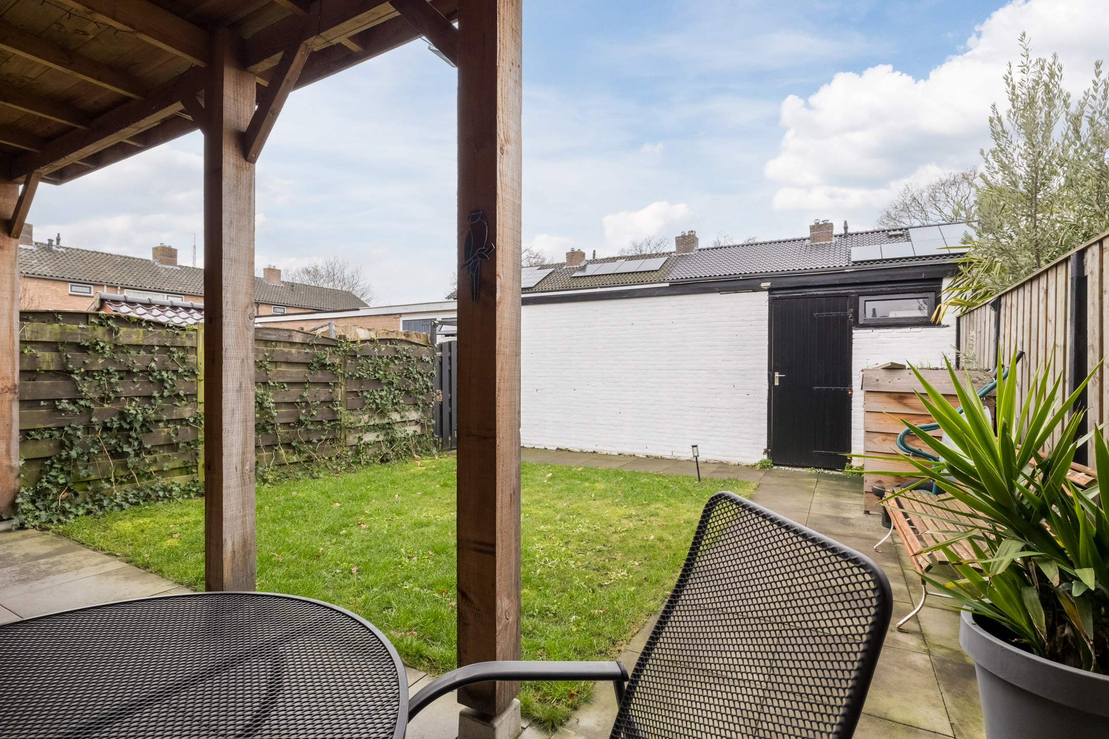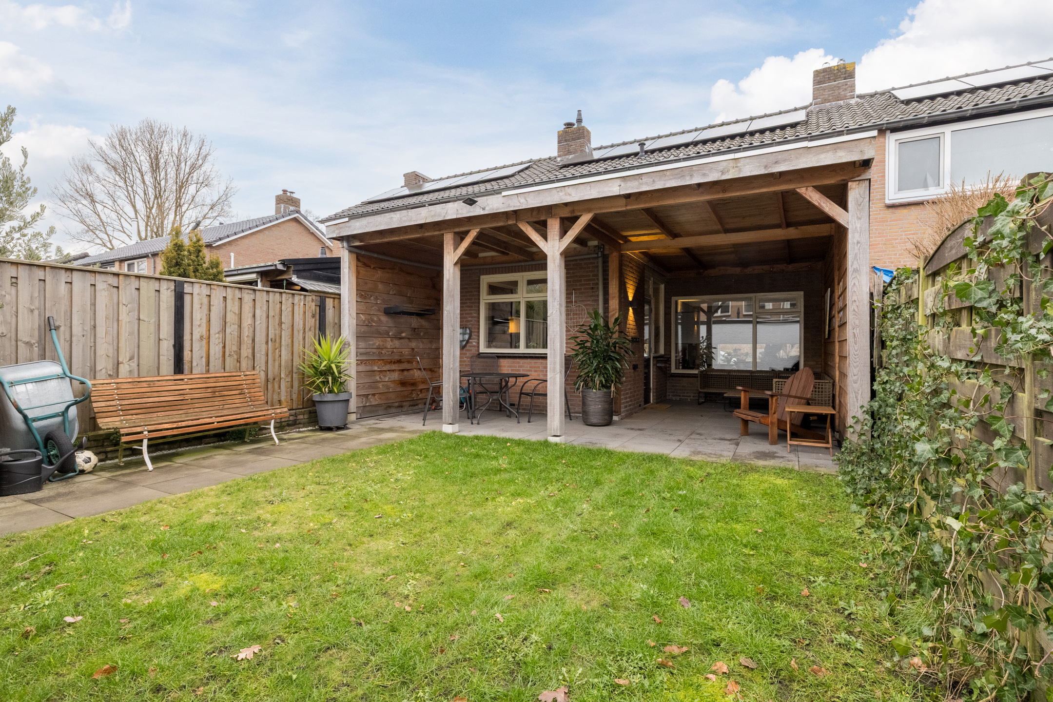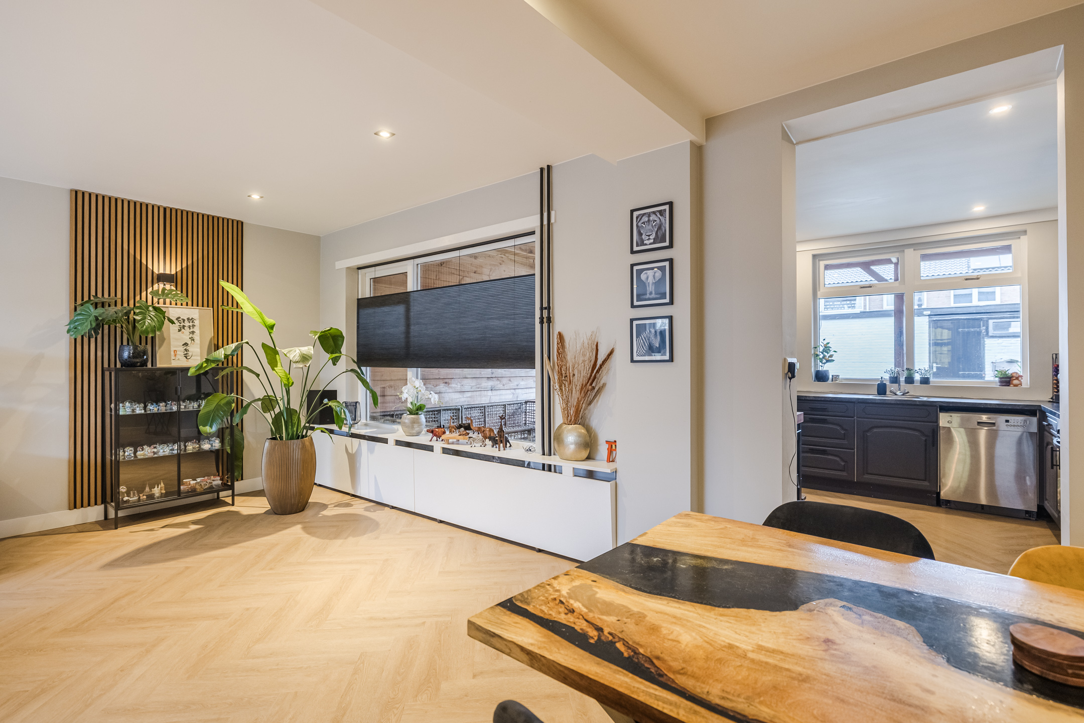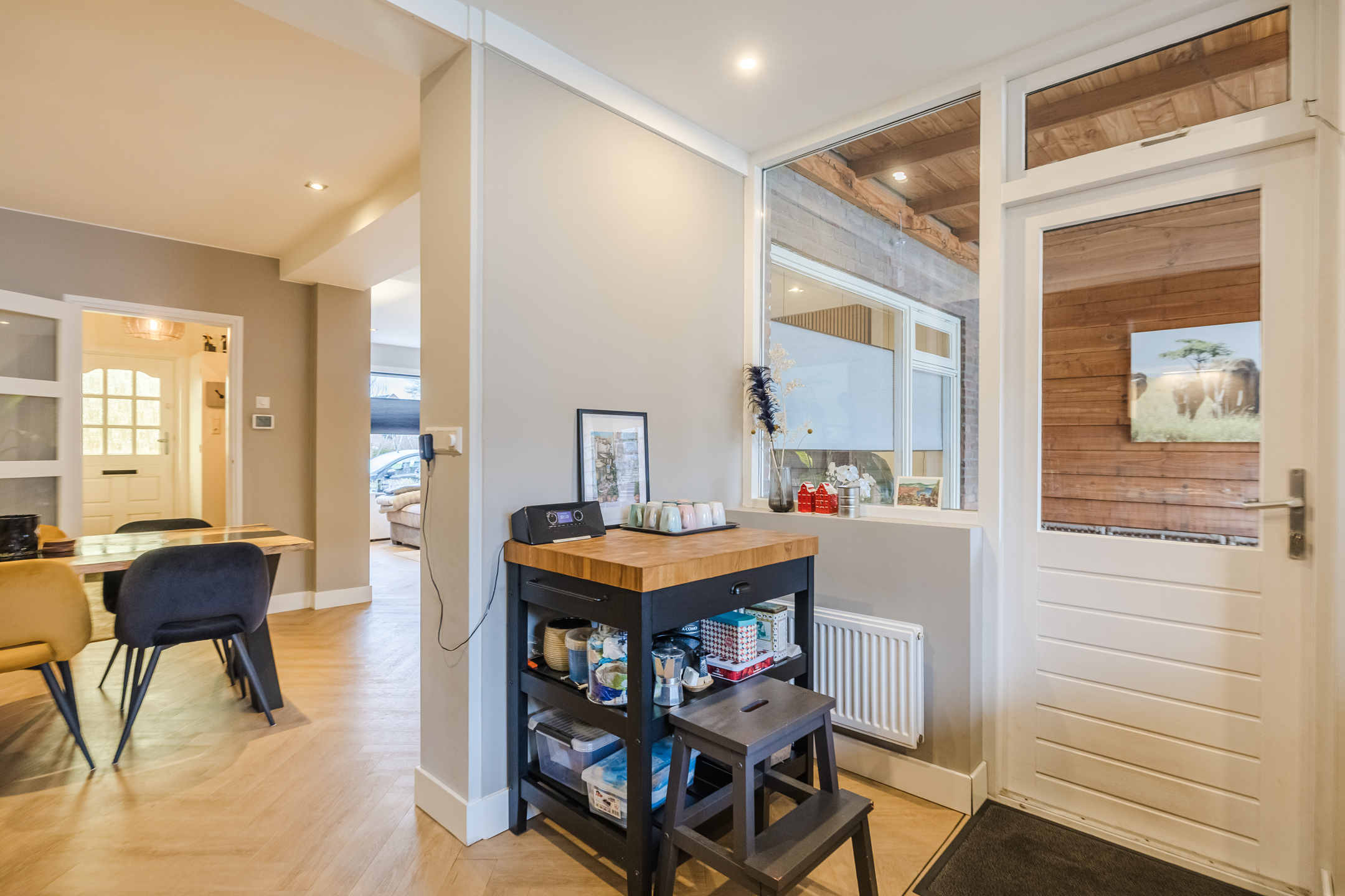 Entree met vernieuwd toilet, provisiekelder en vernieuwde en uitgebreide meterkast, woonkamer met fraaie PVC-vloer, in visgraad gelegd en glad gestucte wanden, de aangebouwde keuken met eenvoudige keukenopstelling is voorzien van enig inbouwapparatuur. Vanuit de keuken kom je in de op het westen gelegen tuin met een ruime overkapping en achterom.