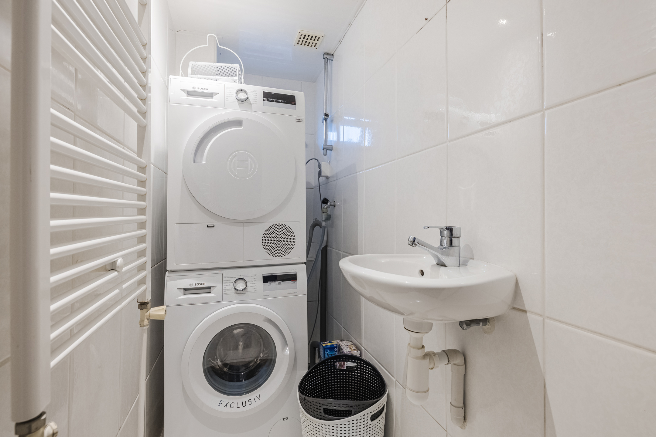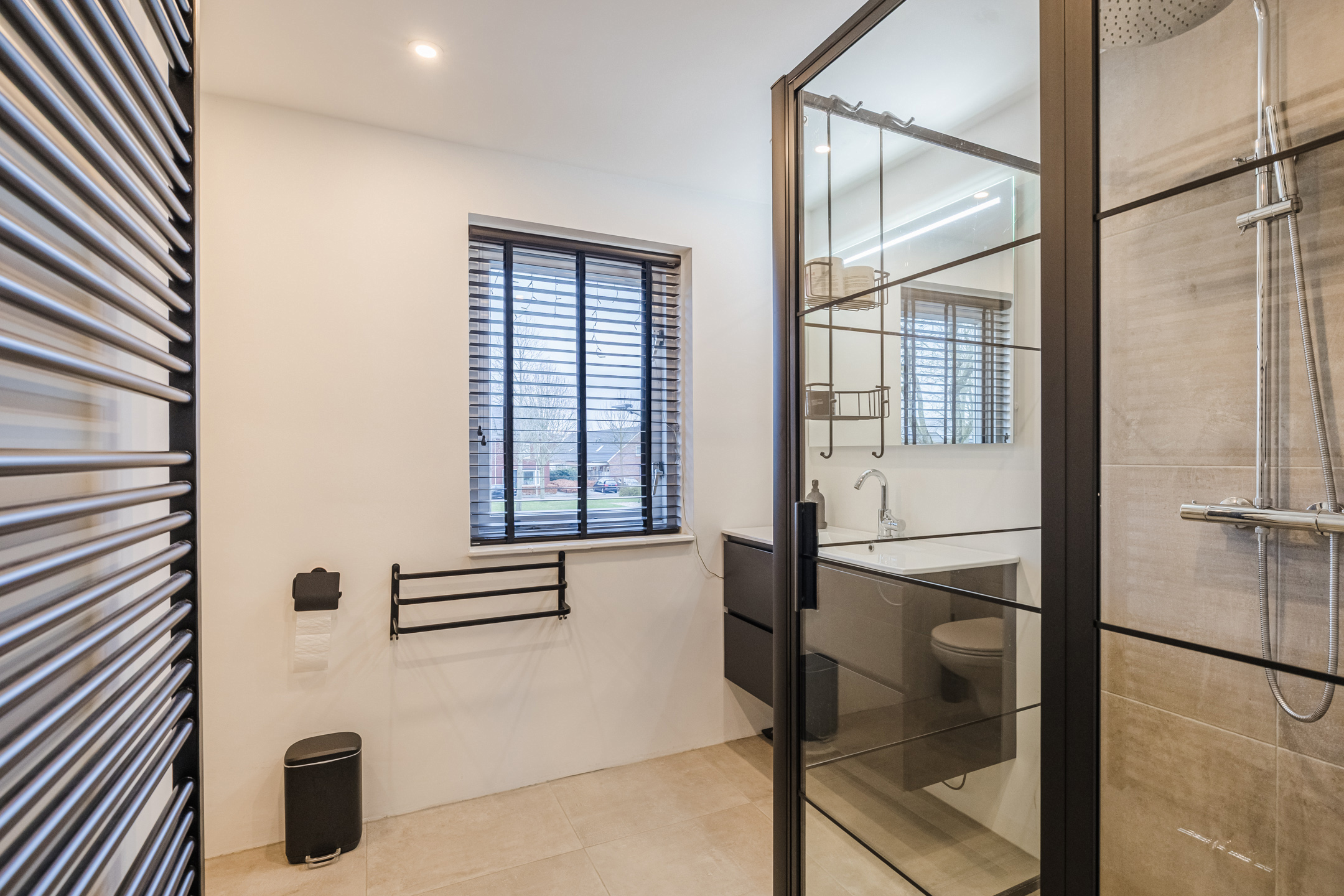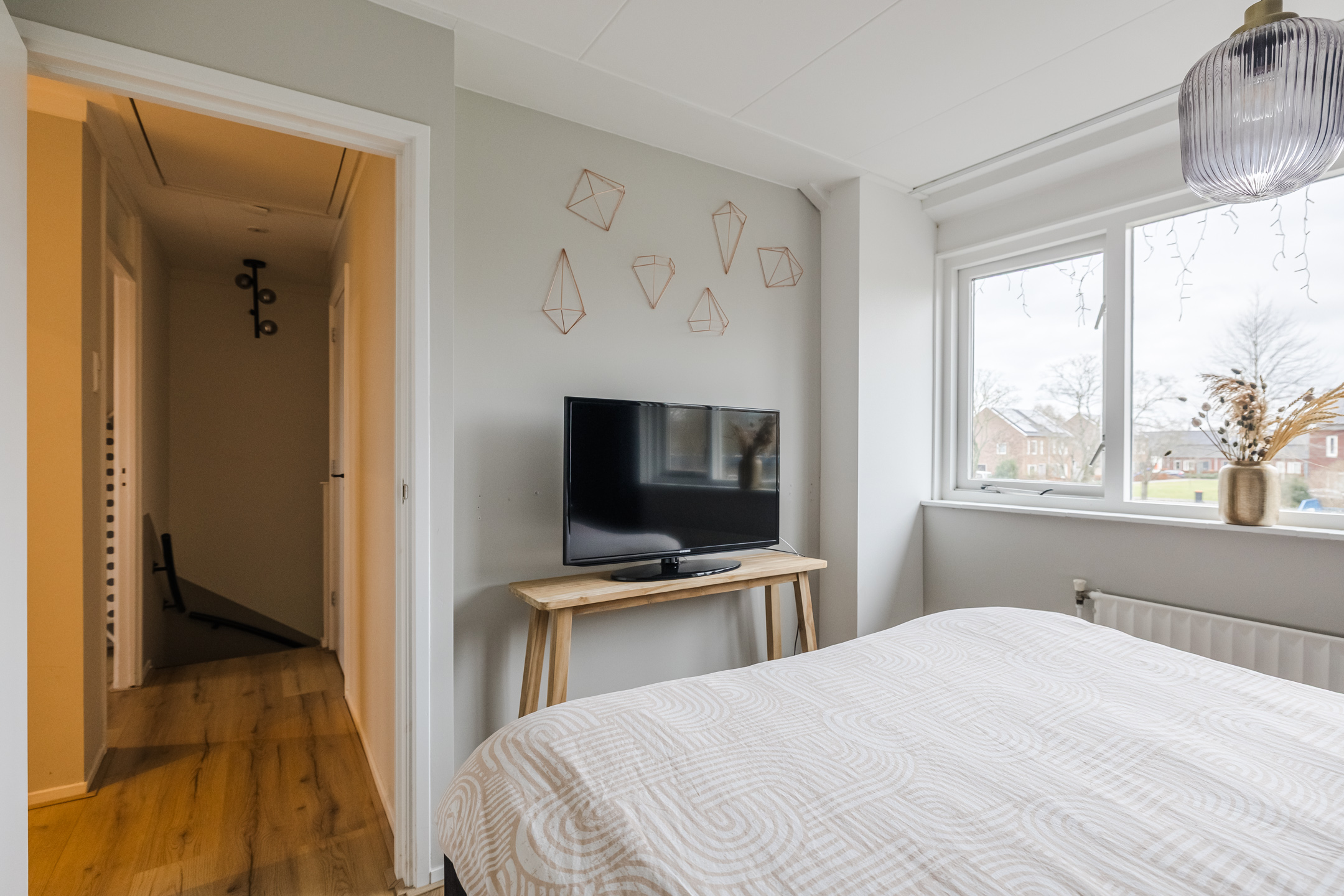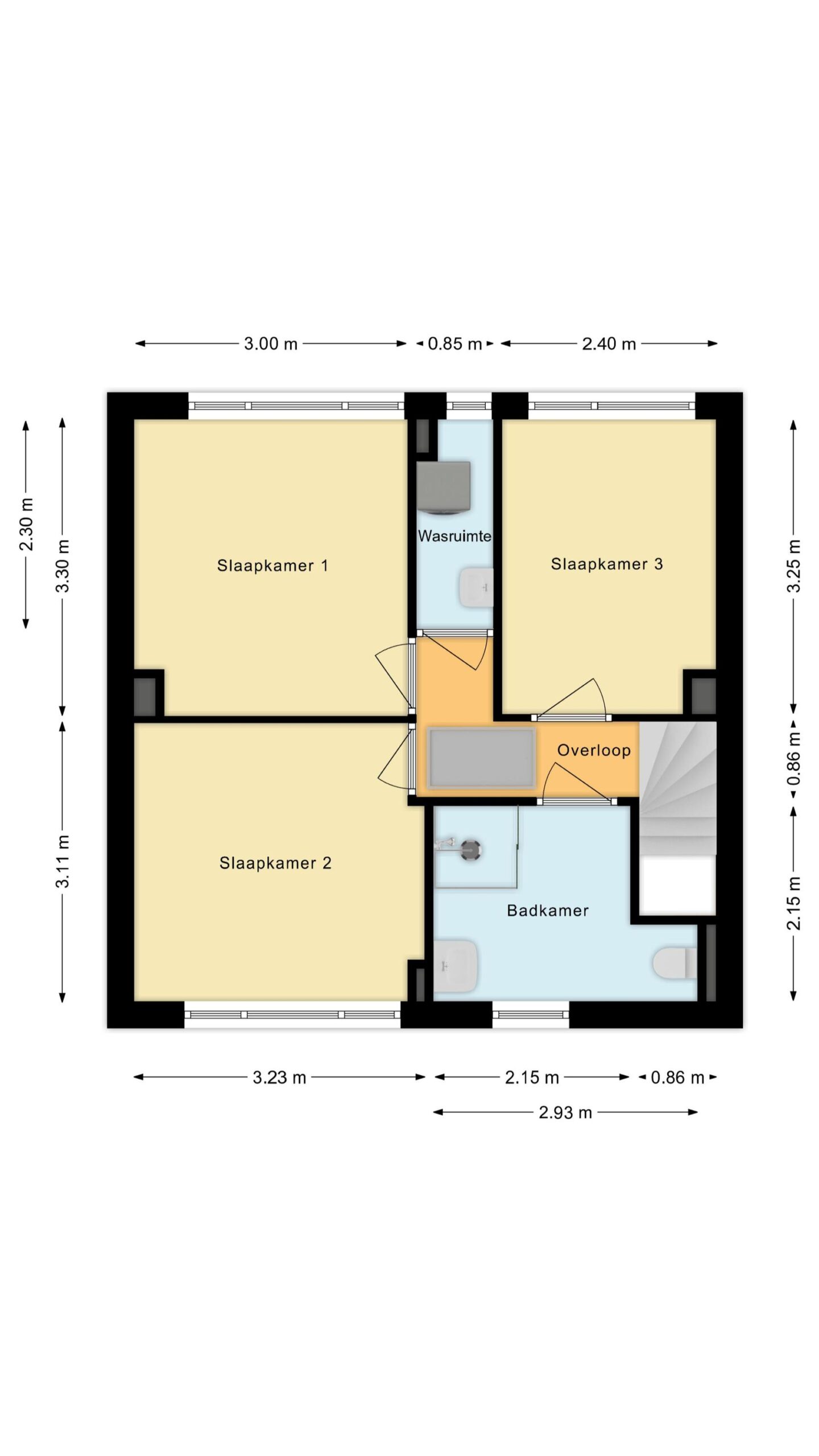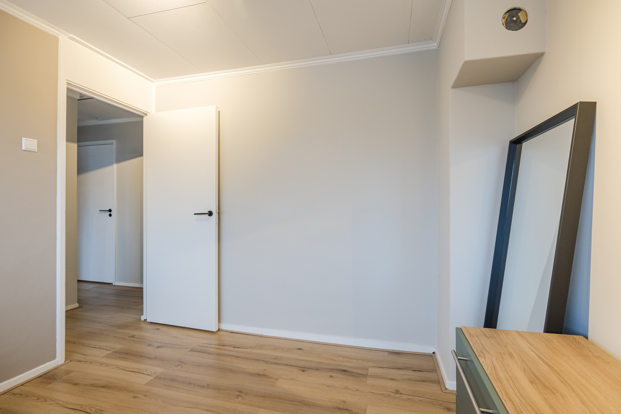 Overloop met wasruimte, 3 slaapkamers en een vernieuwde badkamer met inloopdouche, toilet en badkamermeubel. De verdieping is voorzien van laminaat en de wanden zijn glad gestuct.