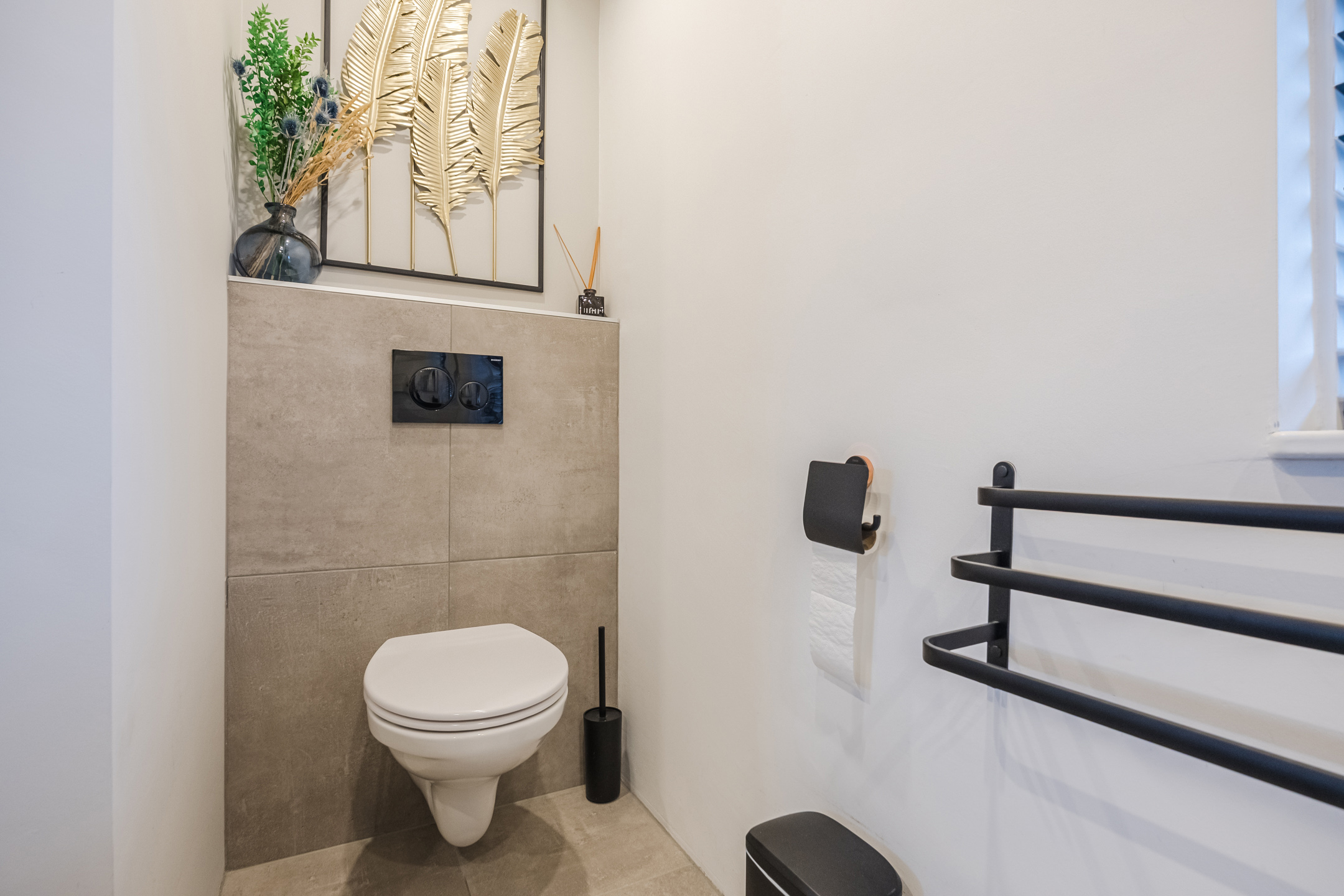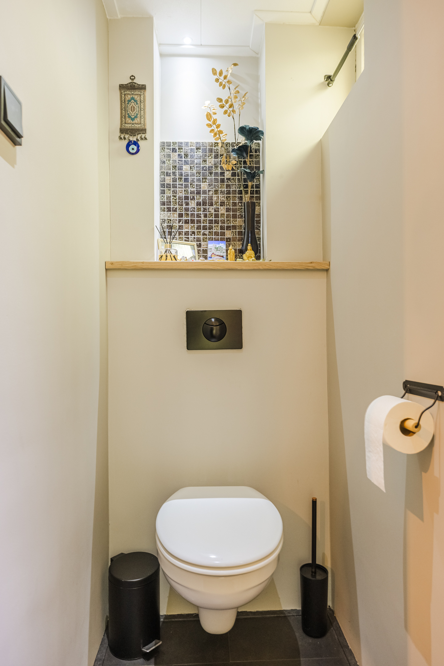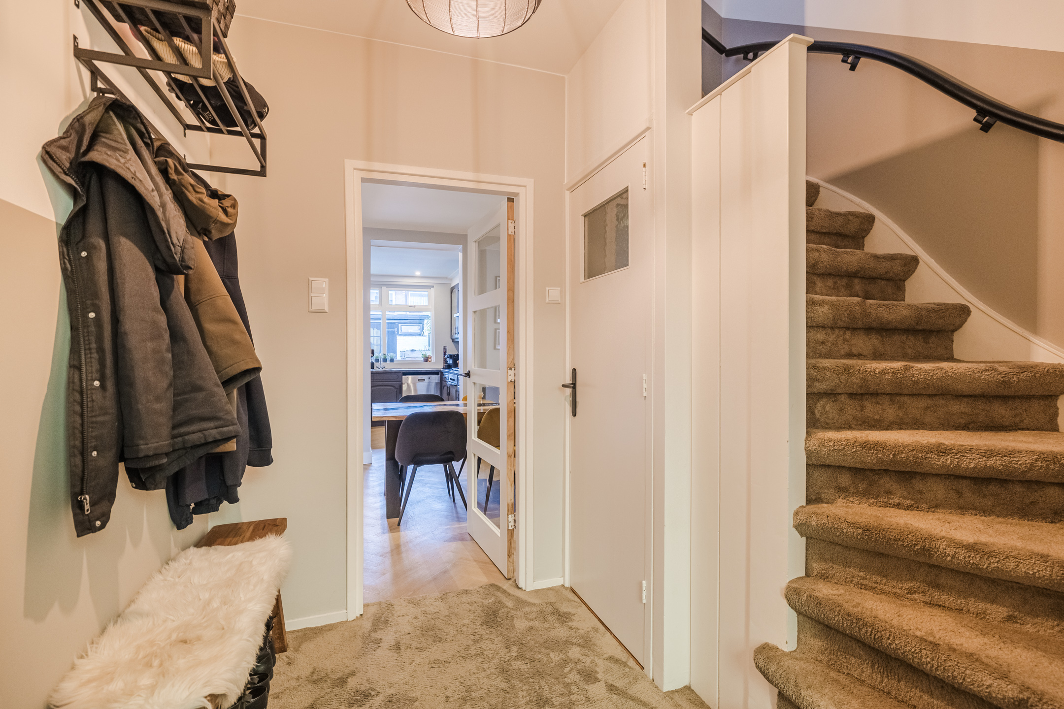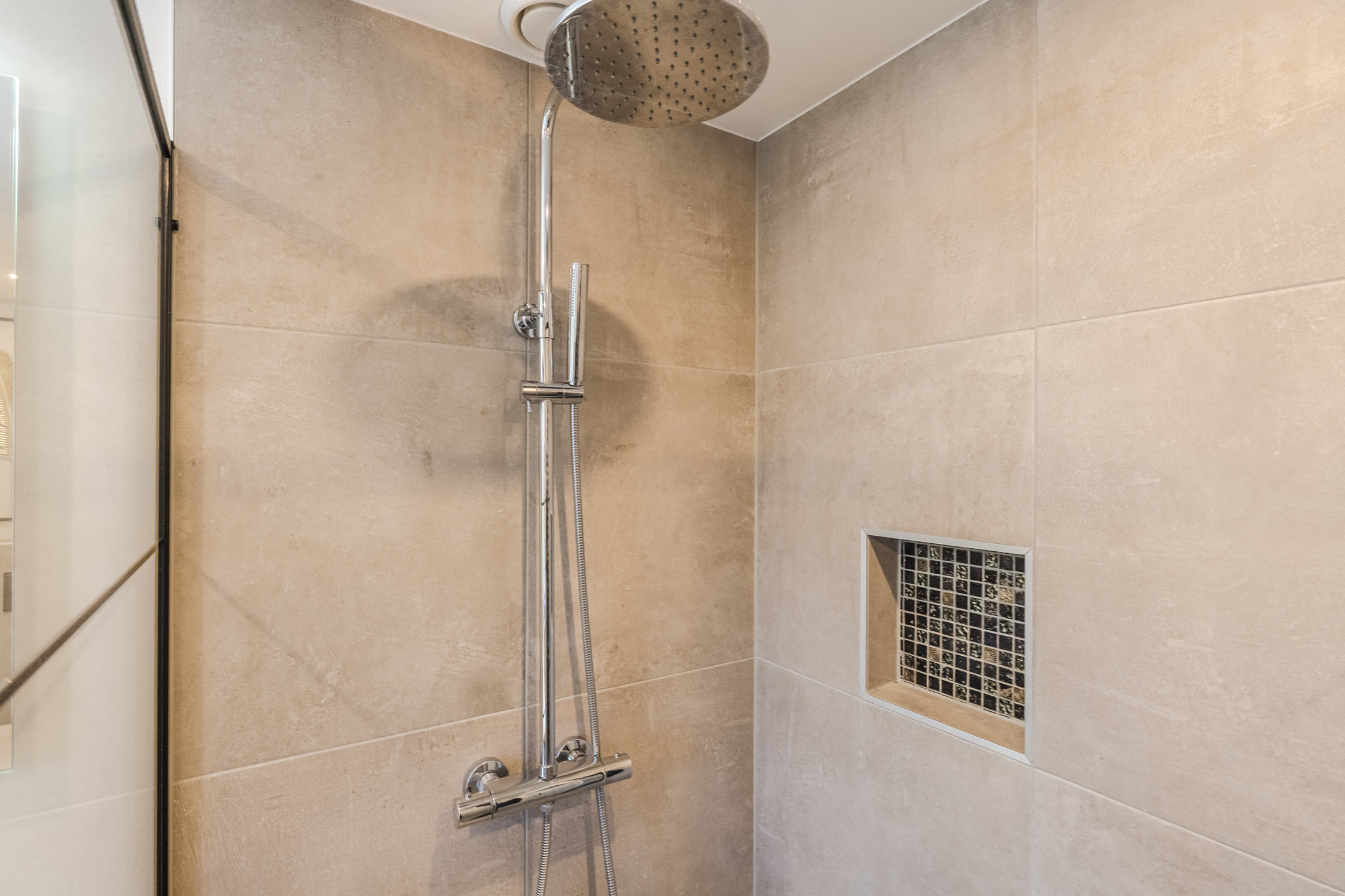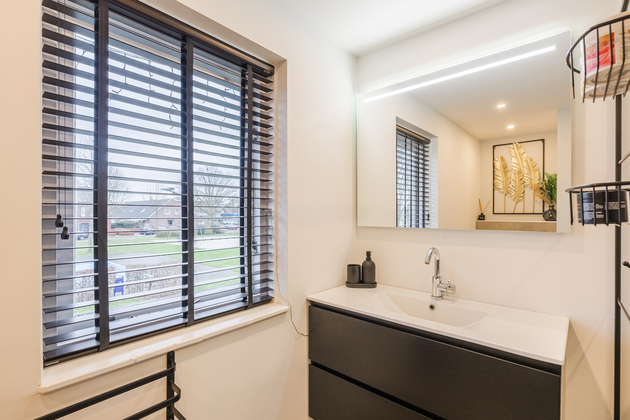 Overloop met wasruimte, 3 slaapkamers en een vernieuwde badkamer met inloopdouche, toilet en badkamermeubel. De verdieping is voorzien van laminaat en de wanden zijn glad gestuct.