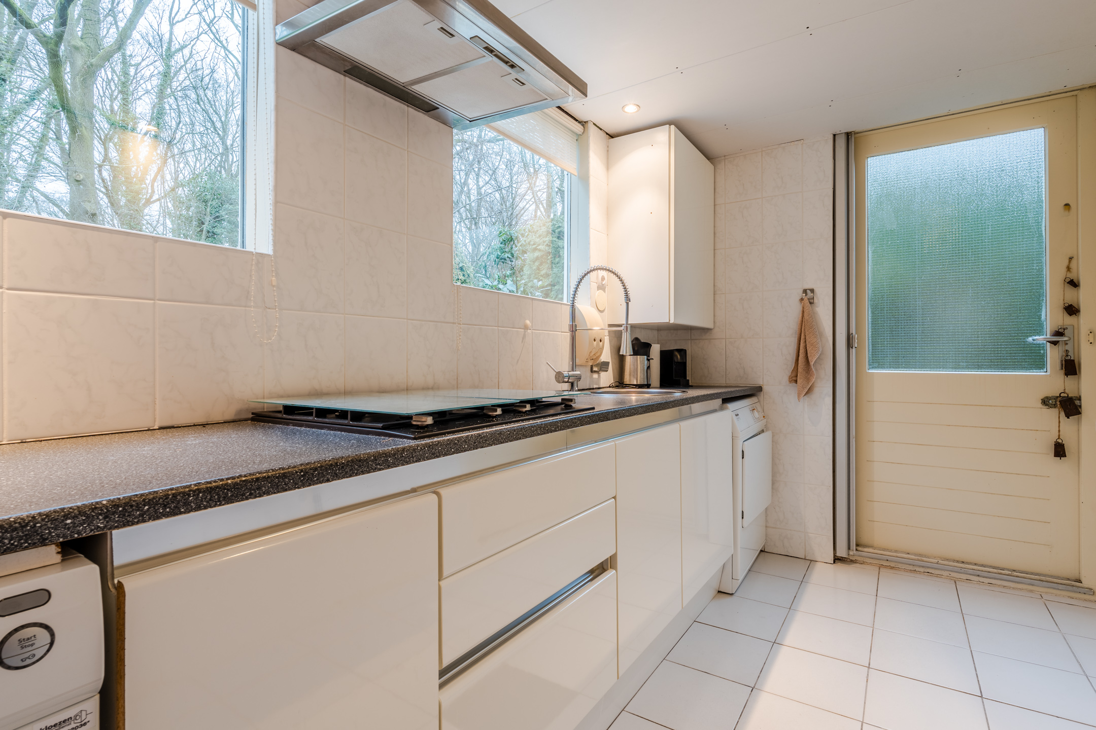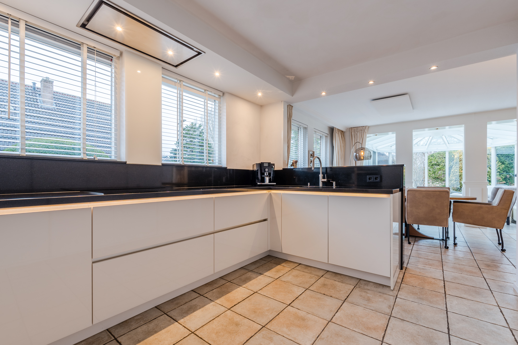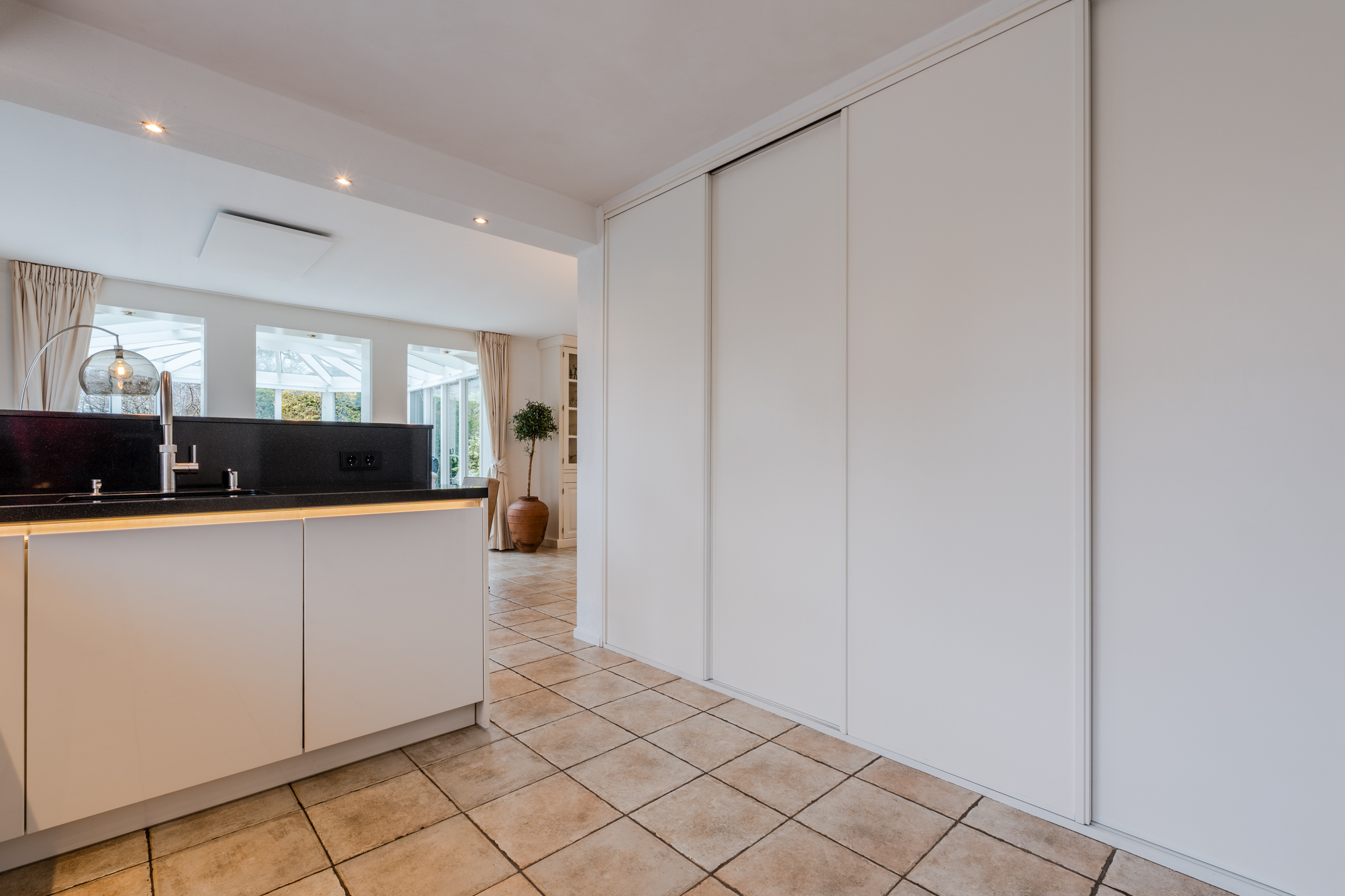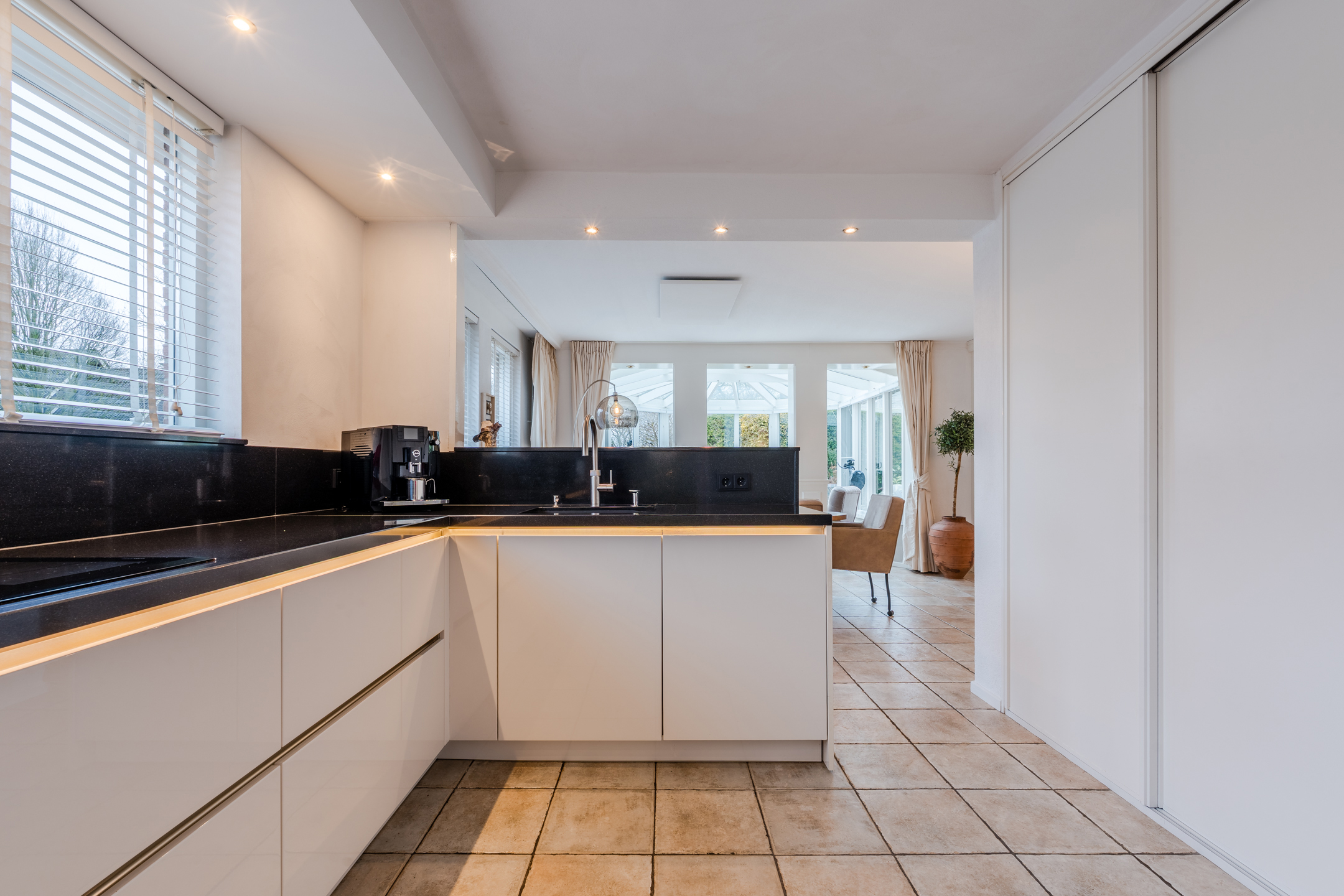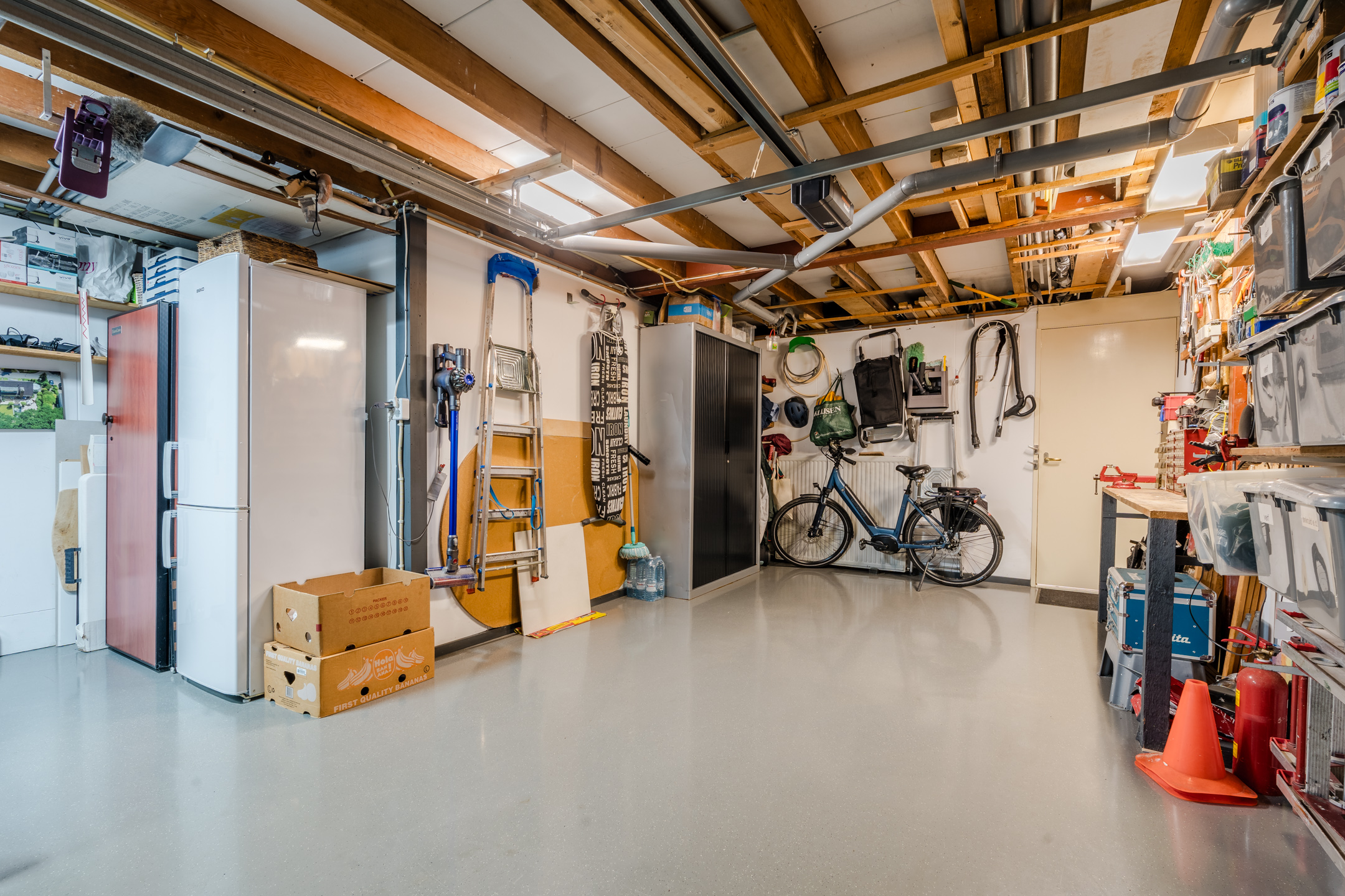 Vanuit de entree kom je tevens in de ruime aangebouwde en geïsoleerde garage met een gecoate vloer en elektrische overheaddeur, in de garage tref je tevens de bijkeuken aan met een keurig keukenblok en de witgoedaansluitingen.