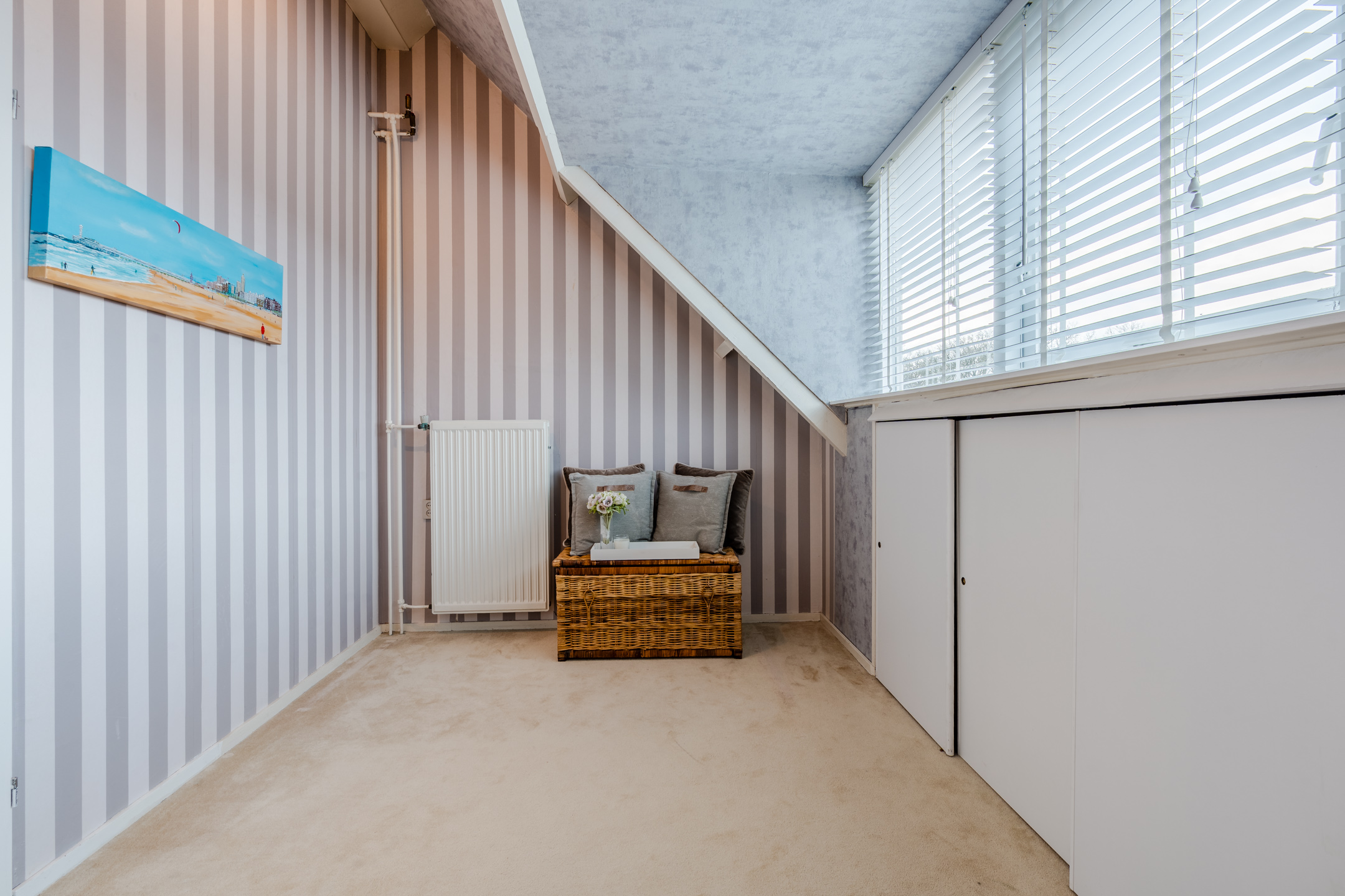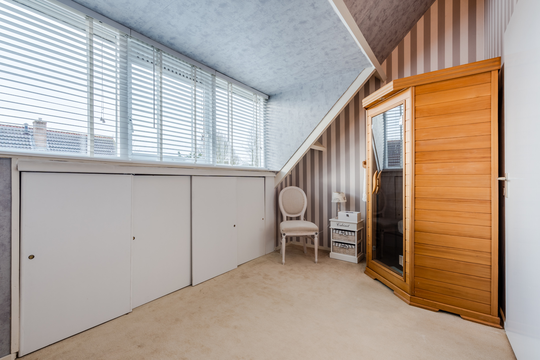Overloop met een berging/CV-ruimte, 3 ruime slaapkamers waarvan een met een dakkapel en een met een kastenwand en een badkamer met dakkapel, badkamermeubel, toilet en een douche.