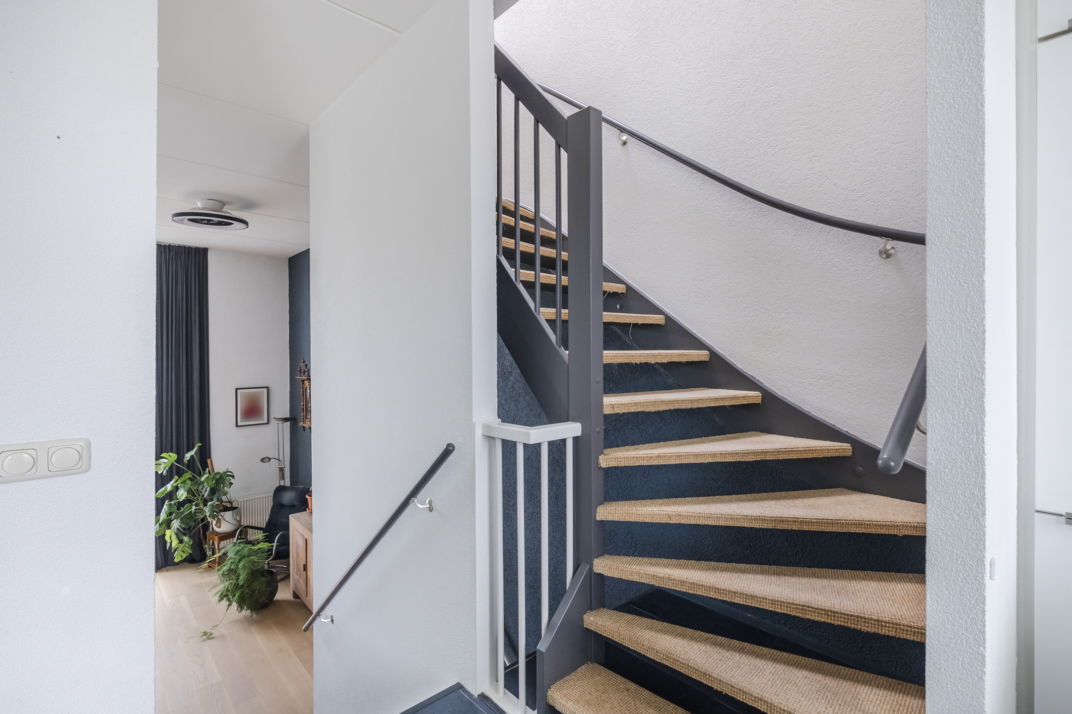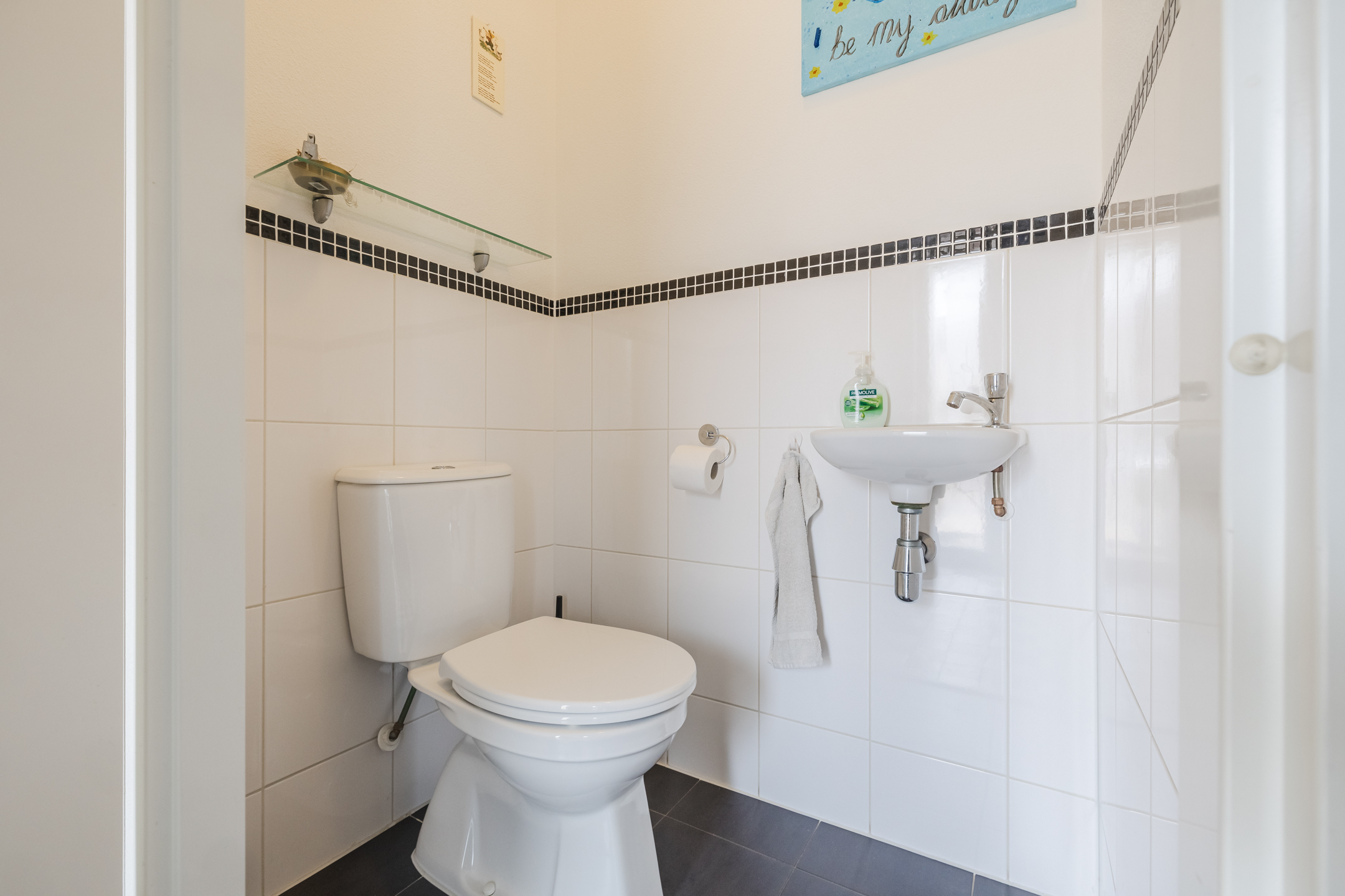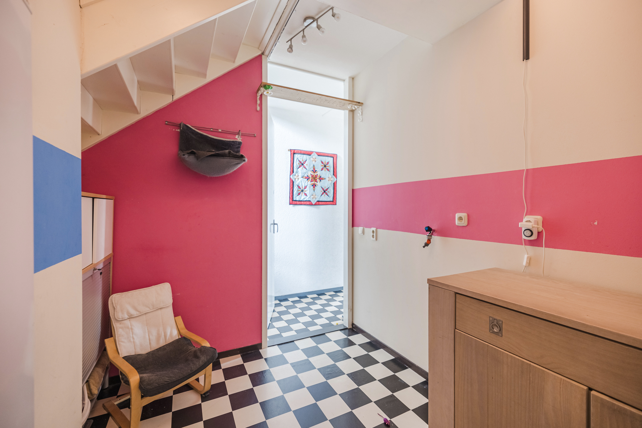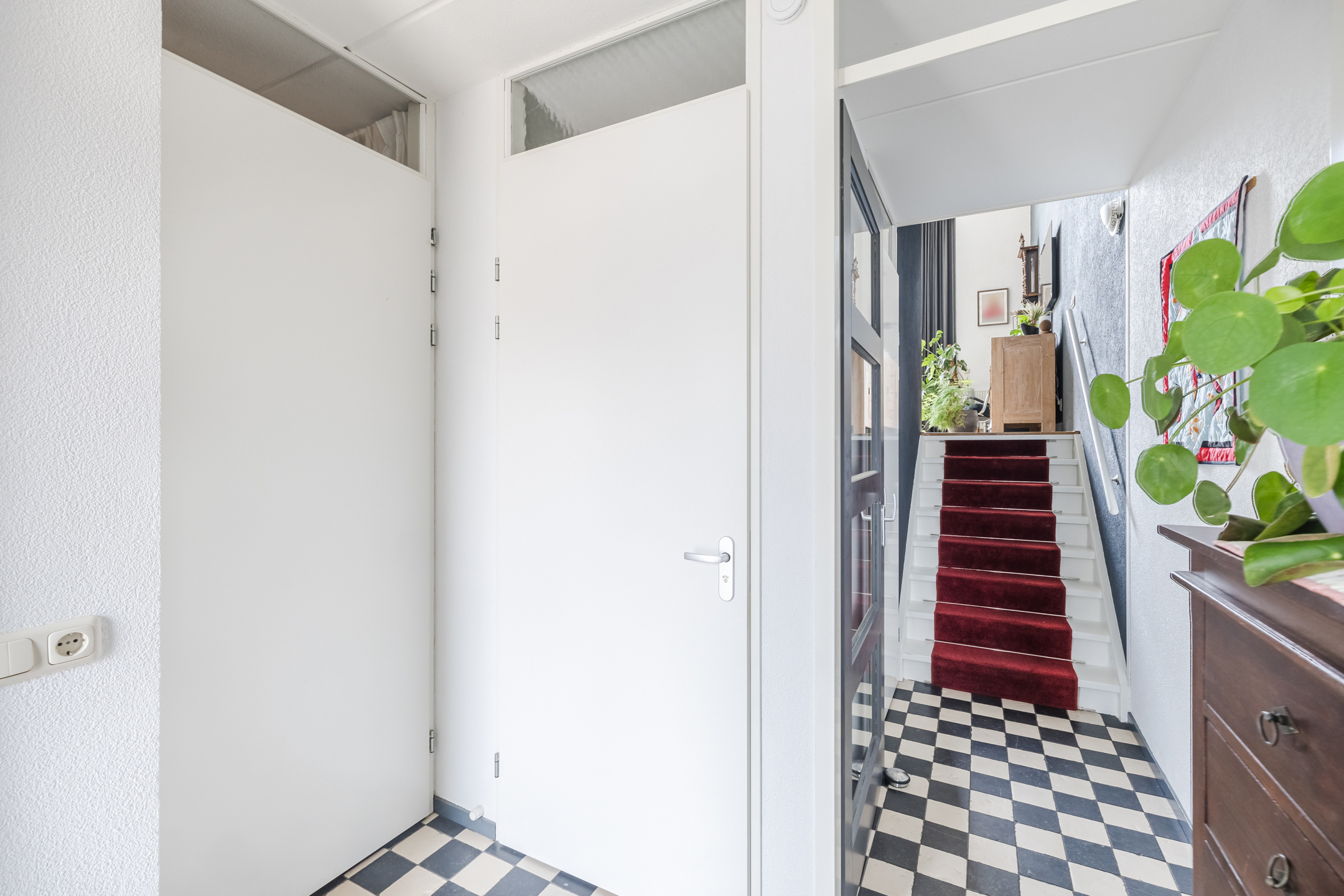 Ruime entree met meterkast en toiletruimte. Vanuit de hal is er toegang tot de inpandige berging en een praktische kastenwand met wasmachineaansluiting. De trapopgang leidt naar de woonkamer.