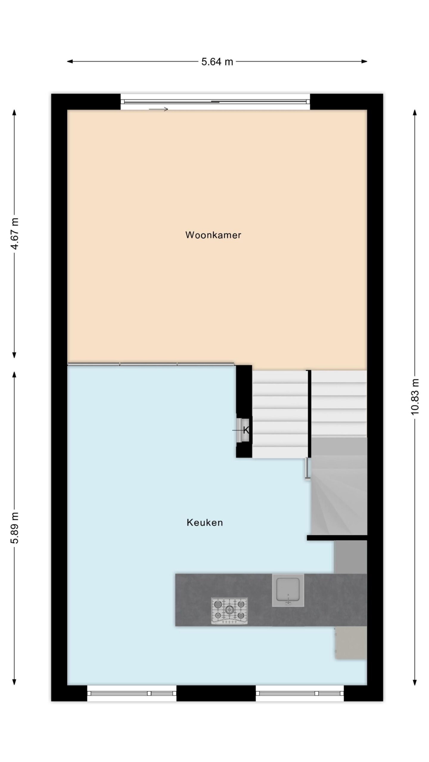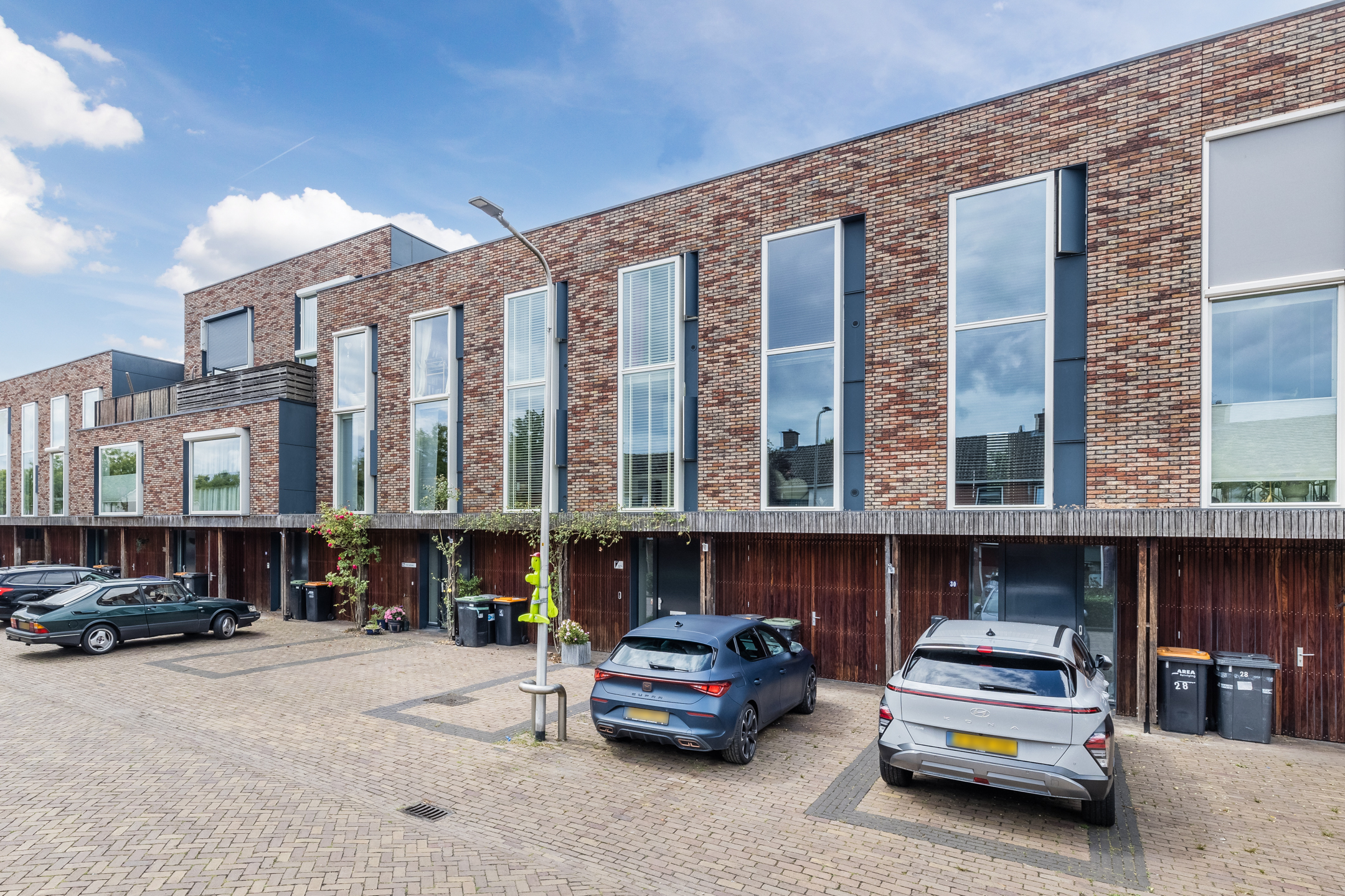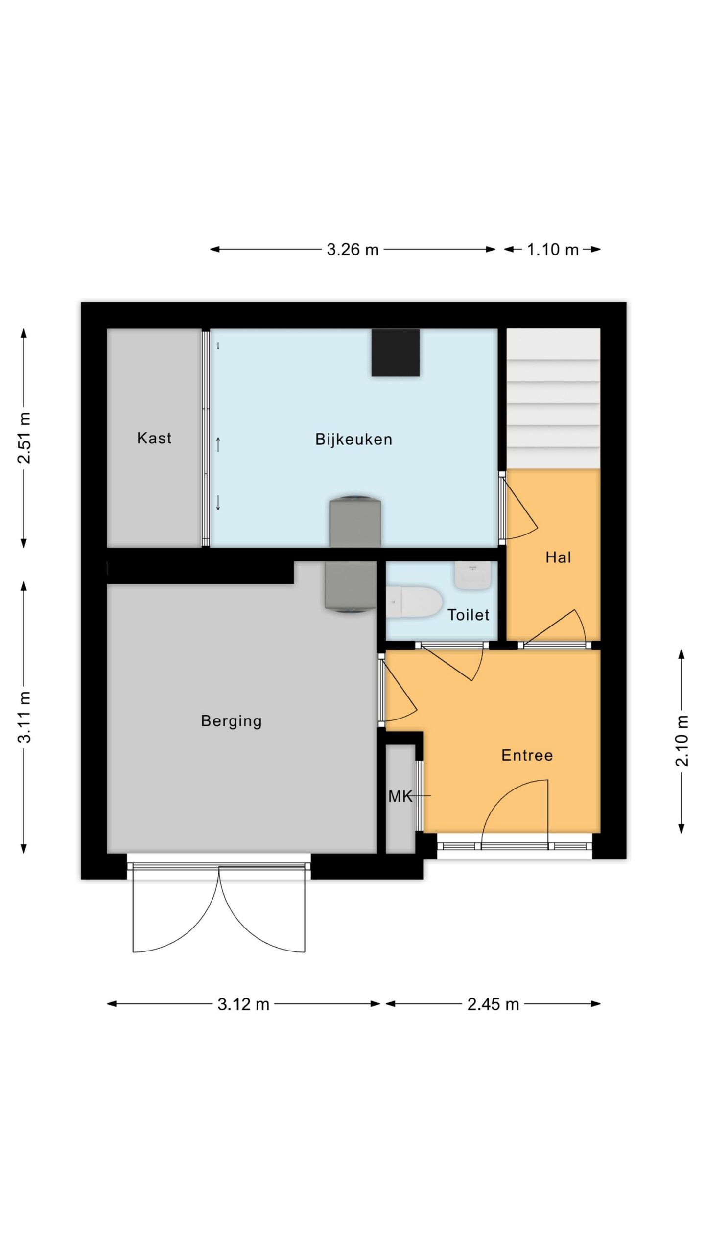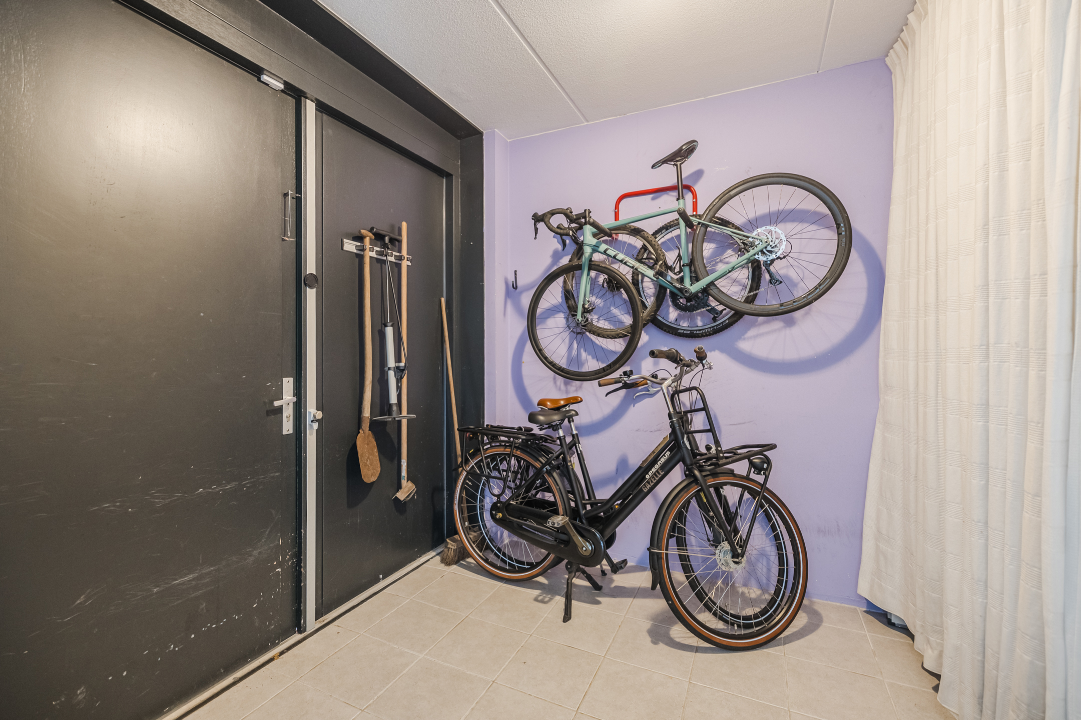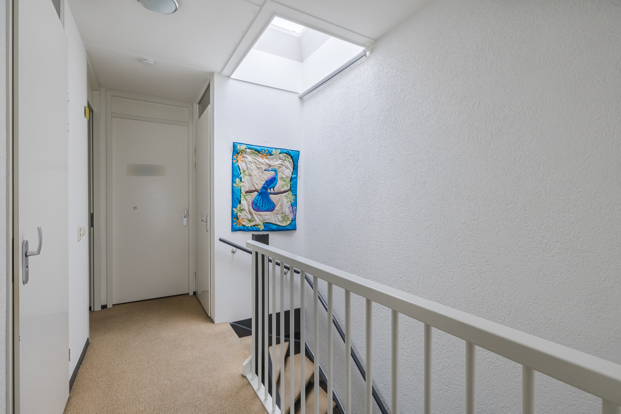 Ruime entree met meterkast en toiletruimte. Vanuit de hal is er toegang tot de inpandige berging en een praktische kastenwand met wasmachineaansluiting. De trapopgang leidt naar de woonkamer.