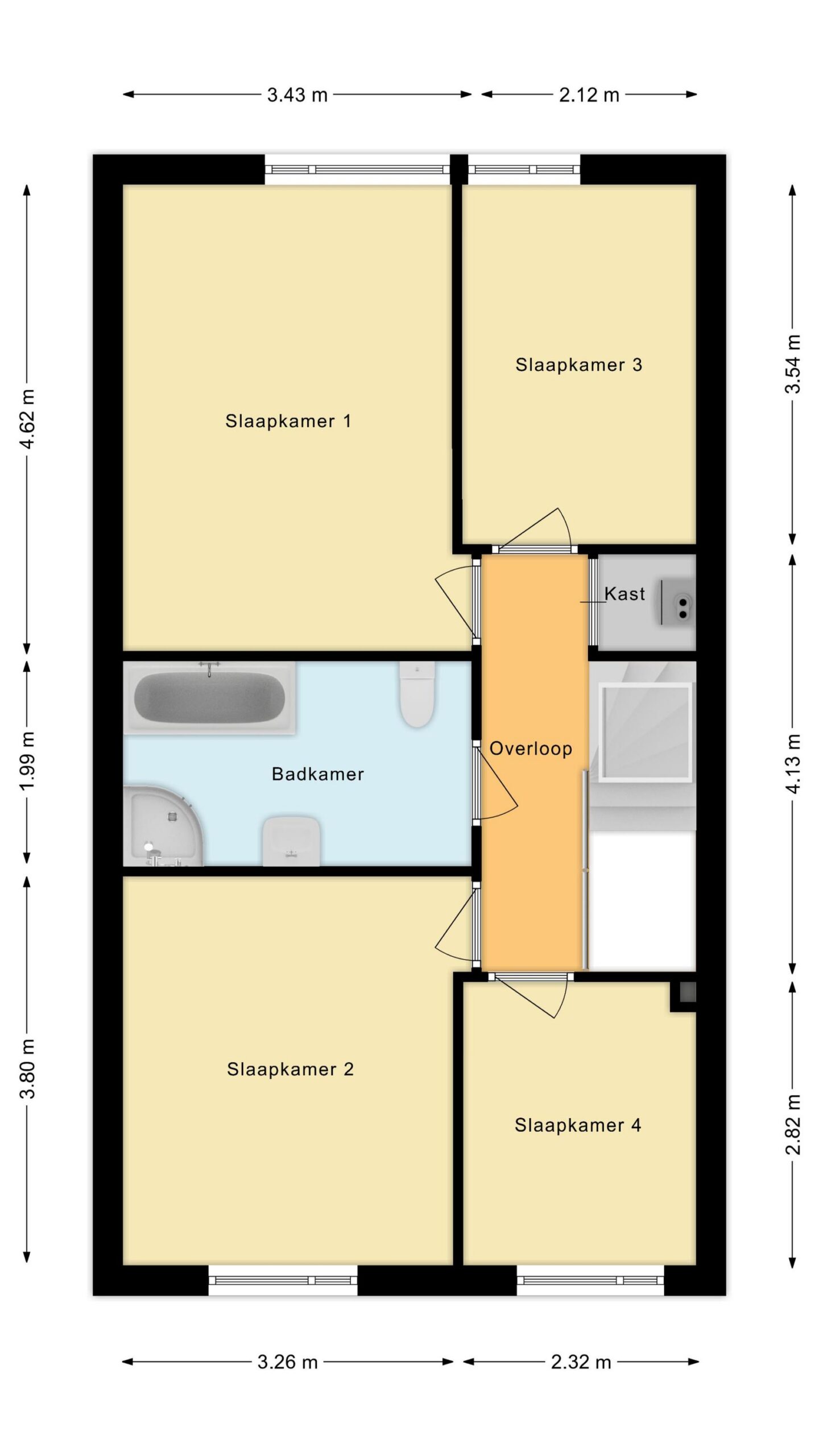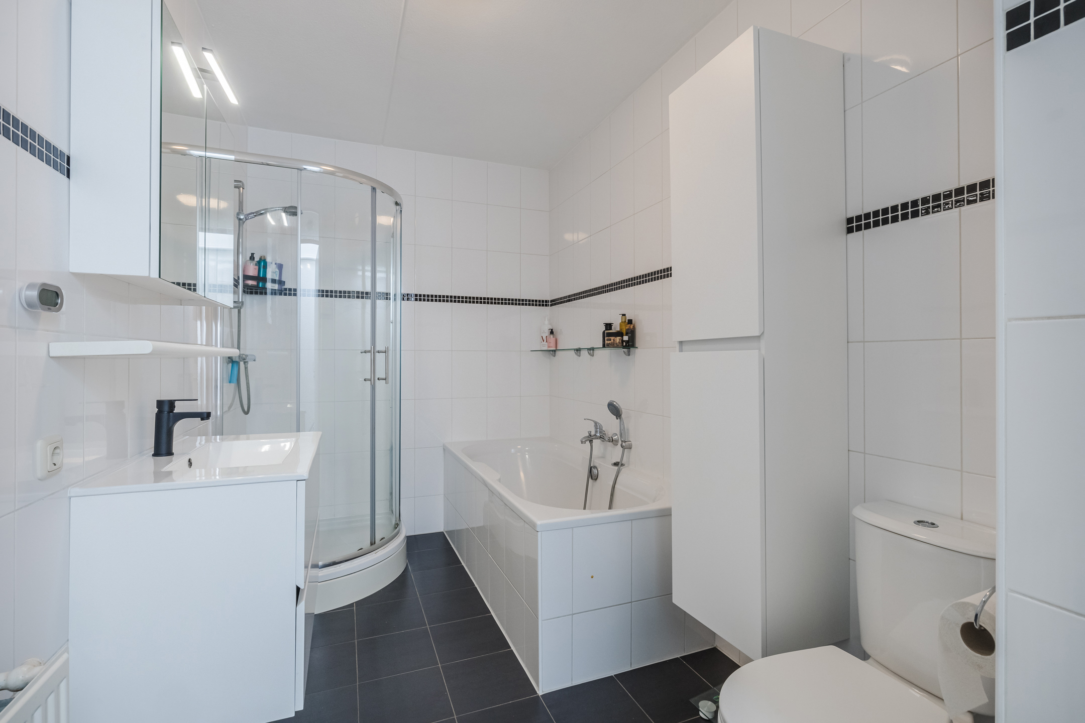 Hier bevinden zich vier (ruime) slaapkamers. Op de overloop is een lichtkoepel en airconditioning (2024) aanwezig. De badkamer beschikt over een wastafelmeubel, toilet, inloopdouche en ligbad.