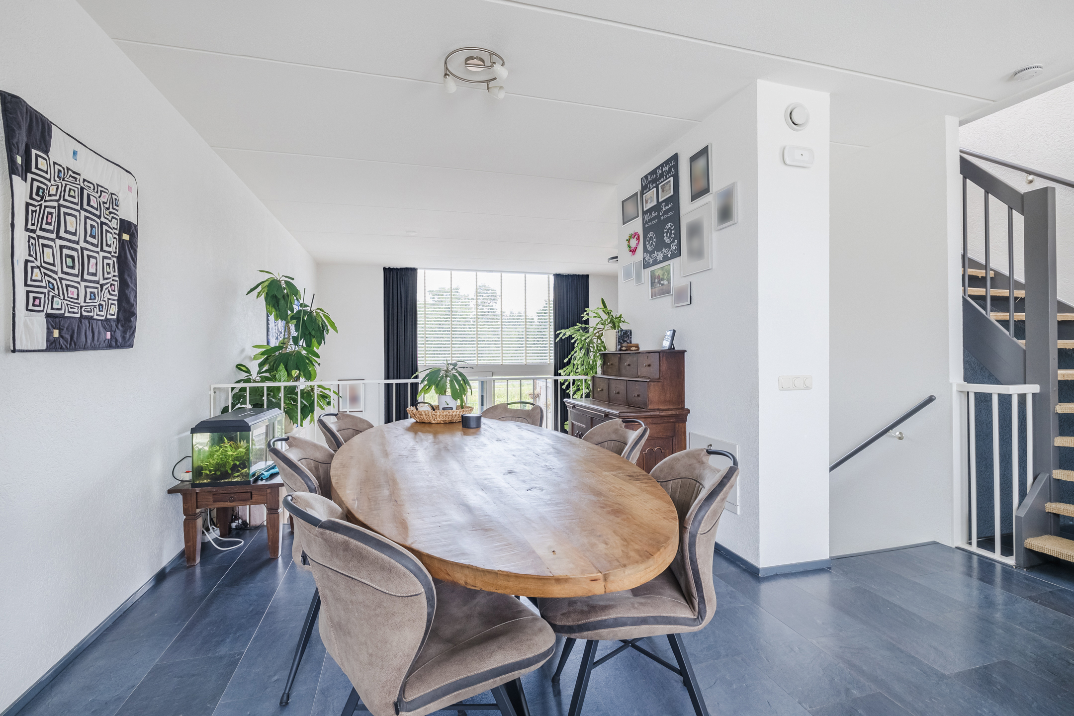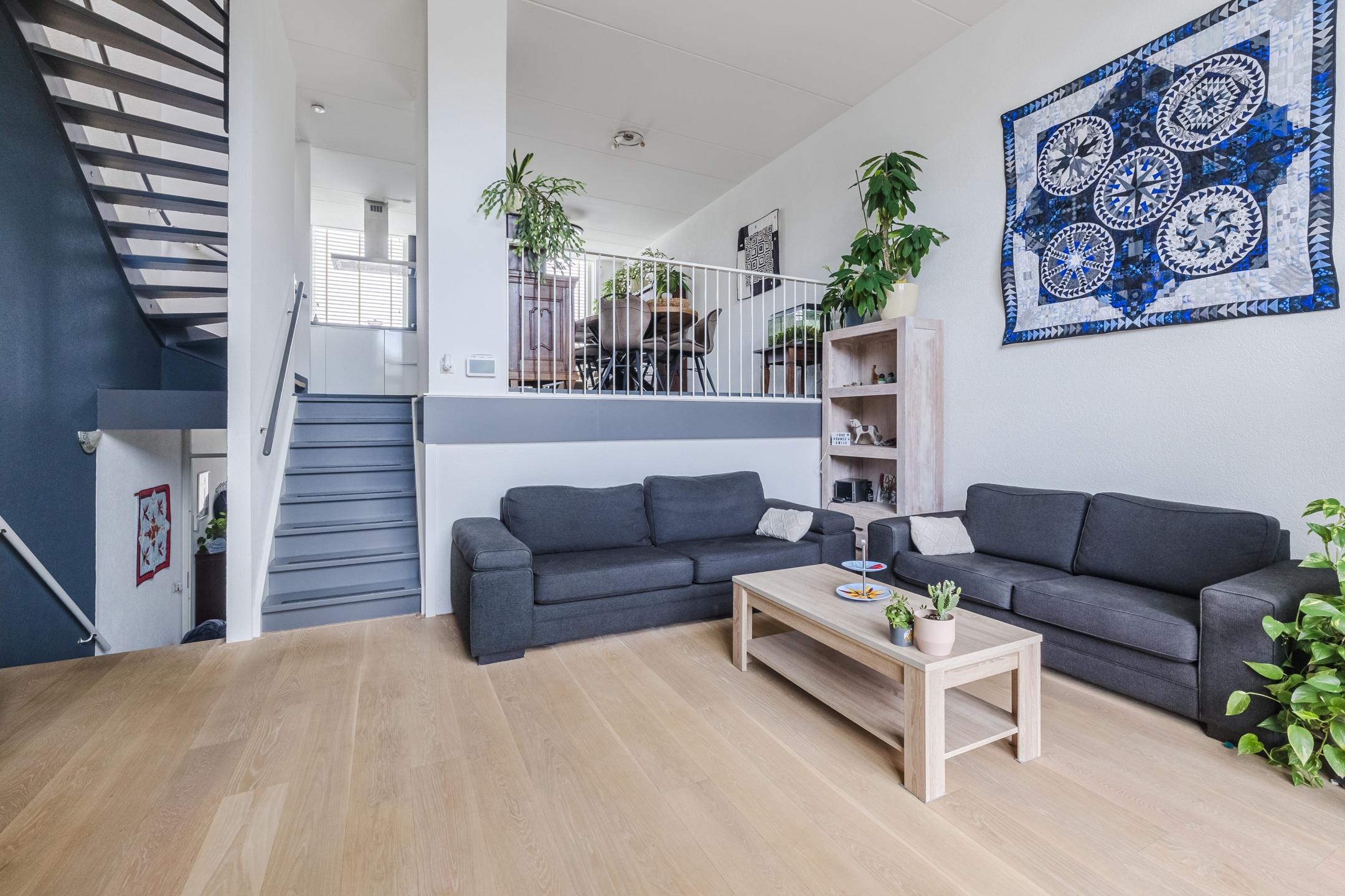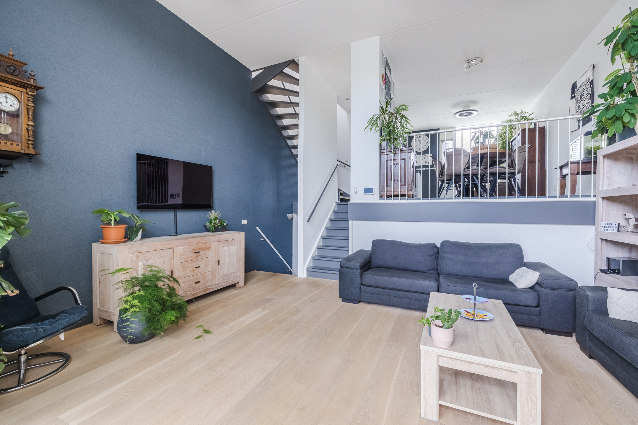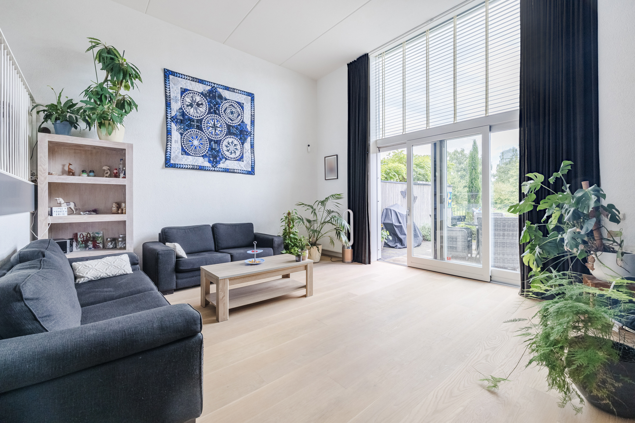 De royale woonkamer beschikt over een grote schuifpui met bovenlicht, wat zorgt voor een prachtige lichtinval en een ruimtelijk gevoel. De geoliede eikenhouten vloer geeft het geheel een warme en luxe uitstraling.