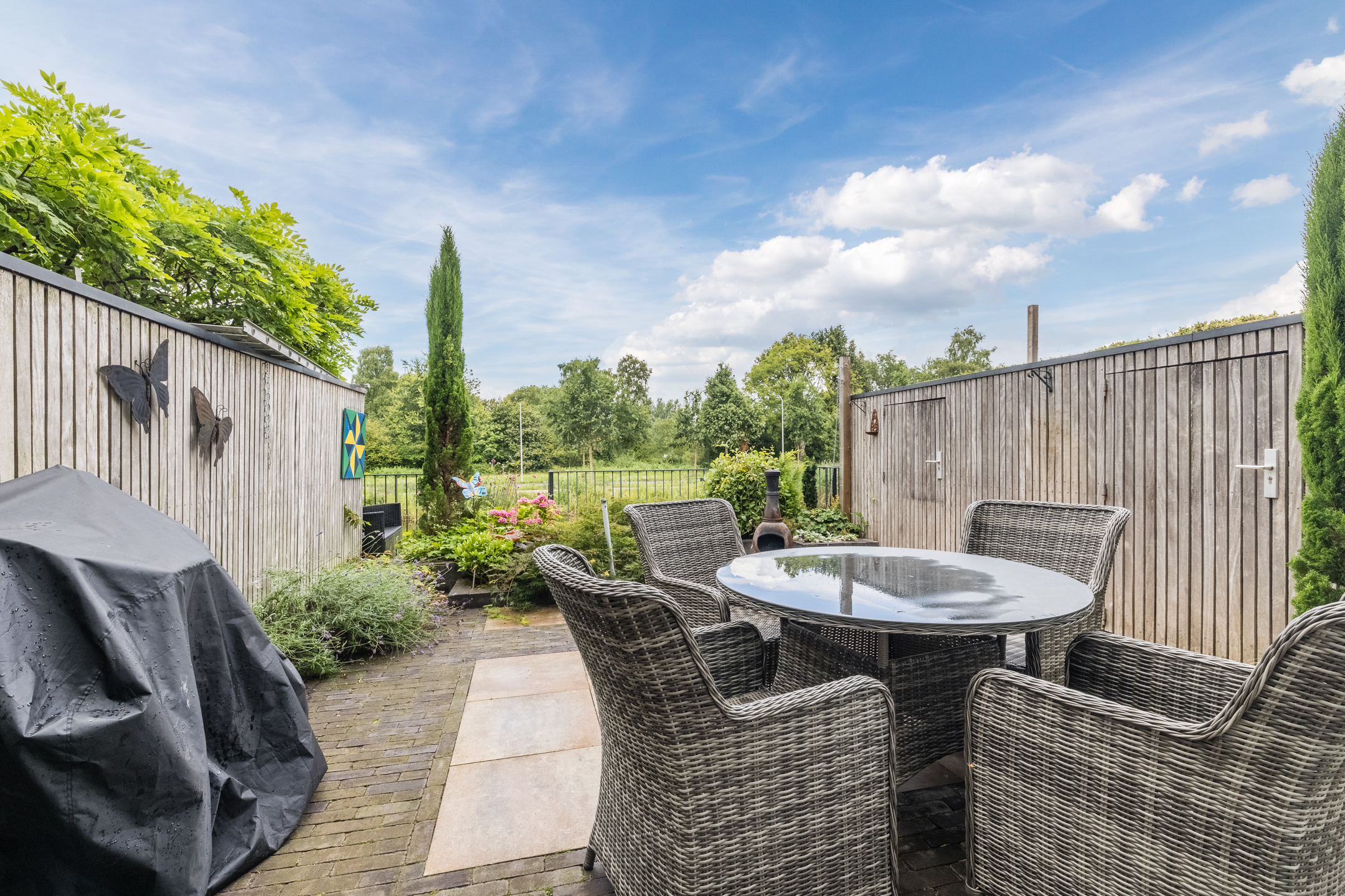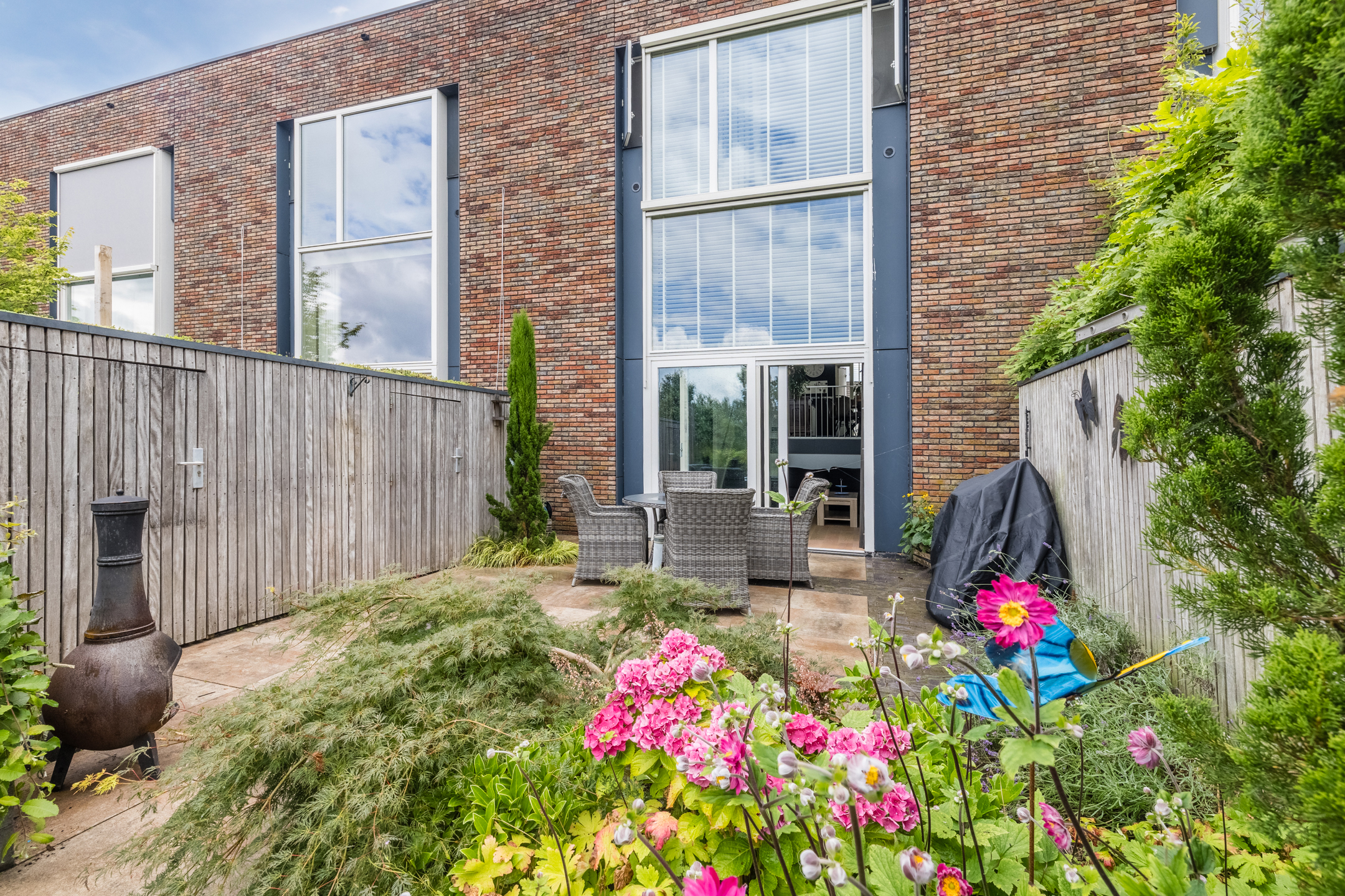 Het fraai aangelegde terras (2021) is voorzien van prachtige borders, tegels, een houten vlonder en een buitenkraan.