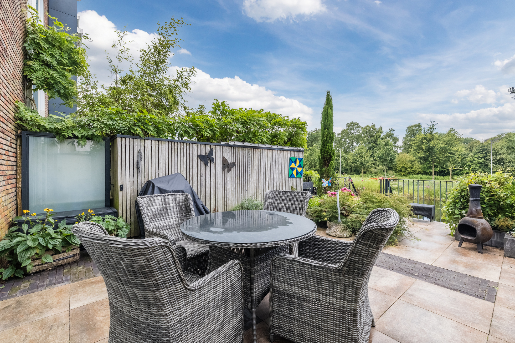 Vanuit de woonkamer stap je zo het terras op met vrij uitzicht over het water.