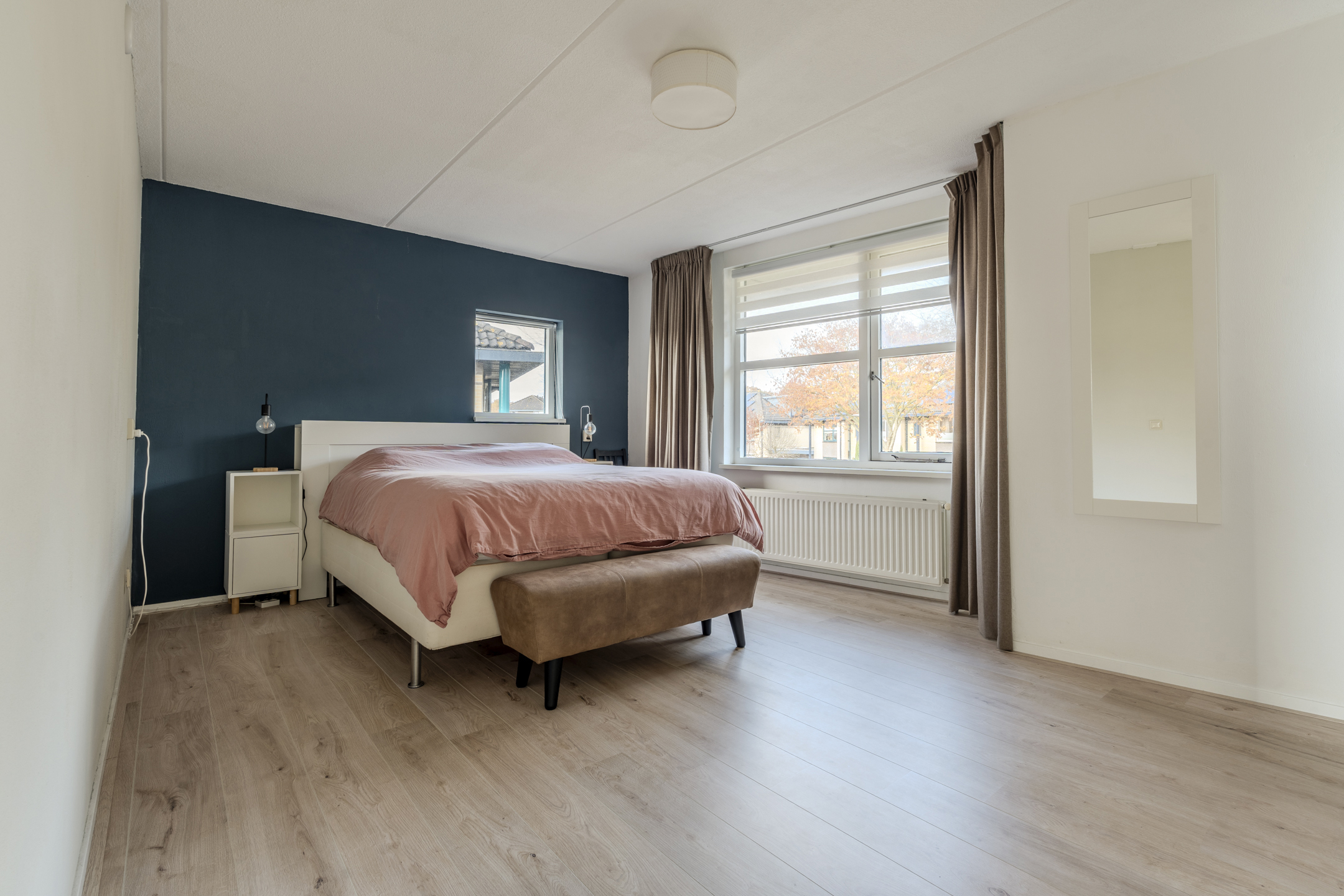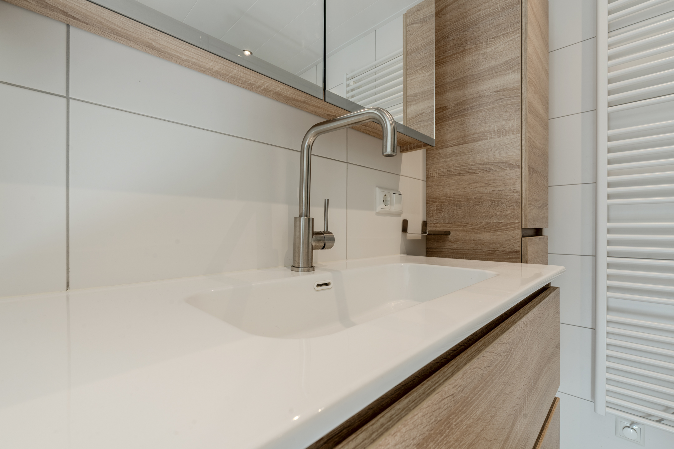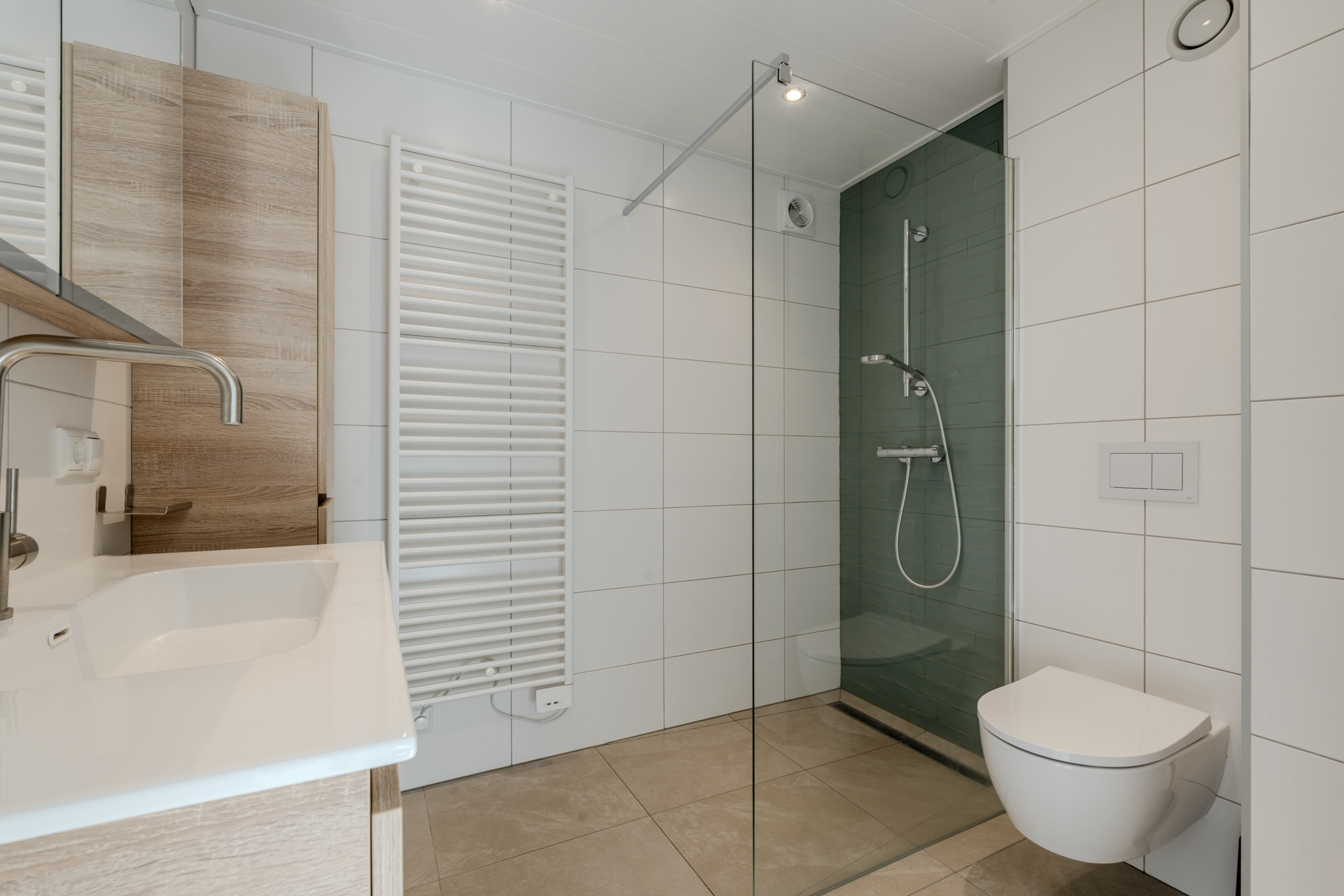 Overloop met drie ruime slaapkamers. De badkamer is voorzien van een inloopdouche, wastafelmeubel en toilet.