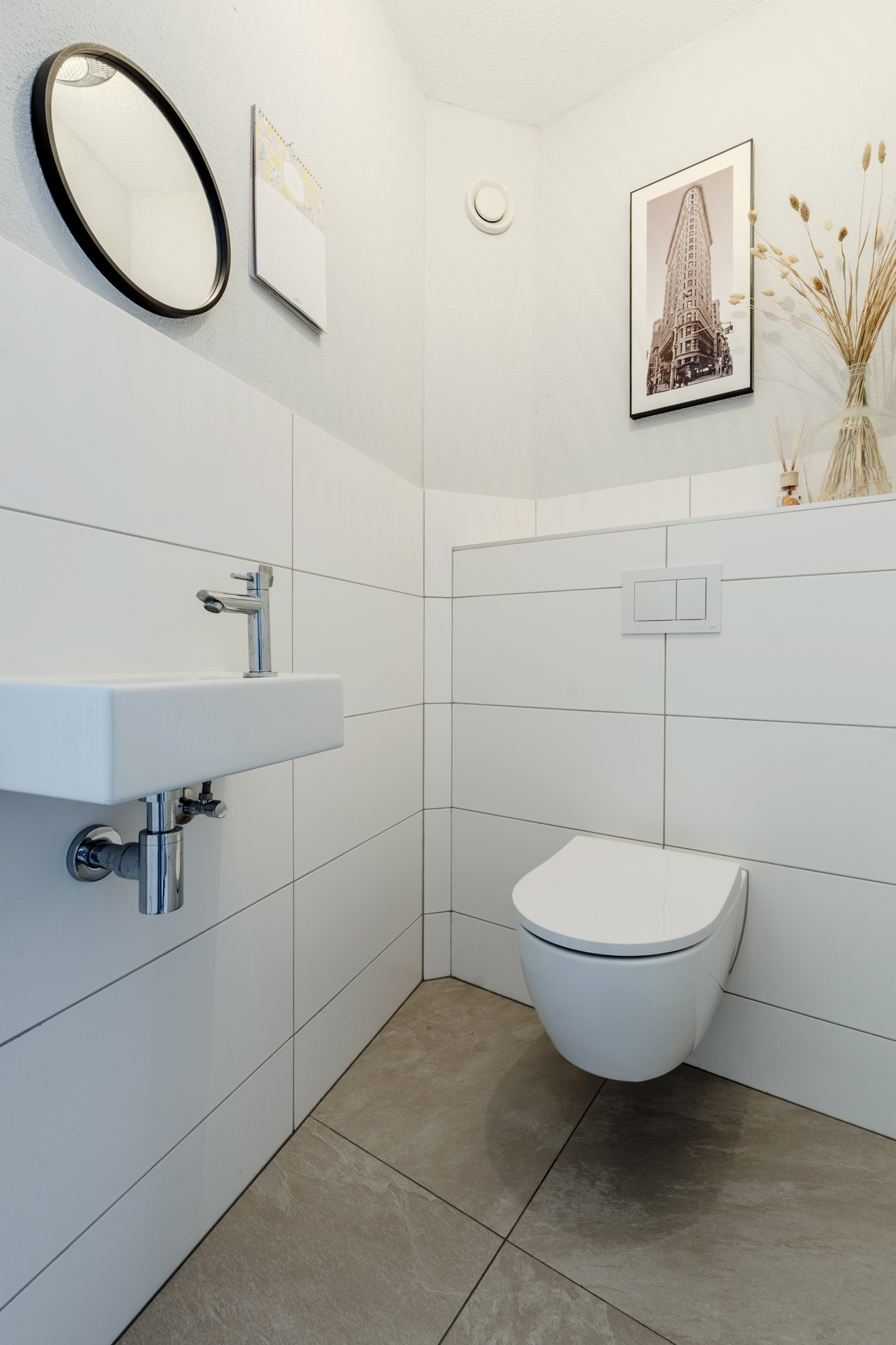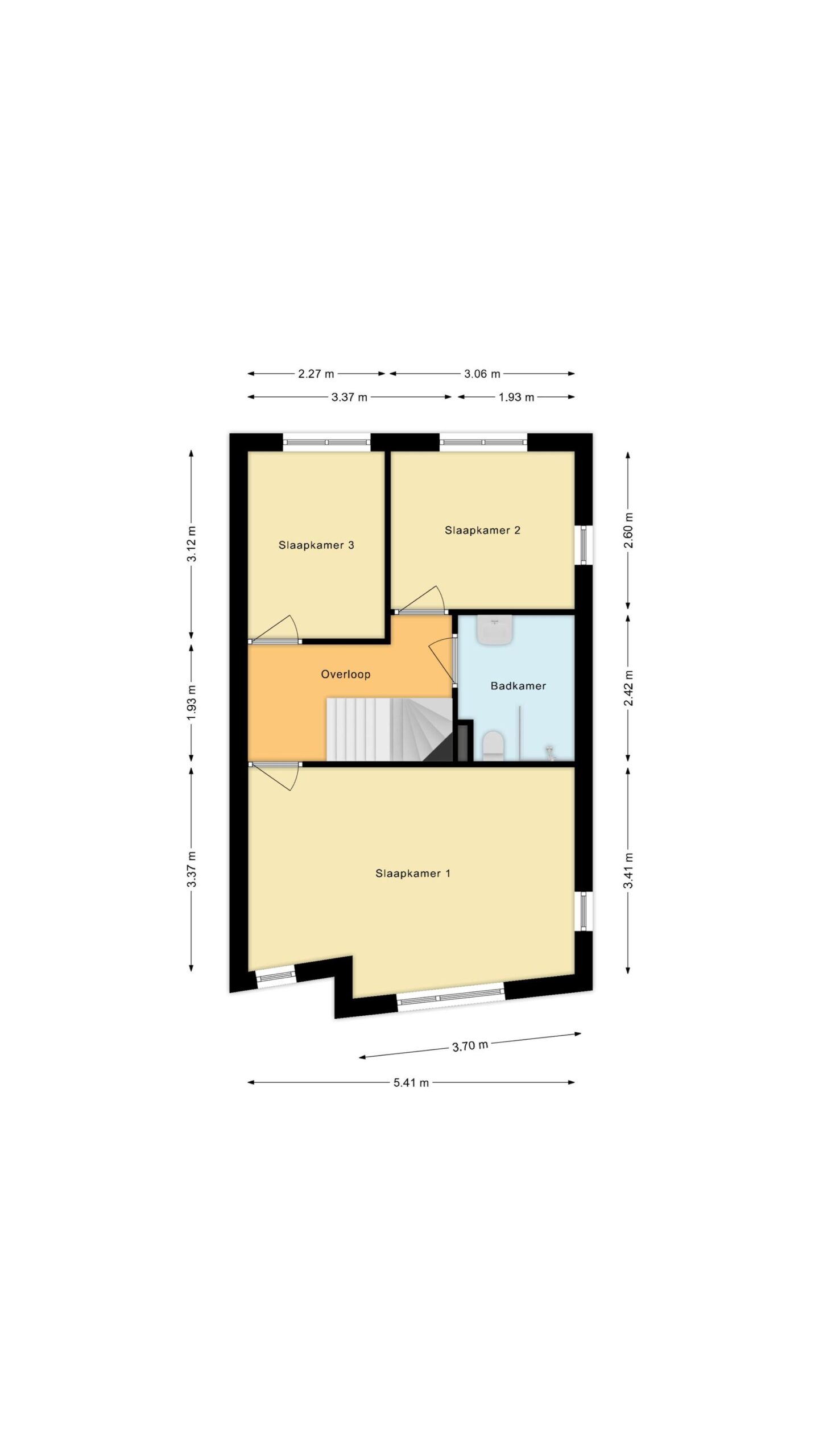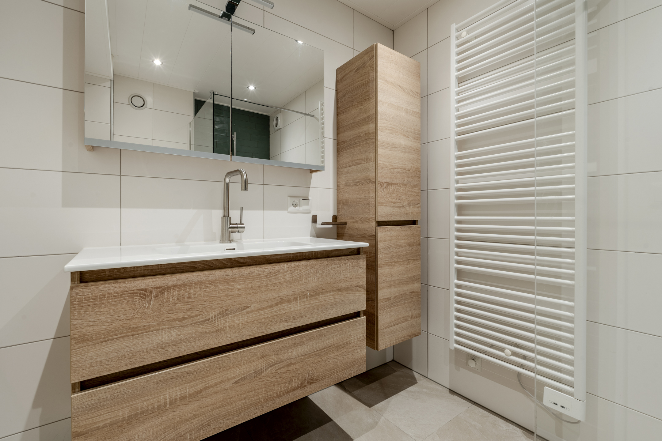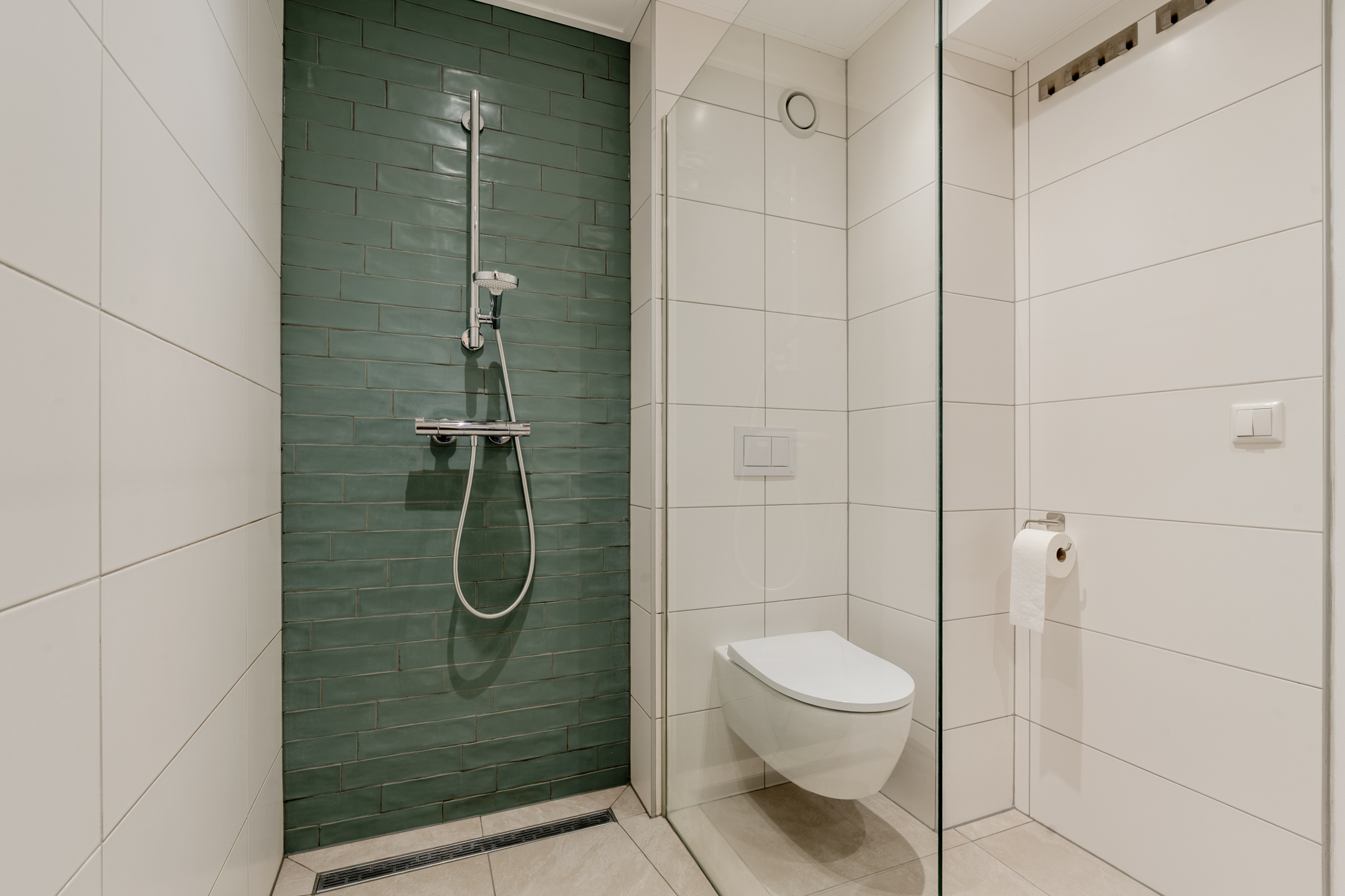 Overloop met drie ruime slaapkamers. De badkamer is voorzien van een inloopdouche, wastafelmeubel en toilet.