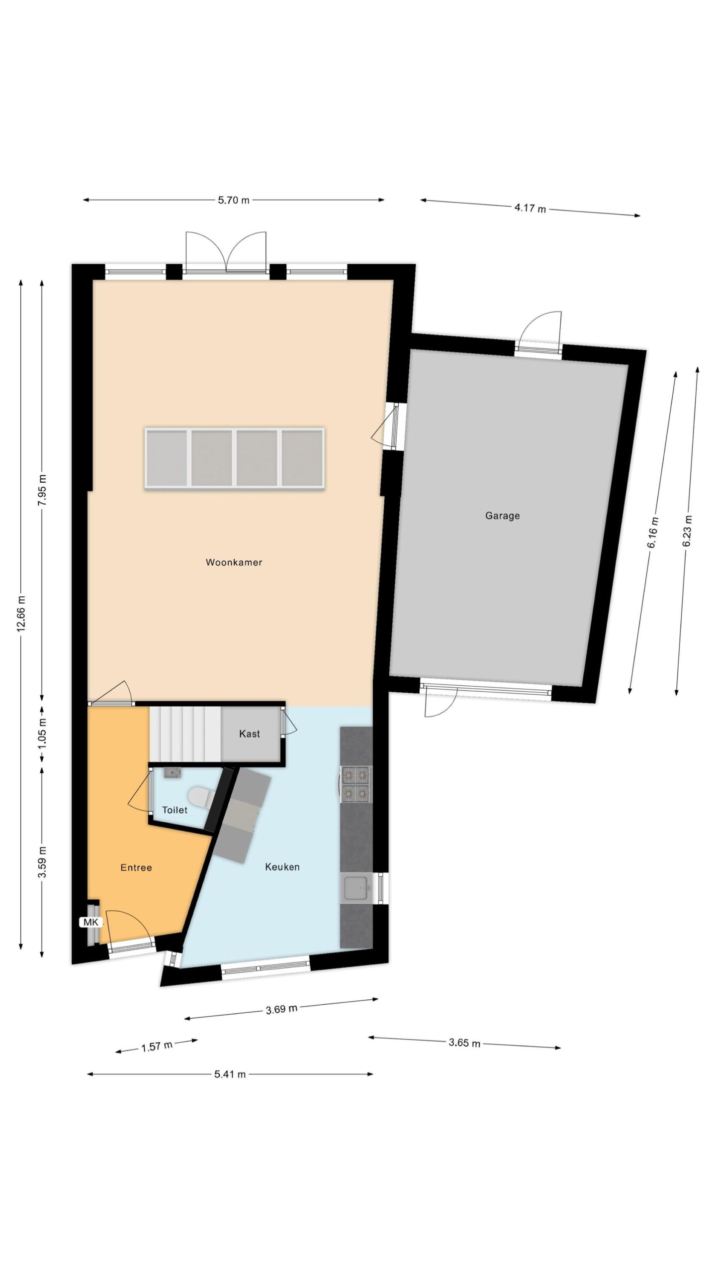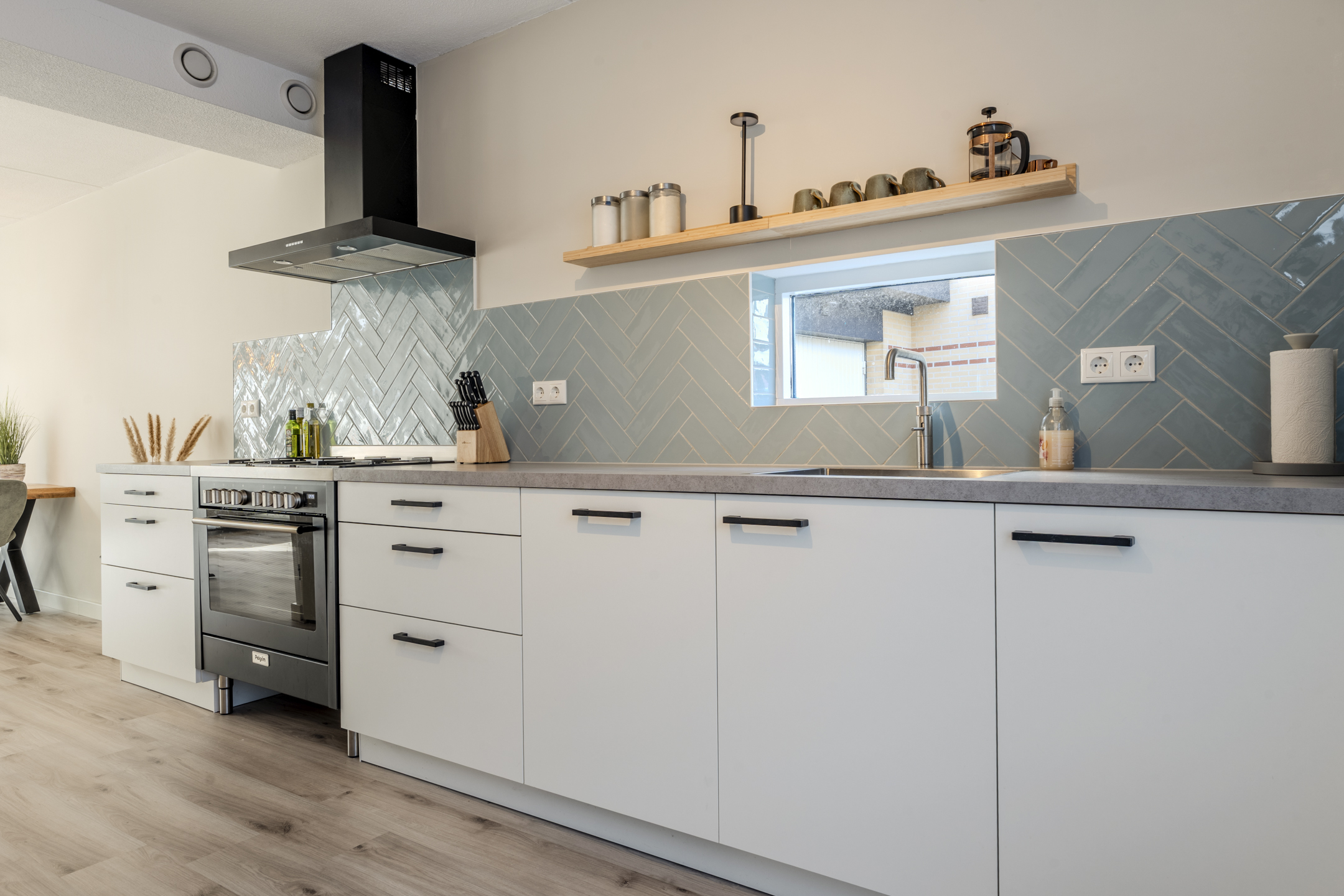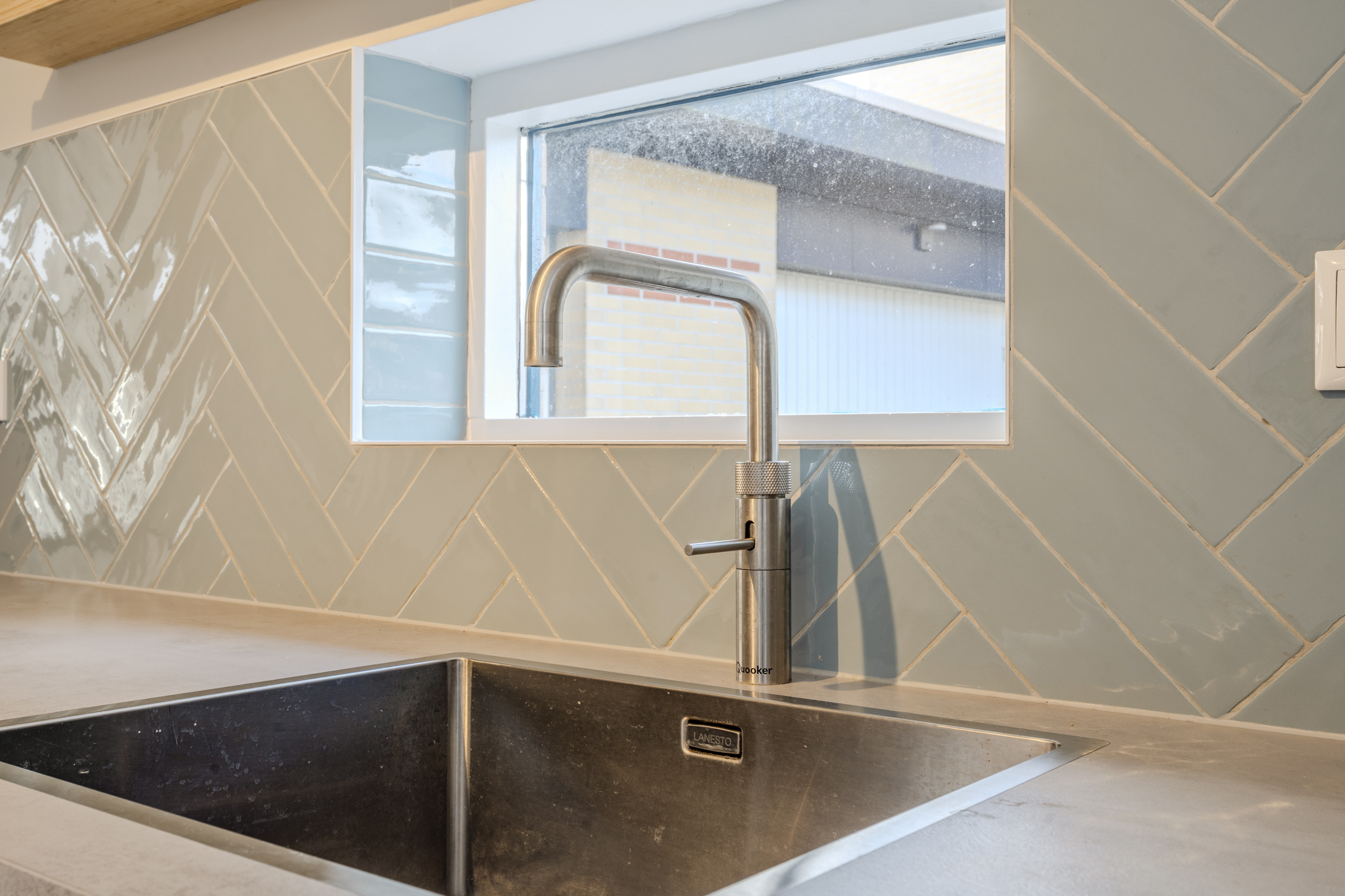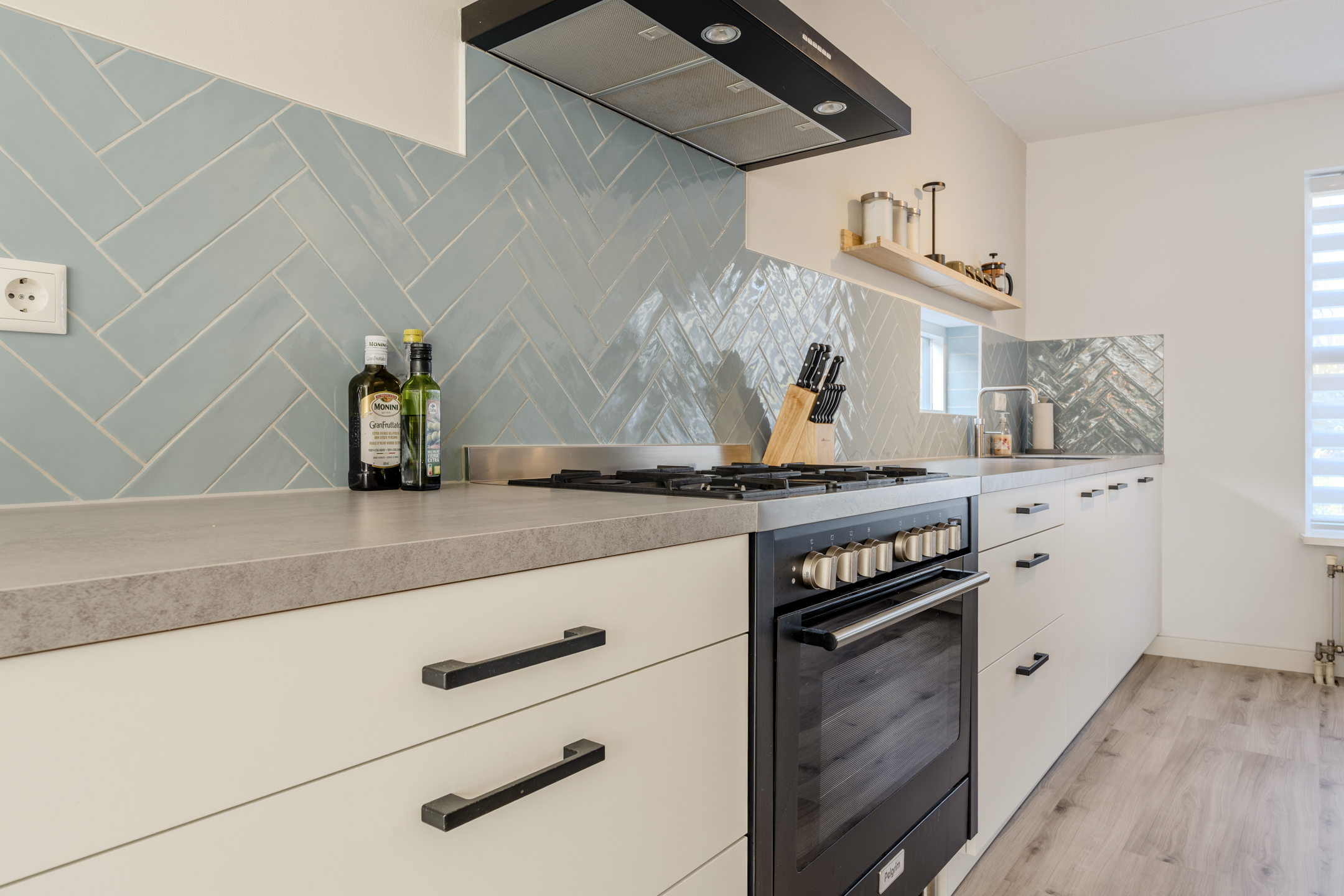Entree met meterkast, toilet en trapopgang. Lichte en uitgebouwde woonkamer met openslaande tuindeuren naar de tuin en een open keuken aan de voorzijde, voorzien van o.a. een 6 pits gasfornuis, Quooker, vaatwasser, oven, magnetron, koelkast en een vriezer. Vanuit de woonkamer is de garage bereikbaar welke voorzien is van elektra en water.