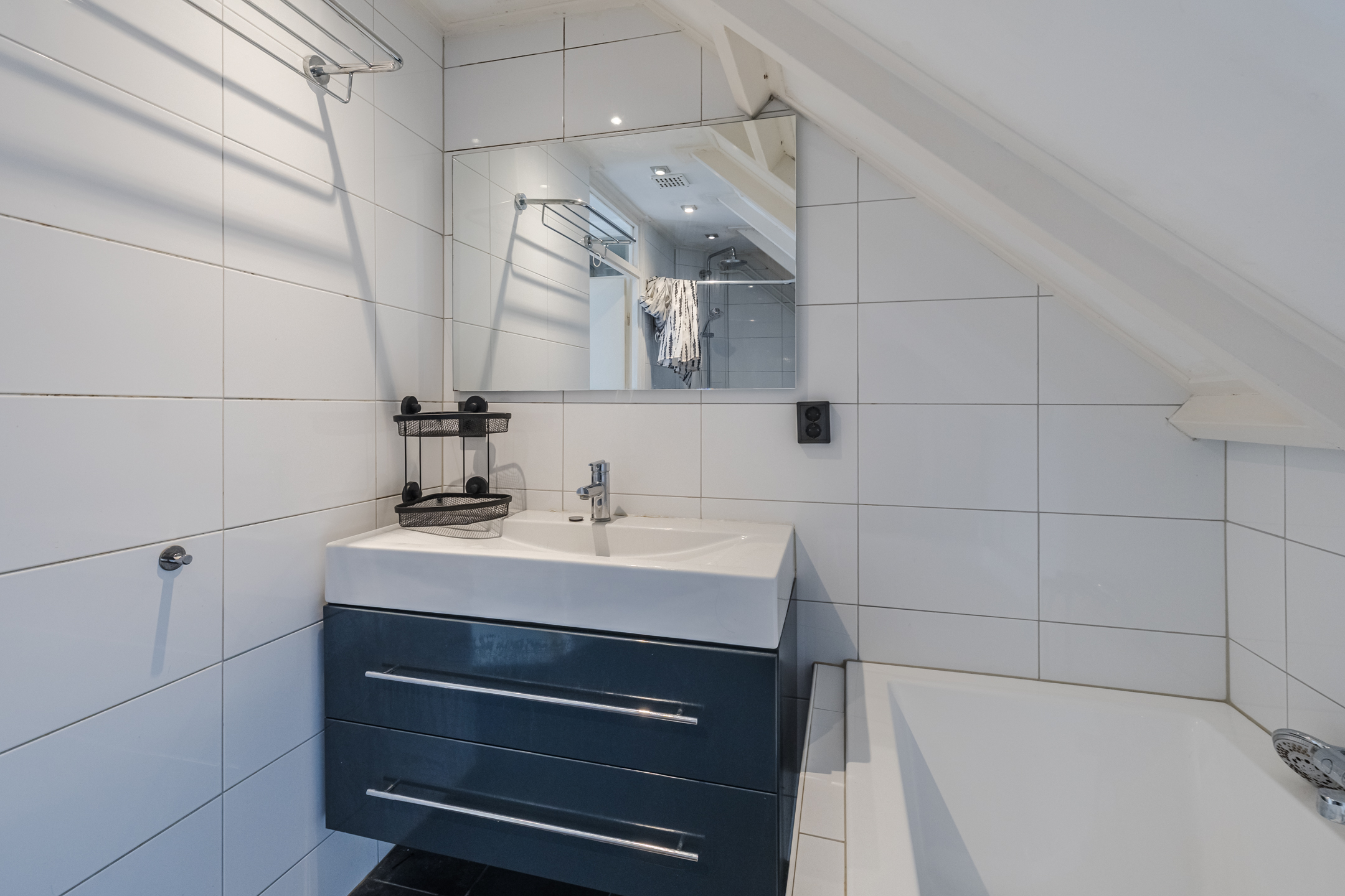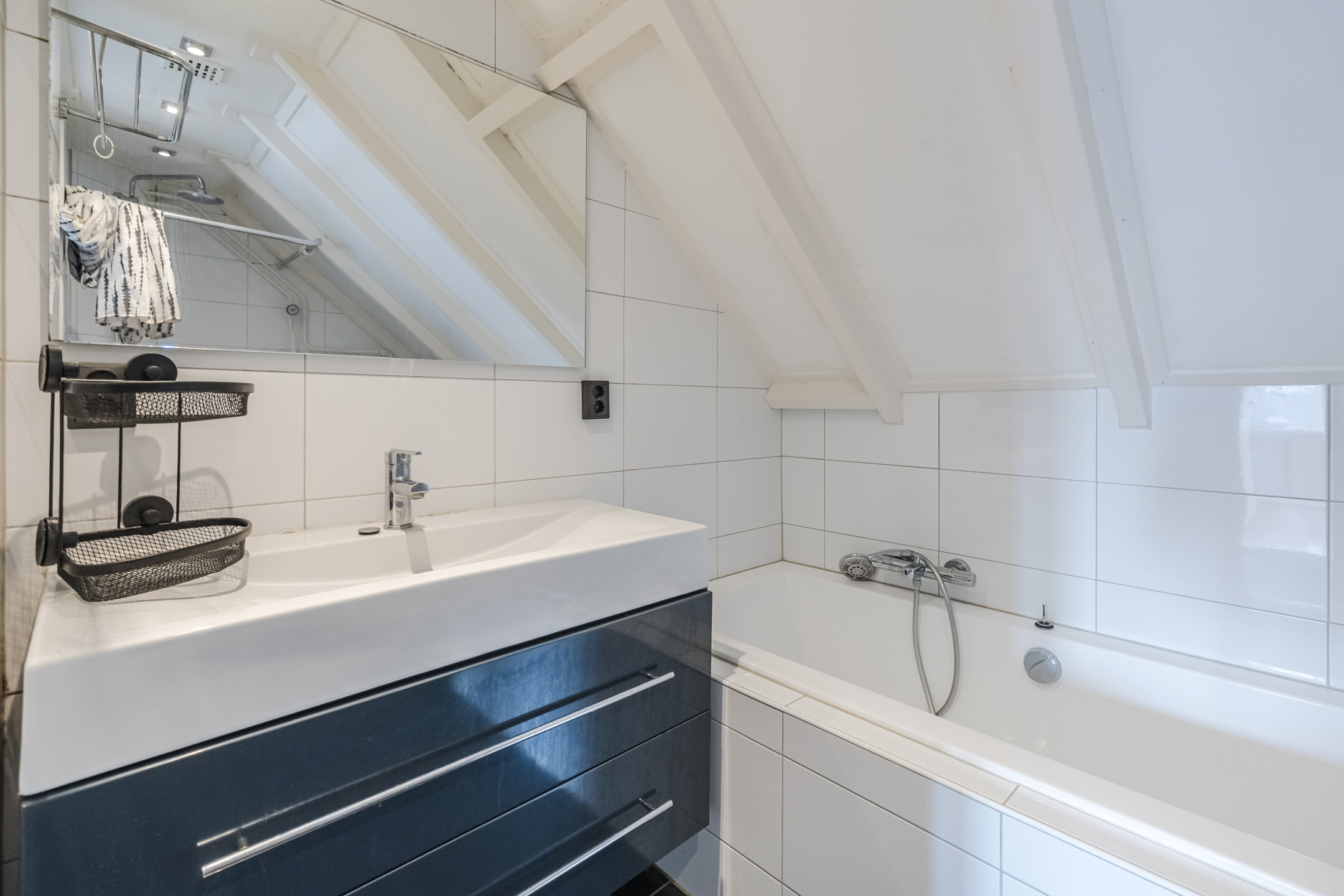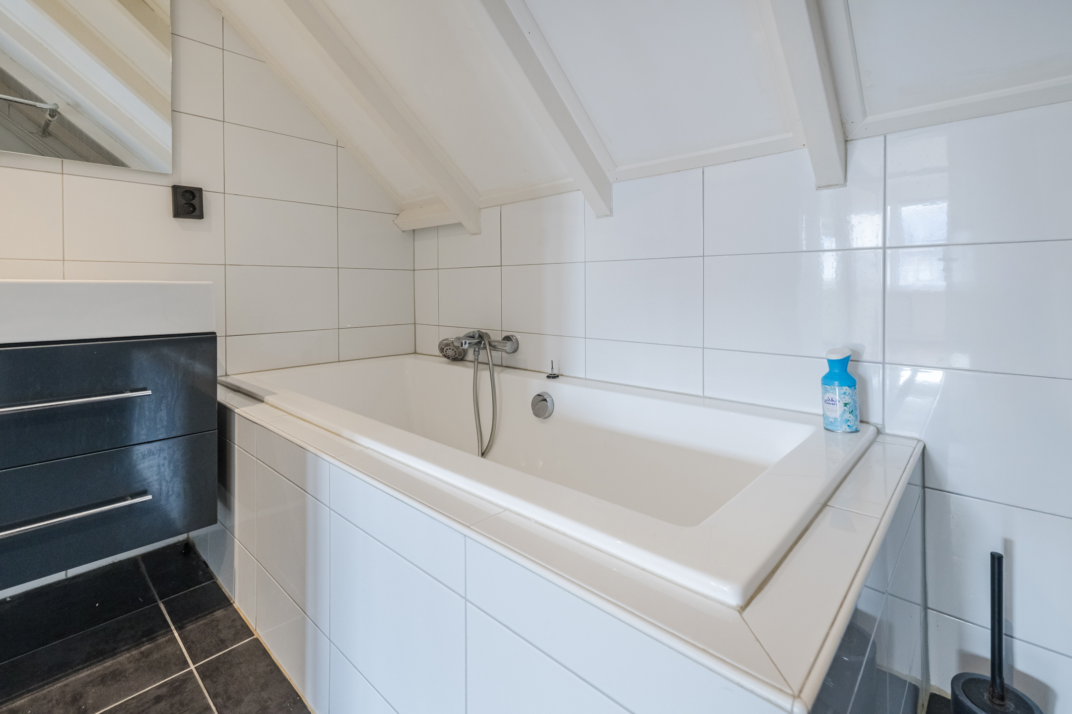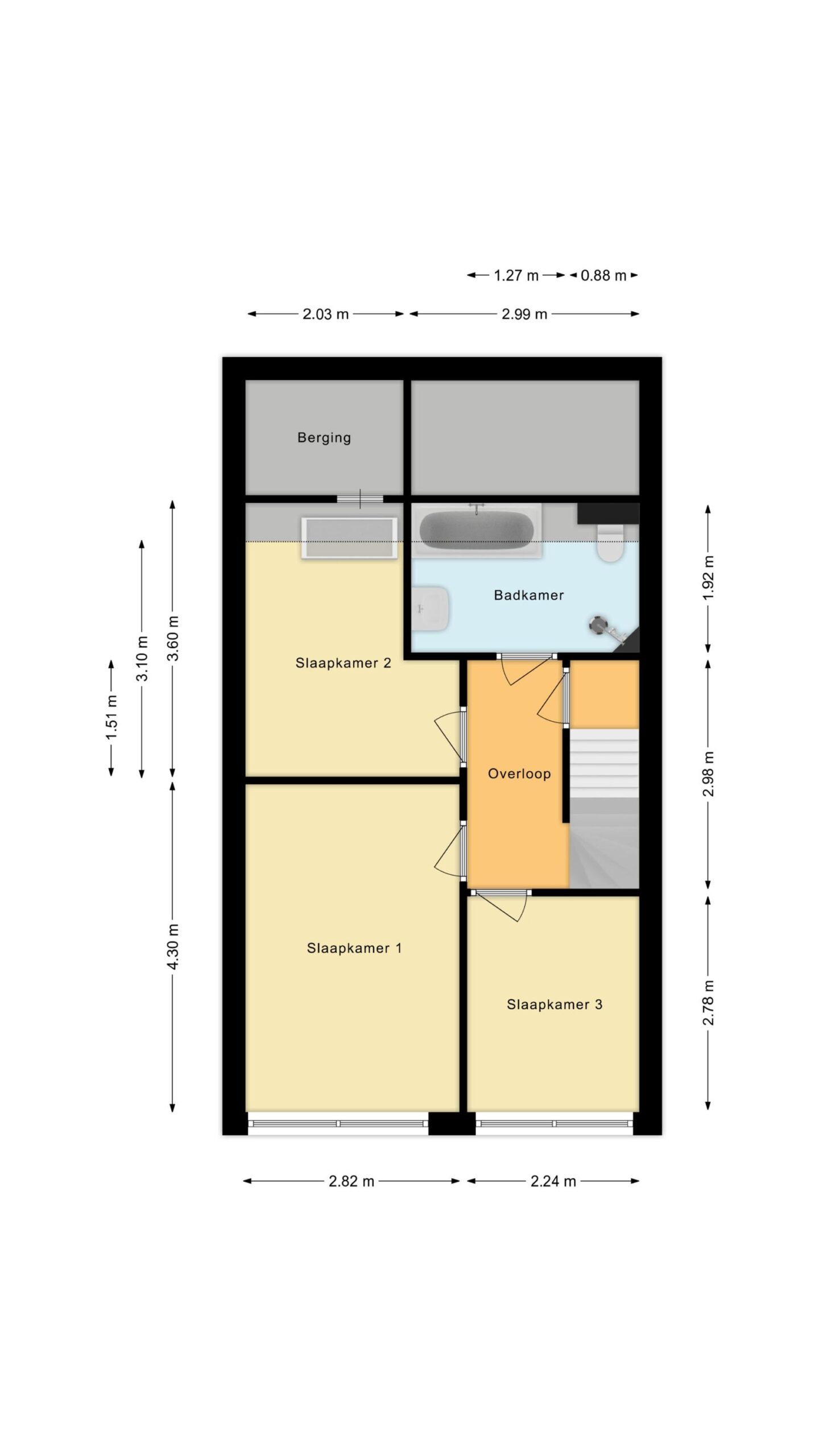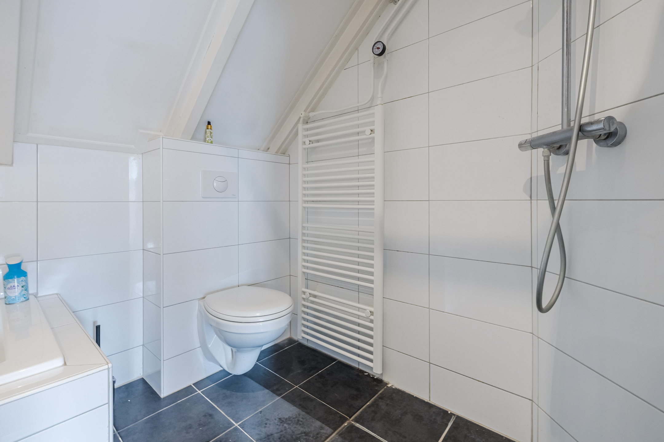 Overloop, 3 slaapkamers en een badkamer met een douche, bad, wastafelmeubel en een toilet.
