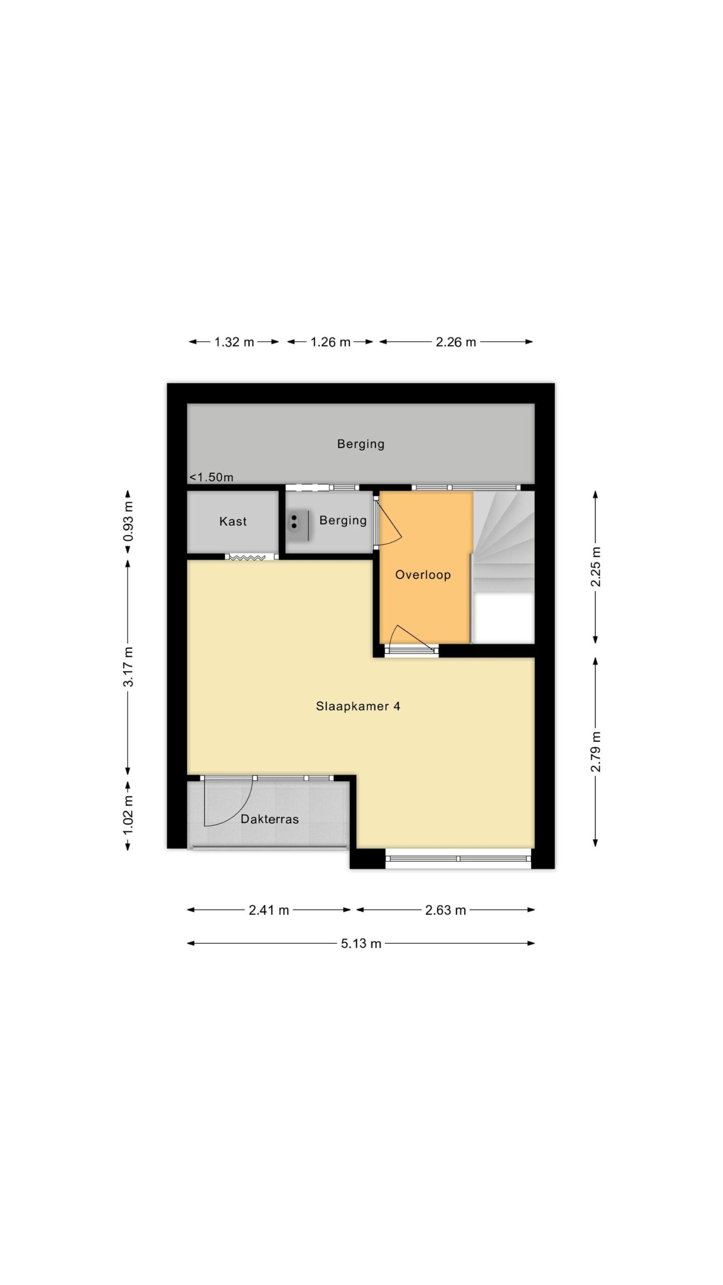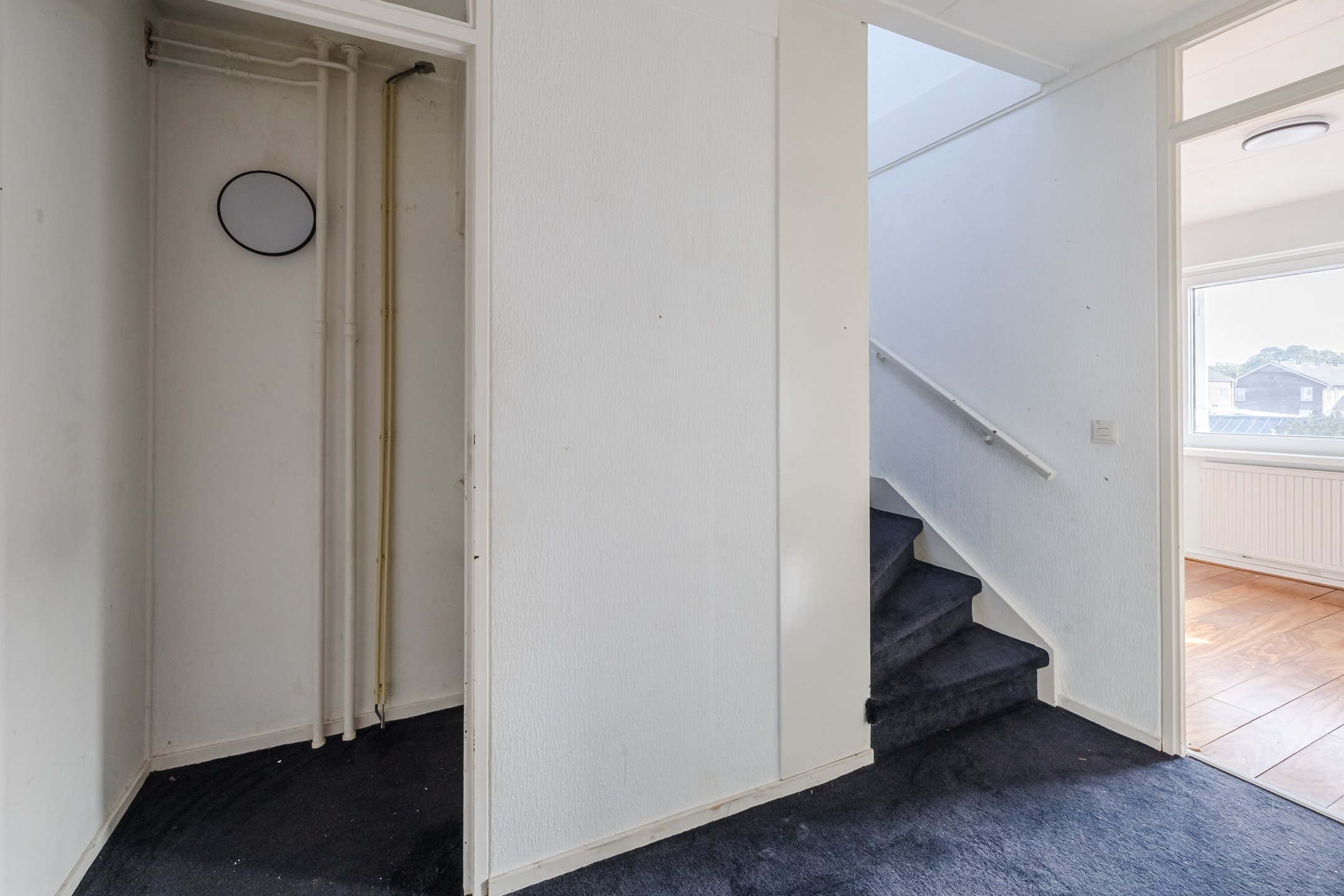 Overloop met cv-kast en bergruimte en een royale slaapkamer met een dakterras.