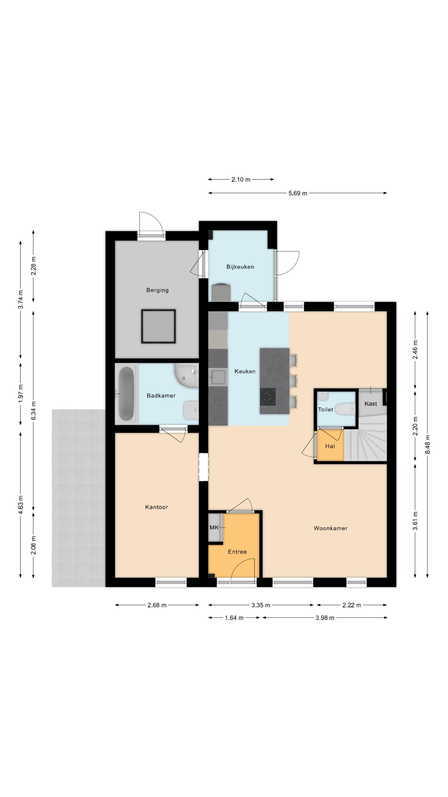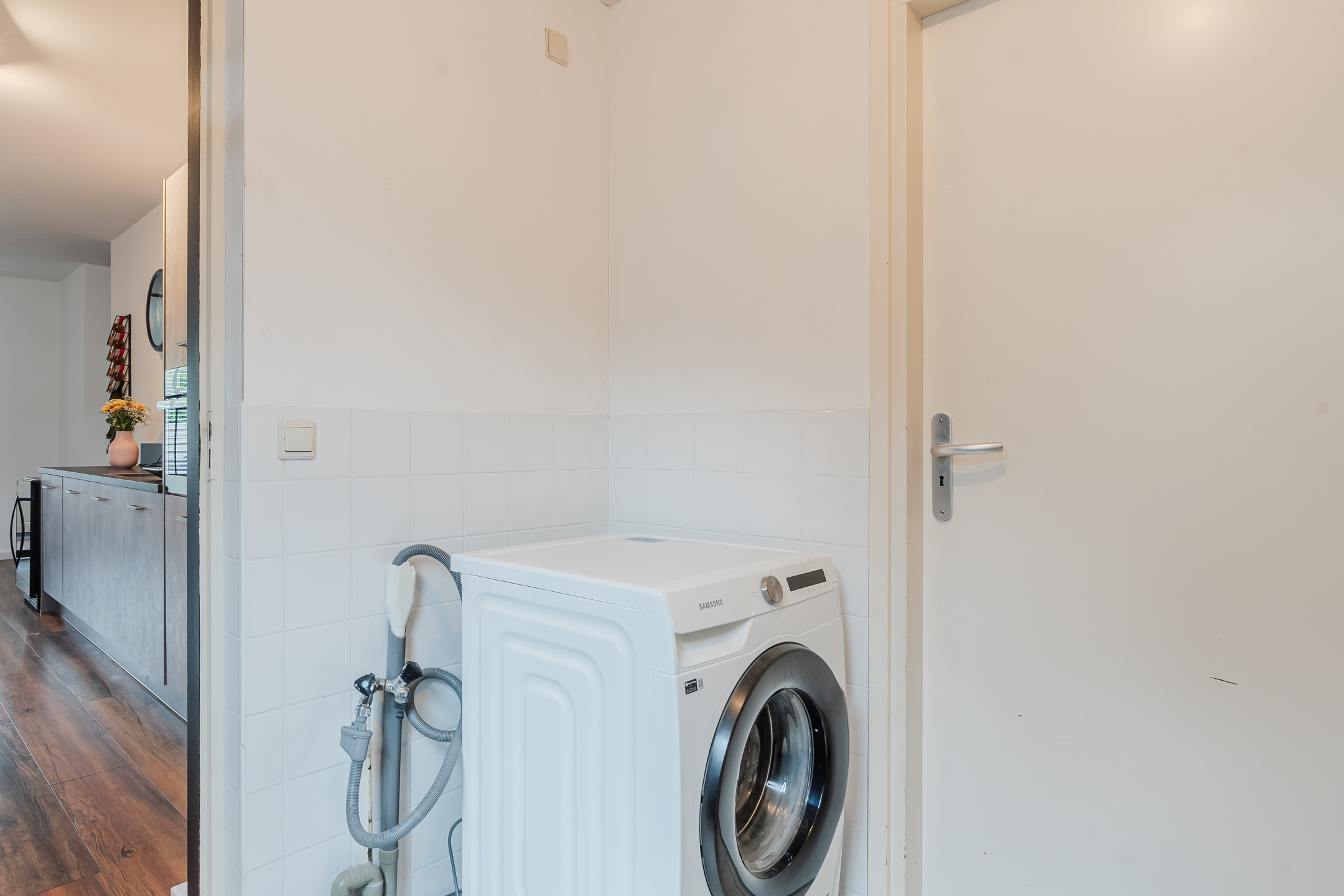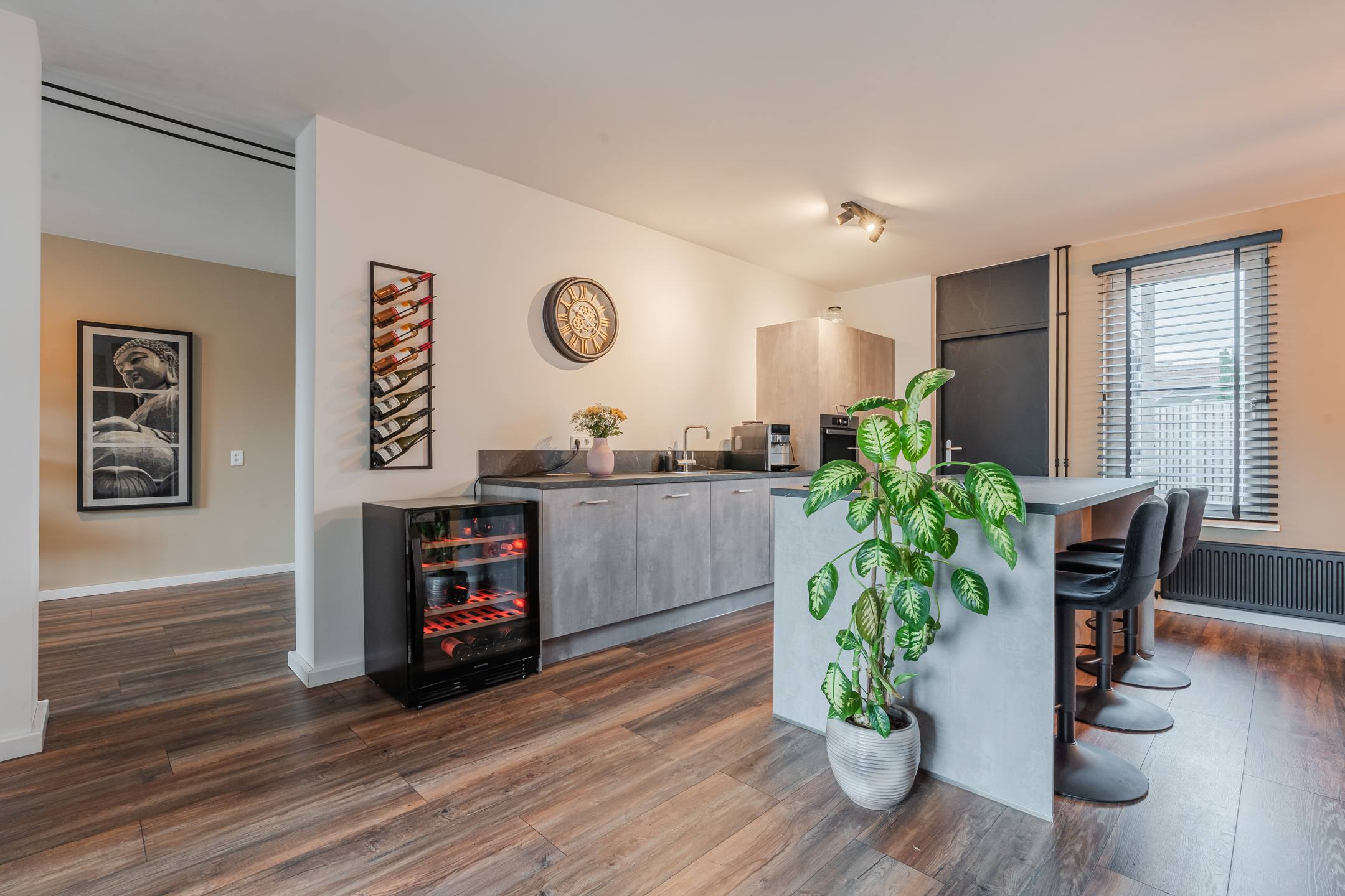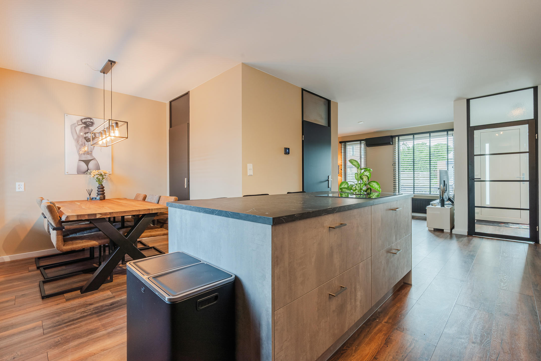 Entree met meterkast en toegang tot de gezellige woonkamer. Blikvanger hier is de moderne, recent vernieuwde keuken – een echte eyecatcher – compleet uitgerust met alle gewenste inbouwapparatuur zoals een Quooker, vaatwasser, koelkast, diepvries en een stijlvol kookeiland met Bora-inductiekookplaat. Daarnaast vind je op de begane grond een toilet, een slaapkamer/ kantoor, een badkamer met whirlpool, douche en wastafelmeubel, een praktische bijkeuken en een berging.