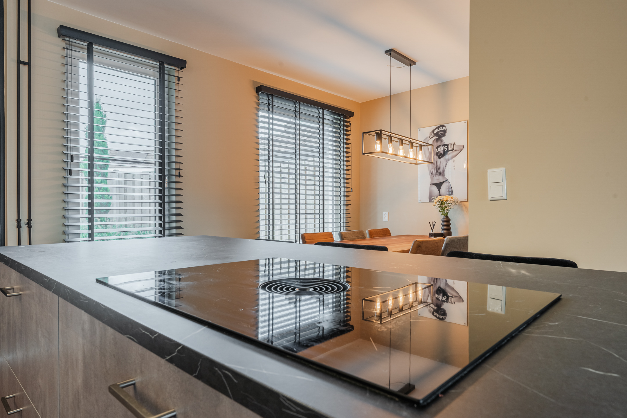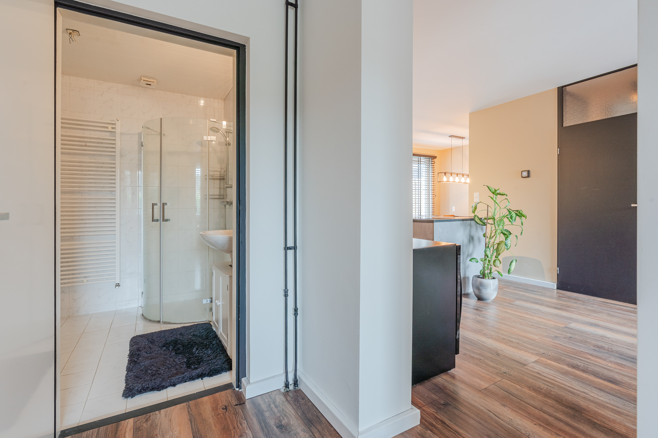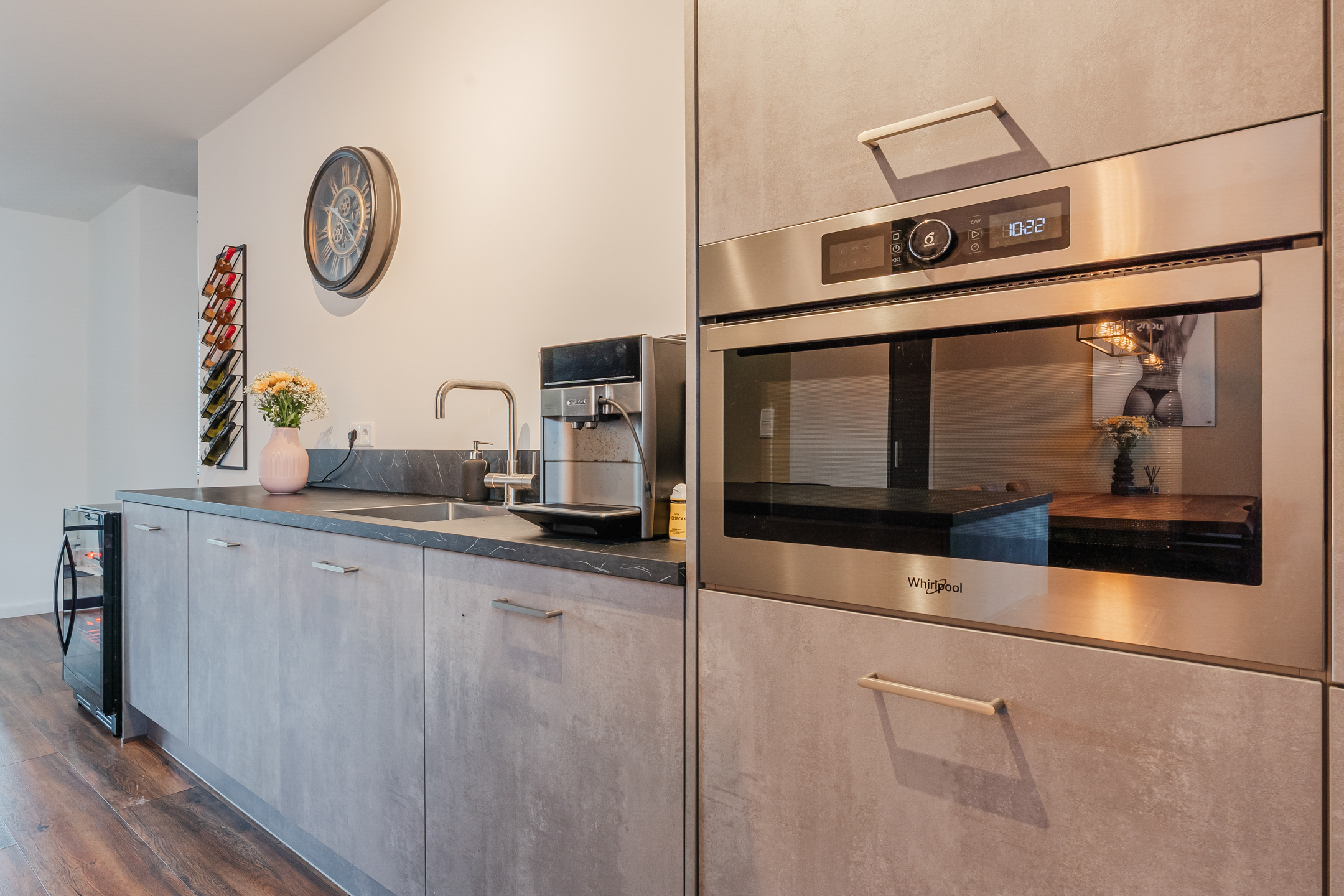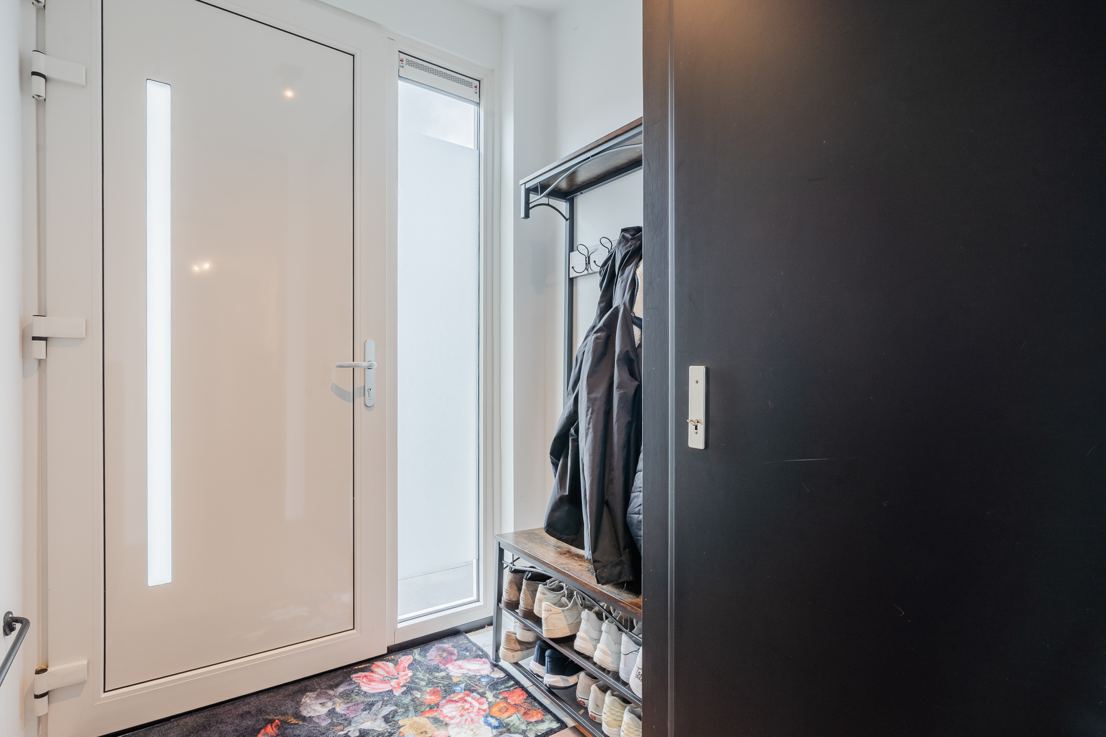 Entree met meterkast en toegang tot de gezellige woonkamer. Blikvanger hier is de moderne, recent vernieuwde keuken – een echte eyecatcher – compleet uitgerust met alle gewenste inbouwapparatuur zoals een Quooker, vaatwasser, koelkast, diepvries en een stijlvol kookeiland met Bora-inductiekookplaat. Daarnaast vind je op de begane grond een toilet, een slaapkamer/ kantoor, een badkamer met whirlpool, douche en wastafelmeubel, een praktische bijkeuken en een berging.
