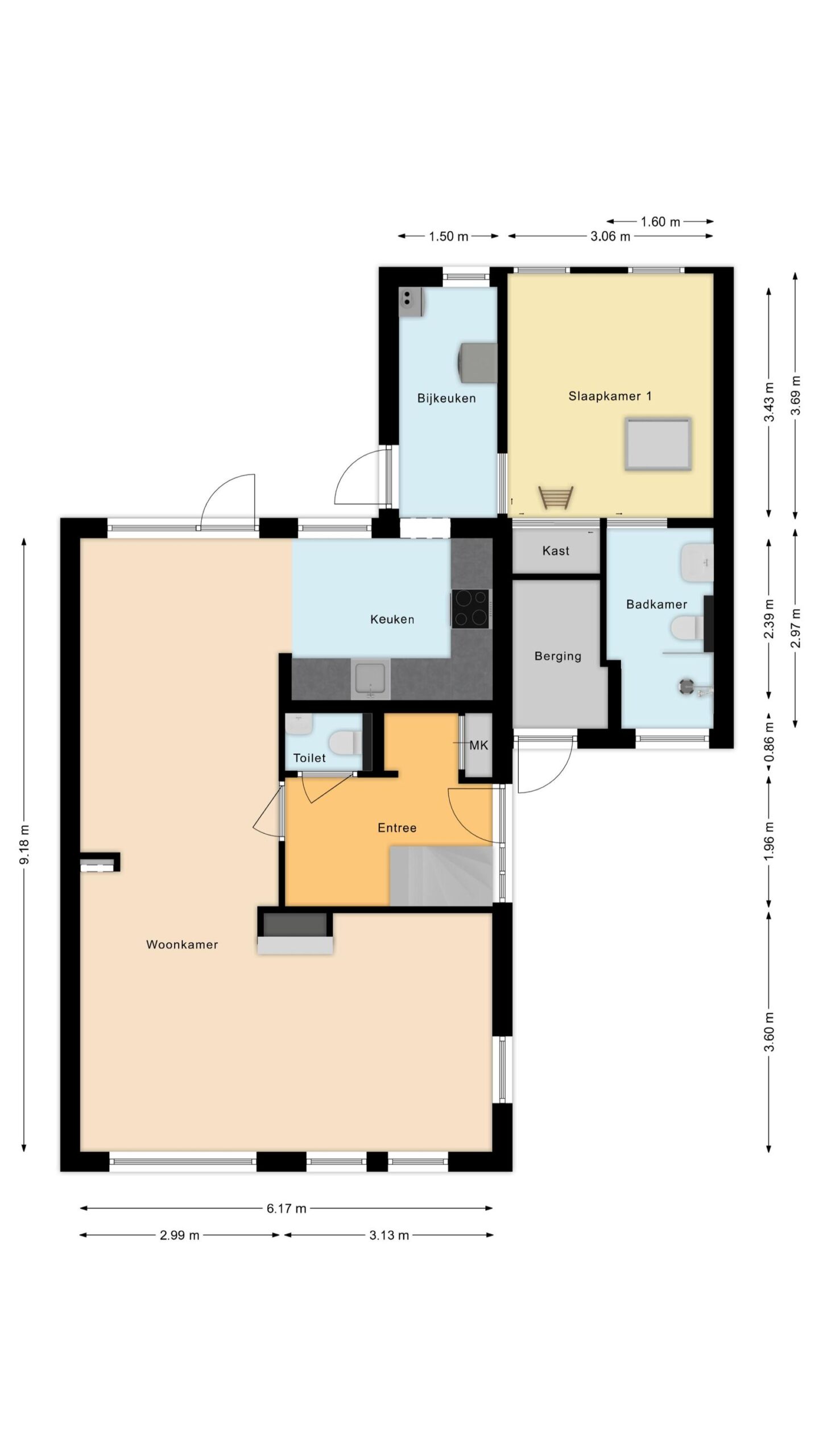 Ruime entree met meterkast, toilet en trapopgang, lichte woonkamer met een open keuken (2021), een fornuis voorzien van een 4 pits inductiekookplaat en een grote oven en een afzuigsysteem met koolstoffilter, bijkeuken met cv-ketel en witgoedopstelling, ruime slaapkamer met een vaste kast, toegang tot een bergzolder en een badkamer (2021) met een wastafelmeubel, toilet en inloopdouche.
