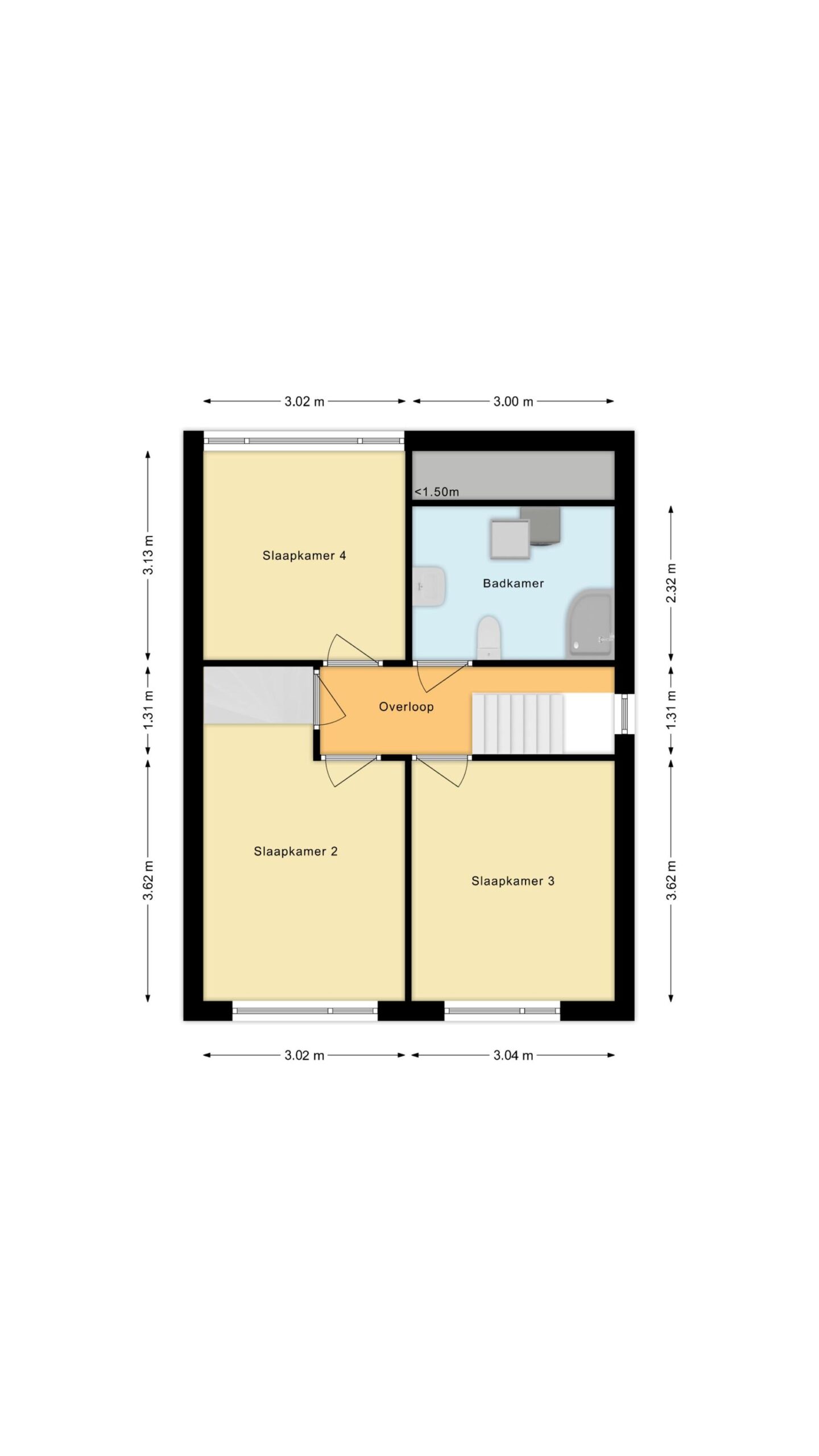 Overloop, 3 slaapkamers en een ruime badkamer met een bad, wastafelmeubel en toilet.