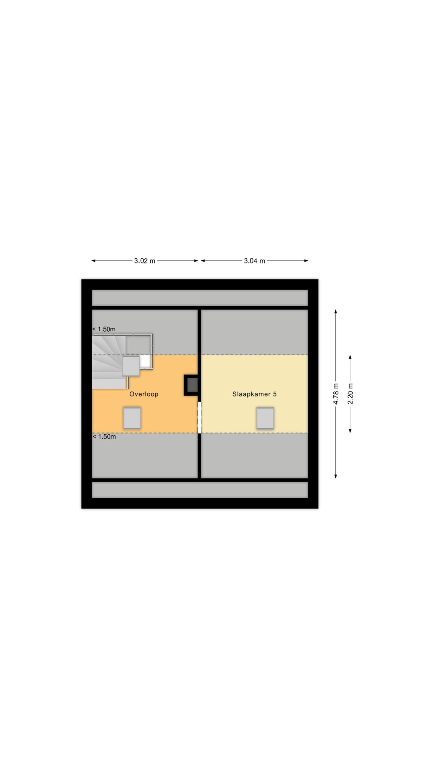 Middels vaste trap bereikbaar. Overloop en een doorgang naar de slaapkamer.